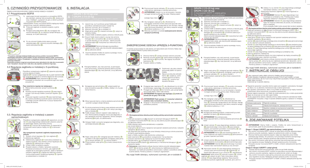 5. CZYNNOŚCI PRZYGOTOWAWCZE 6. INSTALACJA 17 16. Przymocować haczyk zatrzasku 17 do punktu mocowania uwięzi górnej, zalecanego w instrukcji samochodu. OSTRZEŻENIE! Zadbaj o to, by nie korzystać z haczyka na bagaż zamiast punktu górnej uwięzi. Obejrzyj pojazd Najpierw przeczytaj podrozdział z żądaną metodą instalacji w rozdziale 6. 5.1 Przygotowanie ISOFIX 01 1. Jeżeli pojazd nie jest wyposażony w prowadnice ISOFIX, jako standard, zacisnąć obie prowadnice 02 , dostarczone wraz z fotelikiem*, wycięciami do góry w dwóch punktach mocowania 01 ISOFIX pojazdu. WSKAZÓWKA: Punkty mocowania ISOFIX znajdują się między powierzchnią i oparciem siedzenia pojazdu. 2. Przesunąć zagłówek na siedzeniu pojazdu w górne położenie. 3. Pociągnij szarą pętlę tkaniny 03 , aby wyciągnąć oba ramiona blokujące 15 , aż usłyszysz dźwięk kliknięcia, co wskazuje, że w pełni zaskoczyły. 02 03 GRUPA 1 (9-18 kg) oraz GRUPA 2 (15-25 kg) A 13 14 15 05 04 15 4. Po obu stronach fotelika ściśnij zielony przycisk zabezpieczający 04 i czerwony przycisk zwalniający 05 , i wyjmij osłonę łącznika 06 . * Prowadnice ułatwiają instalację fotelika przy pomocy punktów mocowania ISOFIX i zapobiegają uszkodzeniu osłony fotelika. W razie nieużywania należy je wyjąć i przechować w bezpiecznym miejscu. W pojazdach z rozkładanym oparciem prowadnice należy wyjmować przed jego złożeniem. Ewentualne problemy mogą być powodowane przez zabrudzenie lub ciała obce na prowadnicach i haczykach. Usunąć brud i ciała obce, aby zapobiec problemom tego typu. 08 38 10 Pasy naramienne reguluje się następująco: 1. Maksymalnie poluzować uprząż 5-punktową 38 . Tył fotelika: 2. Wcisnąć przycisk regulatora wysokości 10 pasa naramiennego z tyłu skorupy fotelika i przechylić regulator 10 do siebie. 3. Przesuwać regulator wysokości 10 pasa naramiennego, aby wybrać prawidłową wysokość pasów naramiennych 08 i zwalniając przycisk zablokować w pozycji najodpowiedniejszej dla dziecka. 23 29 12 140826_ADVANSAFIX_PL.indd 1 Prawidłowo wyregulowany zagłówek 07 zapewnia to, że odcinek 11 pasa diagonalnego siedzenia jest ustawiony optymalnie zapewniając dziecku optymalną ochronę. Zagłówek 07 musi być tak wyregulowany, by zapewniał luz na szerokość dwóch palców między nim 07 a ramionami dziecka. 10. Włożyć języczek klamry w klamrę siedzenia samochodu 29 - powinien wystąpić dźwięk kliknięcia. 11. Po stronie przeciwnej do klamry pasa siedzenia samochodu obrócić dźwignię zaciskową 24 w dół i włożyć pas diagonalny w blokadę 25 . 12. Fotelik obciążyć własnym ciężarem ciała (uklęknąć na nim). Równocześnie pociągnąć mocno pas diagonalny w celu naprężenia (utrzymać naprężenie) i obrócić dźwignię zaciskową 24 do góry, do zablokowania. 5.3. Regulacja zagłówka w instalacji z pasem samochodowym Aby wyregulować wysokość zagłówka dopasowaną do dziecka: 1. Ścisnąć uchwyt regulujący 12 z tyłu zagłówka 07 . To odblokowuje zagłówek. 2. Odblokowany zagłówek 07 można teraz przestawić na żądaną wysokość. Gdy zwolnisz uchwyt regulacyjny 12 , zagłówek 07 zablokuje się w miejscu. 3. Umieść fotelik na siedzeniu pojazdu. 4. Posadzić dziecko w foteliku i sprawdzić wysokość. Powtarzać procedurę do momentu, gdy zagłówek 07 znajdzie się na optymalnej wysokości. Jeżeli w najniższym położeniu zagłówek 07 znajduje się nadal zbyt wysoko, można przeprowadzić dodatkową regulację 10 , zgodnie ze wskazówkami w rozdziale 5.2 08 11 21 13. Odciążyć fotelik i ponownie naciągnąć pas diagonalny, przy zamkniętej blokadzie 25 pasa. 25 17 16 14. Wyjąć uwięź górną 13 i odciągnąć języczek metalowy 16 od paska w celu jego przedłużenia, pociągnąć uwięź górną 13 za haczyk zatrzasku 17 , aż utworzy kształt V. 15. Przeprowadzać uwięź górną 13 po lewej i prawej stronie zagłówka. 04 8. Potrząśnij fotelikiem, aby mieć pewność, że jest bezpiecznie zamocowany, powtórnie sprawdź zielone przyciski zabezpieczające 04 , aby mieć pewność, że są całkowicie zielone 19 17 16 9. Wyjąć uwięź górną 13 i odciągnąć języczek metalowy 16 od paska w celu jego przedłużenia, pociągnąć uwięź górną 13 za haczyk zatrzasku 17 , aż utworzy kształt V. 10. Przeprowadzać uwięź górną 13 po lewej i prawej stronie zagłówka. 11. Przymocować haczyk zatrzasku 17 do punktu mocowania uwięzi górnej, zalecanego w instrukcji samochodu. OSTRZEŻENIE! Zadbaj o to, by nie korzystać z haczyka na bagaż zamiast punktu górnej uwięzi. Obejrzyj pojazd 17 szukając tego znaku: OSTRZEŻENIE! Paski uprzęży 27 muszą być ustawione możliwie nisko na biodrach dziecka. 8. Ściągnąć w dół poduszki naramienne 19 , aby zapewnić ich prawidłowe położenie. 12. Aby naciągnąć uwięź górną 13 , zlikwidować luz przeciągając swobodny koniec pasa przez języczek metalowy 16 , wyrównując naciąg pasa po obu stronach. Naciąg uwięzi górnej jest prawidłowy, gdy zielony wskaźnik naciągu 18 zostanie wydłużony o 1 cm. 1 cm 18 13. Posadzić dziecko w foteliku. 14. Wyciągnij pas siedzenia pojazdu i przeprowadź go przed dzieckiem do klamry 29 siedzenia pojazdu. Dla bezpieczeństwa dziecka przed każdą podróżą samochodem sprawdzać, czy... ►fotelik ► jest zaczepiony po obu stronach na ramionach blokujących ISOFIT 15 w punktach mocowania ISOFIX 01 oraz czy oba zielone przyciski zabezpieczające 04 są całkowicie zielone; ►fotelik ► dziecięcy jest pewnie zainstalowany w pojeździe. ►pas ► nie jest skręcony. ►uwięź ► górna 13 jest mocno naprężona nad oparciem siedzenia samochodu i wskaźnik naprężenia 18 jest zielony; ►pas ► diagonalny jest zaciśnięty tylko przez blokadę umieszczoną po stronie przeciwnej do klamry pasa siedzenia pojazdu. ►paski ► w foteliku są blisko ciała dziecka bez uciskania go; ►paski ► naramienne 08 są prawidł