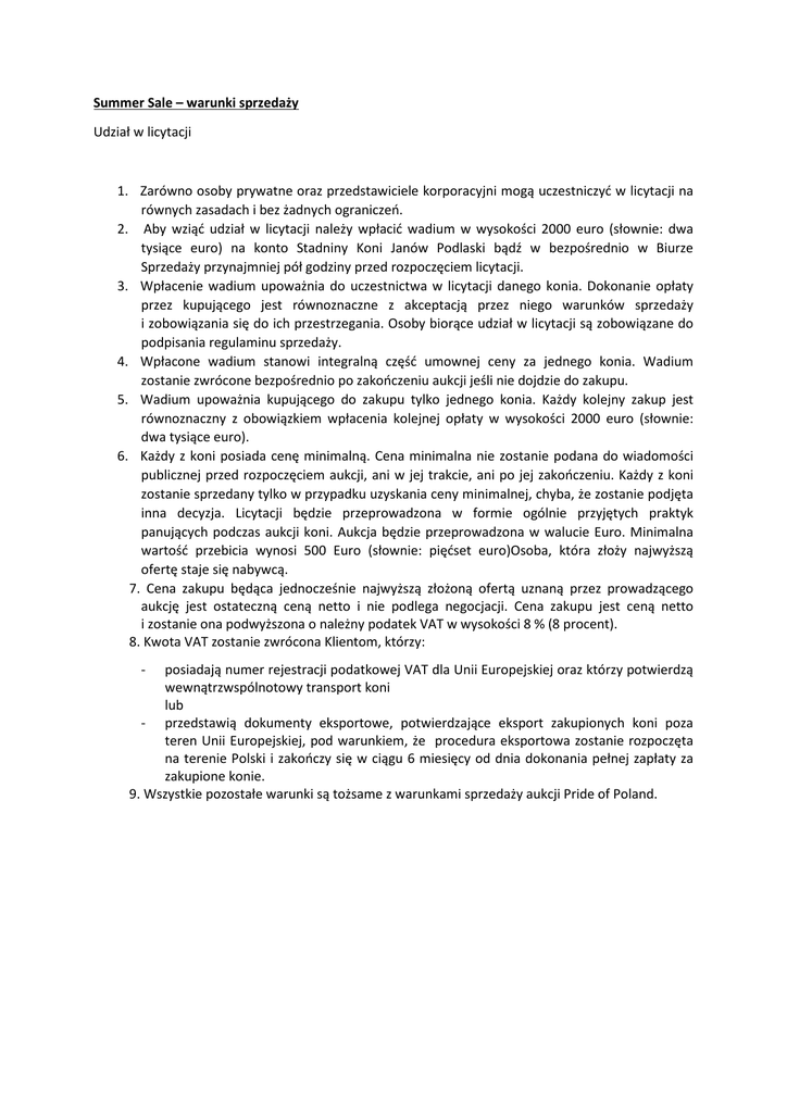 Summer Sale – warunki sprzedaży Udział w licytacji 1. Zarówno osoby prywatne oraz przedstawiciele korporacyjni mogą uczestniczyć w licytacji na równych zasadach i bez żadnych ograniczeń. 2. Aby wziąć udział w licytacji należy wpłacić wadium w wysokości 2000 euro (słownie: dwa tysiące euro) na konto Stadniny Koni Janów Podlaski bądź w bezpośrednio w Biurze Sprzedaży przynajmniej pół godziny przed rozpoczęciem licytacji. 3. Wpłacenie wadium upoważnia do uczestnictwa w licytacji danego konia. Dokonanie opłaty przez kupującego jest równoznaczne z akceptacją przez niego warunków sprzedaży i zobowiązania się do ich przestrzegania. Osoby biorące udział w licytacji są zobowiązane do podpisania regulaminu sprzedaży. 4. Wpłacone wadium stanowi integralną część umownej ceny za jednego konia. Wadium zostanie zwrócone bezpośrednio po zakończeniu aukcji jeśli nie dojdzie do zakupu. 5. Wadium upoważnia kupującego do zakupu tylko jednego konia. Każdy kolejny zakup jest równoznaczny z obowiązkiem wpłacenia kolejnej opłaty w wysokości 2000 euro (słownie: dwa tysiące euro). 6. Każdy z koni posiada cenę minimalną. Cena minimalna nie zostanie podana do wiadomości publicznej przed rozpoczęciem aukcji, ani w jej trakcie, ani po jej zakończeniu. Każdy z koni zostanie sprzedany tylko w przypadku uzyskania ceny minimalnej, chyba, że zostanie podjęta inna decyzja. Licytacji będzie przeprowadzona w formie ogólnie przyjętych praktyk panujących podczas aukcji koni. Aukcja będzie przeprowadzona w walucie Euro. Minimalna wartość przebicia wynosi 500 Euro (słownie: pięćset euro)Osoba, która złoży najwyższą ofertę staje się nabywcą. 7. Cena zakupu będąca jednocześnie najwyższą złożoną ofertą uznaną przez prowadzącego aukcję jest ostateczną ceną netto i nie podlega negocjacji. Cena zakupu jest ceną netto i zostanie ona podwyższona o należny podatek VAT w wysokości 8 % (8 procent). 8. Kwota VAT zostanie zwrócona Klientom, którzy: - posiadają numer rejestracji podatkowej VAT dla Unii Europejskiej oraz którzy potwierdzą wewnątrzwspólnotowy transport koni lub - przedstawią dokumenty eksportowe, potwierdzające eksport zakupionych koni poza teren Unii Europejskiej, pod warunkiem, że procedura eksportowa zostanie rozpoczęta na terenie Polski i zakończy się w ciągu 6 miesięcy od dnia dokonania pełnej zapłaty za zakupione konie. 9. Wszystkie pozostałe warunki są tożsame z warunkami sprzedaży aukcji Pride of Poland.