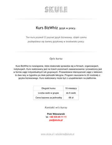 Kurs BizWhiz język w pracy. Ten kurs pozwoli Ci poznać język biznesowy, dzięki czemu pozbędziesz się bariery językowej w środowisku pracy. Opis kursu Kurs BizWhiz to rozwiązanie, które doskonale sprawdza się w firmach, organizacjach, instytucjach. Kurs realizowany jest na trzech poziomach zaawansowania i prowadzony jest w formie zajęć indywidualnych lub grupowych. Przewidziana intensywność zajęć z lektorem to dwa razy w tygodniu po dwie jednostki lekcyjne. Program nauczania to 22 rozdziały z języka biznesowego. Kurs realizowany może być z uzupełnieniem na platformie. Długość kursu 10 miesięcy Liczba osób w grupie do 6 osób Cena bazowa za jednostkę 68 zł Kontakt w/s kursu Piotr Wdowiarski tel. +48 535 05 11 11 [email protected] www.skule.pl | [email protected]