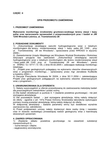 CZĘŚĆ II OPIS PRZEDMIOTU ZAMÓWIENIA 1. PRZEDMIOT ZAMÓWIENIA Wykonanie monitoringu środowiska gruntowo-wodnego terenu stacji i bazy paliw oraz opracowanie sprawozdań z przeprowadzonych prac i badań w JW 1245 Wrocław-Leśnica, ul. Trzmielowicka 28 2. POSIADANE DOKUMENTY 1) ,,Dokumentacja określająca warunki hydrogeologiczne wraz z lokalnym monitoringiem dla terenu modernizowanej stacji i bazy paliw JW. 1245 , przy ul. Trzmielowickiej 28 we Wrocławiu’’, opracowana przez WROGO w styczniu 2005r.; 2) Zawiadomienie Urzędu Miejskiego we Wrocławiu Wydział Środowiska i Rolnictwa dotyczące przyjęcia bez zastrzeżeń ,,Dokumentacji określającej warunki hydrogeologiczne wraz z lokalnym monitoringiem dla terenu modernizowanej stacji i bazy paliw JW. 1245 , przy ul. Trzmielowickiej 28 we Wrocławiu’’, pismo nr WŚRG / G / 0717 / 5 / 05, z dnia 05.02.2005 r. zalecające realizację monitoringu lokalnego; 3) ,,Projekt prac geologicznych polegający na wykonaniu otworów obserwacyjnych wraz z programem monitoringu…’ opracowany przez mgr Jarosława Kudłaciła w kwietniu 2004 r.; 4) Decyzja Prezydenta Wrocławia Nr 25/04, z dnia 30.11.2004 r. zatwierdzająca Projekt prac geologicznych polegających na wykonaniu otworów obserwacyjnych wraz z programem…’’. 3. UWARUNKOWANIA DLA OFERENTA 1) Należy wyszczególnić w ofercie przewidywaną do zastosowania metodykę badań dla poszczególnych wskaźników i podać normy. 2) Dla badań określonych w punkcie 4. 1 (badanie powietrza gruntowego) - nie jest wymagana akredytacja; 3) Dla pozostałych badań – jest wymagana akredytacja, którą należy dołączyć do oferty - zgodnie z art. 147a Prawa Ochrony Środowiska laboratoria wykonujące pomiary muszą posiadać akredytację, którą należy dołączyć do oferty. W dołączonej akredytacji - badane parametry winny być dodatkowo wyraźnie zaznaczone (np. zakreślone). 4) Przed podpisaniem umowy należy dostarczyć dane osoby (imię i nazwisko oraz nr dowodu osobistego) prowadzącej nadzór geologiczny wraz z kserokopią stosownych uprawnień. 4. ZAKRES OPRACOWANIA 1) Zbadanie składu powietrza ropopochodnych tj.: - suma benzyn i olejów; - węglowodory aromatyczne; gruntowego na zawartość substancji - wielopierścieniowe węglowodory aromatyczne, w trzech punktach usytuowanych poniżej pola zbiornikowego stacji i bazy paliw łącznie 6 punktów (3 poniżej stacji paliw i 3 poniżej bazy paliw) - 1 x w roku. 2) Zbadanie gruntu pobranego sondą, w zakresie analizy zawartości metali – Cd, Cr, Cu, Ni, Pb, Zn, w trzech punktach, usytuowanych poniżej pola zbiornikowego stacji i bazy paliw - łącznie 6 punktów ( 3 poniżej stacji paliw i 3 poniżej bazy paliw) 1 x w roku. 3) Badanie fizyko-chemiczne wody 1 x w roku. a)Analiza wody powierzchniowej ( ujście rowu W-1 do rowu By-15) pod względem: - mętność ( mg/dm3) - barwa (mg Pt/dm3) - zapach - odczyn pH - przewodność elektr. właściwa ( µS/ cm) - twardość ogólna (mg CaCO3/dm3) - chlorki (mg/dm3) - amoniak NNH4 ( mg/dm3) - azotany ( mg/dm3) - azotyny( mg/dm3) - siarczany( mg/dm3) - żelazo ogólne ( mg/dm3) - mangan ( mg/dm3) - WWA (µg/l) - węglowodory ropopochodne (mg/l) b)Analiza wody podziemnej w piezometrze P-2 ( baza paliw) pod względem: - mętność ( mg/dm3) - barwa (mg Pt/dm3) - zapach - odczyn pH - przewodność elektr. właściwa ( µS/ cm) - twardość ogólna (mg CaCO3/dm3) - chlorki (mg/dm3) - amoniak NNH4 ( mg/dm3) - azotany ( mg/dm3) - azotyny( mg/dm3) - siarczany( mg/dm3) - żelazo ogólne ( mg/dm3) - mangan ( mg/dm3) - WWA (µg/l) - węglowodory ropopochodne (mg/l) Dane piezometru P2: - głębokość: 2,5 m, - zabudowanie kolumny filtracyjnej – PCV o średnicy 75 mm, - warstwa wodonośna na głębokości 0,7 – 2,2 m p.p.t. - obudowa stalowa z zamykaną pokrywą o śr. 110 mm. 4) Zestawienie wyników wykonanych badań laboratoryjnych przedstawić w ,,Sprawozdaniu z monitoringu’’ zawierającym opis wszystkich przeprowadzonych badań. Wyniki należy porównać pod kątem zgodności z obowiązującymi aktami prawnymi na dzień wykonywania prób oraz przedstawić wnioski w zakresie proponowanej weryfikacji zakresu monitoringu. 5) Wykonawca wykona sprawozdanie z monitoringu zgodnie z obowiązującymi przepisami oraz zgodnie ze ,,Wskazówkami metodycznymi do oceny stopnia zanieczyszczenia gruntów i wód podziemnych produktami ropopochodnymi i innymi substancjami w procesach rekultywacji ’’( PIOŚ – Warszawa 1995 r . ). W badaniach należy stosować metodyki referencyjne analizy wyszczególnione w rozporządzeniu Ministra Środowiska z dnia 24.07.2006 r. w sprawie warunków, jakie należy spełnić przy wprowadzaniu ścieków do wód lub do ziemi, oraz w sprawie substancji szczególnie szkodliwych dla środowiska wodnego ( Dz. U. Nr 137, poz. 984 ), a w przypadku zmiany przepisów zgodnie z obowiązującymi na dzień wykonywania analiz przepisami oraz zgodnie z Polskimi Normami. 5. UWAGI KOŃCOWE 1) Termin wykonania badań należy uzgodnić na 7 dni przed ich rozpoczęciem z RZI oraz Wojskowym Oddziałem Gospodarczym Nr 2 we Wrocławiu. 2) Podstawą wypłacenia wynagrodzenia będzie protokół zdawczo – odbiorczy sporządzony po przyjęciu sprawozdania z badań. 3) Sprawozdanie z wykonanych badań winno być sporządzone w 4 egz. 4) W przypadku wprowadzenia zmian w obowiązujących przepisach prawnych pomiary winny być wykonane zgodnie ze stanem prawnym obowiązującym w dniu wykonywania pomiarów. 5) Badania należy przesłać za pismem przewodnim i dostarczyć w nieprzekraczalnym terminie do dnia 30.06.2015r. do siedziby Zamawiającego do kancelarii jawnej – ul. Obornicka 126, pokój 101. 6) Do dokumentacji dołączyć protokół poboru wszystkich prób. 7) Wszystkie prace należy prowadzić pod stałym nadzorem uprawnionego geologa. 6. TERMIN REALIZACJI ZAMÓWIENIA Termin realizacji zamówienia - przedstawienia sprawozdania z monitoringu - do dnia 30.06.2015r. Osoby do kontakt