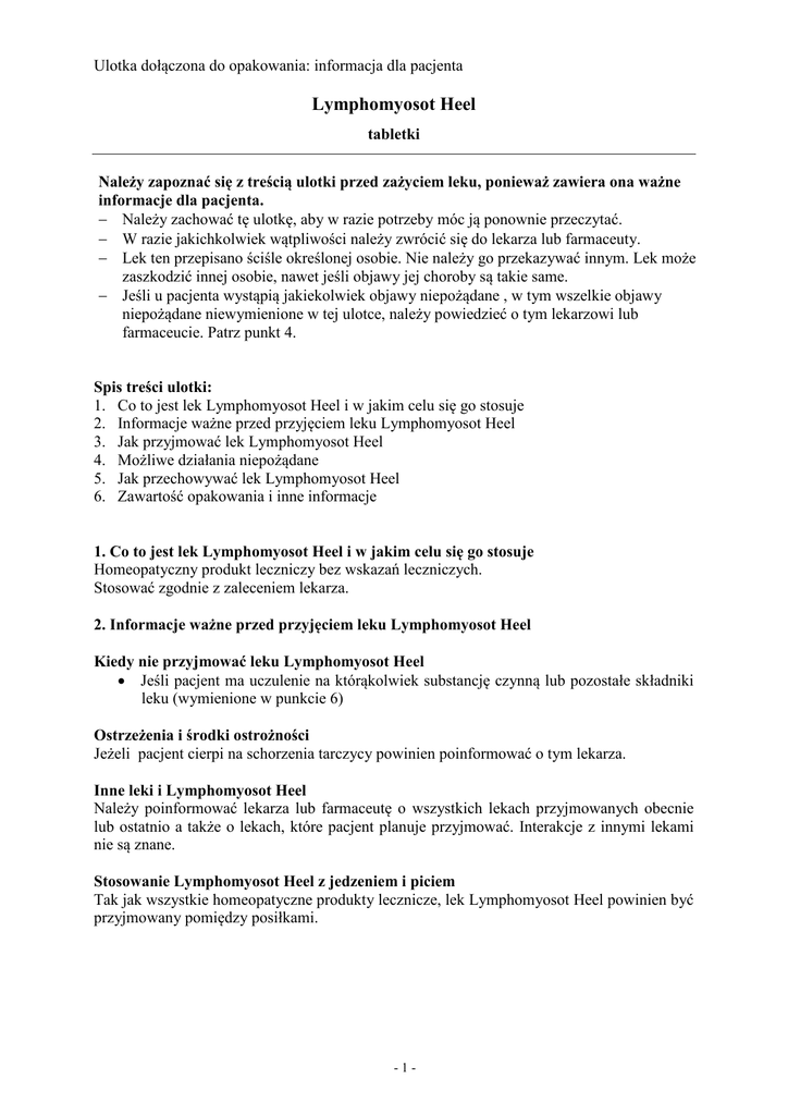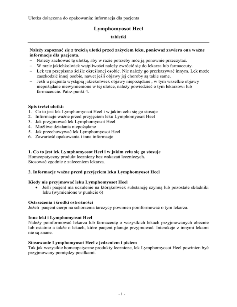 Ulotka dołączona do opakowania: informacja dla pacjenta Lymphomyosot Heel tabletki Należy zapoznać się z treścią ulotki przed zażyciem leku, ponieważ zawiera ona ważne informacje dla pacjenta. − Należy zachować tę ulotkę, aby w razie potrzeby móc ją ponownie przeczytać. − W razie jakichkolwiek wątpliwości należy zwrócić się do lekarza lub farmaceuty. − Lek ten przepisano ściśle określonej osobie. Nie należy go przekazywać innym. Lek może zaszkodzić innej osobie, nawet jeśli objawy jej choroby są takie same. − Jeśli u pacjenta wystąpią jakiekolwiek objawy niepożądane , w tym wszelkie objawy niepożądane niewymienione w tej ulotce, należy powiedzieć o tym lekarzowi lub farmaceucie. Patrz punkt 4. Spis treści ulotki: 1. Co to jest lek Lymphomyosot Heel i w jakim celu się go stosuje 2. Informacje ważne przed przyjęciem leku Lymphomyosot Heel 3. Jak przyjmować lek Lymphomyosot Heel 4. Możliwe działania niepożądane 5. Jak przechowywać lek Lymphomyosot Heel 6. Zawartość opakowania i inne informacje 1. Co to jest lek Lymphomyosot Heel i w jakim celu się go stosuje Homeopatyczny produkt leczniczy bez wskazań leczniczych. Stosować zgodnie z zaleceniem lekarza. 2. Informacje ważne przed przyjęciem leku Lymphomyosot Heel Kiedy nie przyjmować leku Lymphomyosot Heel • Jeśli pacjent ma uczulenie na którąkolwiek substancję czynną lub pozostałe składniki leku (wymienione w punkcie 6) Ostrzeżenia i środki ostrożności Jeżeli pacjent cierpi na schorzenia tarczycy powinien poinformować o tym lekarza. Inne leki i Lymphomyosot Heel Należy poinformować lekarza lub farmaceutę o wszystkich lekach przyjmowanych obecnie lub ostatnio a także o lekach, które pacjent planuje przyjmować. Interakcje z innymi lekami nie są znane. Stosowanie Lymphomyosot Heel z jedzeniem i piciem Tak jak wszystkie homeopatyczne produkty lecznicze, lek Lymphomyosot Heel powinien być przyjmowany pomiędzy posiłkami. -1- Ciąża, karmienie piersią i wpływ na płodność Jeśli pacjentka jest w ciąży lub karmi piersią, przypuszcza, że może być w ciąży lub gdy planuje mieć dziecko, powinna poradzić się lekarza lub farmaceuty przed zastosowaniem tego leku. Prowadzenie pojazdów i obsługiwanie maszyn Nie zanotowano wpływu produktu leczniczego na zdolność prowadzenia pojazdów i obsługiwanie maszyn. Lymphomyosot Heel zawiera laktozę Pacjenci, u których stwierdzono nietolerancję niektórych cukrów powinni skontaktować się z lekarzem przed zastosowaniem tego leku. 3. Jak przyjmować lek Lymphomyosot Heel Ten lek należy zawsze przyjmować zgodnie z zaleceniami lekarza. W razie wątpliwości należy zwrócić się do lekarza lub farmaceuty. Sposób stosowania Tabletkę należy powoli rozpuścić w ustach. W przypadku jeśli lekarz zaleci lek dziecku, tabletkę zaleca się rozkruszyć i rozpuścić w wodzie przed podaniem. Przyjęcie większej niż zalecana dawki leku Lymphomyosot Heel W razie przyjęcia większej niż zalecana dawki leku, należy zwrócić się do lekarza lub farmaceuty. Pominięcie przyjęcia dawki leku Lymphomyosot Heel Nie należy stosować dawki podwójnej w celu uzupełnienia pominiętej dawki. Przerwanie przyjmowania leku Lymphomyosot Heel W razie jakichkolwiek dalszych wątpliwości związanych ze stosowaniem tego leku należy zwrócić się do lekarza lub farmaceuty. 4. Możliwe działania niepożądane Jak każdy lek, Lymphomyosot Heel może powodować działania niepożądane, chociaż nie u każdego one wystąpią. Zgłaszanie działań niepożądanych Jeśli wystąpią jakiekolwiek objawy niepożądane, w tym wszelkie możliwe objawy niepożądane niewymienione w ulotce, należy powiedzieć o tym lekarzowi lub farmaceucie. Działania niepożądane można zgłaszać bezpośrednio do Departamentu Monitorowania Niepożądanych Działań Produktów Leczniczych Urzędu Rejestracji Produktów Leczniczych, Wyrobów Medycznych i Produktów Biobójczych ( Al. Jerozolimskie 181 C, 02-222 Warszawa, tel.: +48 22 49 21 301, faks: +48 22 49 21 309, e-mail: [email protected]). Działanie niepożądane można zgłaszać również podmiotowi odpowiedzialnemu. Dzięki zgłaszaniu działań niepożądanych można będzie zgromadzić więcej informacji na temat bezpieczeństwa stosowania leku. -2- 5. Jak przechowywać lek Lymphomyosot Heel Lek należy przechowywać w miejscu niewidocznym i niedostępnym dla dzieci. Lek ten nie ma specjalnych wymagań odnośnie warunków przechowywania. Nie należy stosować tego leku po upływie terminu ważności zamieszczonego na kartoniku po: Termin ważności. Termin ważności oznacza ostatni dzień danego miesiąca. Leków nie należy wyrzucać do kanalizacji ani domowych pojemników na odpadki. Należy zapytać farmaceutę jak usunąć leki, których się już nie używa. Takie postępowanie pomoże chronić środowisko. 6. Zawartość opakowania i inne informacje Co zawiera lek Lymphomyosot Heel Substancjami czynnymi w 1 tabletce leku Lymphomyosot Heel są: 15 mg Myosotis arvensis 15 mg Veronica officinalis 15 mg Teucrium scorodonia 15 mg Pinus sylvestris 15 mg Gentiana lutea 15 mg Equisetum hiemale 15 mg Smilax 15 mg Scrophularia nodosa 15 mg Juglans regia ssp.regia 15 mg Calcium phosphoricum 15 mg Natrium sulfuricum 15 mg Fumaria officinalis 15 mg Levothyroxinum 15 mg Araneus diadematus 30 mg Geranium robertianum 30 mg Nasturtium officinale 30 mg Ferrum iodatum D4 D4 D4 D4 D5 D4 D6 D4 D4 D12 D5 D4 D12 D6 D4 D4 D12 Ponadto lek zawiera: stearynian magnezu, laktozę. Jak wygląda lek Lymphomyosot Heel i co zawiera opakowanie Lek Lymphomyosot Heel jest w postaci okrągłych, płaskich tabletek. Tabletki są w kolorze białym do żółto-białego. Tabletki znajdują się w polipropylenowym pojemniku z wieczkiem, umieszczonym w pudełku tekturowym. Opakowanie zawiera 250 tabletek. Podmiot odpowiedzialny Heel Polska Sp. z o.o. ul. Poleczki 21 02-822 Warszawa tel. + 48(22) 545 07 15 e-mail:[em