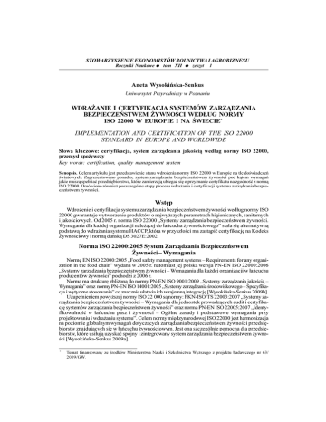 Wdra¿anie i certyfikacja systemów zarz¹dzannia bezpieczeñstwem ¿ywnoci... STOWARZYSZENIE EKONOMISTÓW ROLNICTWA I AGROBIZNESU Roczniki Naukowe l tom XII l zeszyt 1 281 Aneta Wysokiñska-Senkus Uniwersytet Przyrodniczy w Poznaniu WDRA¯ANIE I CERTYFIKACJA SYSTEMÓW ZARZ¥DZANIA BEZPIECZEÑSTWEM ¯YWNOCI WED£UG NORMY ISO 22000 W EUROPIE I NA WIECIE* IMPLEMENTATION AND CERTIFICATION OF THE ISO 22000 STANDARD IN EUROPE AND WORLDWIDE S³owa kluczowe: certyfikacja, system zarz¹dzania jakoci¹ wed³ug normy ISO 22000, przemys³ spo¿ywczy Key words: certification, quality management system Synopsis. Celem artyku³u jest przedstawienie stanu wdro¿enia normy ISO 22000 w Europie na tle dowiadczeñ wiatowych. Zaprezentowano ponadto, system zarz¹dzania bezpieczeñstwem ¿ywnoci pod k¹tem wymagañ jakie musz¹ spe³niaæ przedsiêbiorstwa, które zamierzaj¹ ubiegaæ siê o przyznanie certyfikatu na zgodnoæ z norm¹ ISO 22000. Omówiono równie¿ poszczególne etapy procesu wdra¿ania i certyfikacji systemu zarz¹dzania bezpieczeñstwem ¿ywnoci. Wstêp Wdro¿enie i certyfikacja systemu zarz¹dzania bezpieczeñstwem ¿ywnoci wed³ug normy ISO 22000 gwarantuje wytworzenie produktów o najwy¿szych parametrach higienicznych, sanitarnych i jakociowych. Od 2005 r. norma ISO 22000 Systemy zarz¹dzania bezpieczeñstwem ¿ywnoci. Wymagania dla ka¿dej organizacji nale¿¹cej do ³añcucha ¿ywnociowego sta³a siê alternatywn¹ podstaw¹ do wdra¿ania systemu HACCP, która w przysz³oci ma zast¹piæ certyfikacjê na Kodeks ¯ywnociowy i norm¹ duñsk¹ DS 3027E:2002. Norma ISO 22000:2005 System Zarz¹dzania Bezpieczeñstwem ¯ywnoci Wymagania Normê EN ISO 22000:2005 Food safety management systems Requirements for any organization in the food chain wydana w 2005 r. natomiast jej polska wersja PN-EN ISO 22000:2006 Systemy zarz¹dzania bezpieczeñstwem ¿ywnoci Wymagania dla ka¿dej organizacji w ³añcuchu producentów ¿ywnoci pochodzi z 2006 r. Norma ma strukturê zbli¿on¹ do normy PN-EN ISO 9001:2009 Systemy zarz¹dzania jakoci¹ Wymagania oraz normy PN-EN ISO 14001:2005 Systemy zarz¹dzania rodowiskowego Specyfikacja i wytyczne stosowania co znacznie u³atwia ich wzajemn¹ integracjê [Wysokiñska-Senkus 2009b]. Uzupe³nieniem powy¿szej normy ISO 22 000 s¹ normy: PKN-ISO/TS 22003:2007 Systemy zarz¹dzania bezpieczeñstwem ¿ywnoci Wymagania dla jednostek prowadz¹cych audit i certyfikacjê systemów zarz¹dzania bezpieczeñstwem ¿ywnoci oraz norma PN-EN ISO 22005:2007 Identyfikowalnoæ w ³añcuchu pasz i ¿ywnoci Ogólne zasady i podstawowe wymagania przy projektowaniu i wdra¿aniu systemu. Celem normy miêdzynarodowej ISO 22000 jest harmonizacja na poziomie globalnym wymagañ dotycz¹cych zarz¹dzania bezpieczeñstwem ¿ywnoci przedsiêbiorstw znajduj¹cych siê w ³añcuchu ¿ywnociowym. Jest ona szczególnie pomocna dla przedsiêbiorstw, które usi³uj¹ uzyskaæ spójny i zintegrowany system zarz¹dzania bezpieczeñstwem ¿ywnoci [Wysokiñska-Senkus 2009a]. * Temat finansowany ze rodków Ministerstwa Nauki i Szkolnictwa Wy¿szego z projektu badawczego nr 63/ 2009/GW. 282 Aneta Wysokiñska-Senkus Norma miêdzynarodowa okrela wymagania dotycz¹ce systemu zarz¹dzania bezpieczeñstwem ¿ywnoci dla organizacji w ³añcuchu producentów ¿ywnoci, która musi wykazaæ zdolnoæ do nadzorowania zagro¿eñ dla bezpieczeñstwa ¿ywnoci w celu zapewnienia, ¿e ¿ywnoæ jest bezpieczna dla ludzi. Norma ISO 22000 definiuje bezpieczeñstwo ¿ywnoci jako: koncepcjê polegaj¹ca na tym, ¿e ¿ywnoæ nie wyrz¹dzi szkody konsumentowi, jeli jest przygotowywana i/lub spo¿ywana zgodnie z zastosowaniem. Wed³ug normy ISO 22000 organizacja powinna ustanowiæ, udokumentowaæ, wdro¿yæ i utrzymywaæ skuteczny, system zarz¹dzania bezpieczeñstwem ¿ywnoci i aktualizowaæ w razie koniecznoci zgodnie z wymaganiami niniejszej normy miêdzynarodowej [Marvin i in. 2009]. Dokumentacja systemu zarz¹dzania bezpieczeñstwem ¿ywnoci powinna zawieraæ: udokumentowane deklaracje polityki bezpieczeñstwa ¿ywnoci i zwi¹zanych z ni¹ celów, udokumentowane procedury i zapisy wymagane przez normê, dokumenty niezbêdne organizacji do zapewnienia skutecznego rozwoju, wdra¿ania i aktualizowania systemu zarz¹dzania bezpieczeñstwem ¿ywnoci. Najwy¿sze kierownictwo powinno dostarczyæ dowodu swojego zaanga¿owania w tworzenie i wdro¿enie systemu zarz¹dzania bezpieczeñstwem ¿ywnoci oraz w ci¹g³e doskonalenie jego skutecznoci przez wiele dzia³añ m.in.: okrelenie, udokumentowanie i zakomunikowanie polityki bezpieczeñstwa ¿ywnoci organizacji. Bardzo wa¿nym etapem niezbêdnym przy procesie wdra¿ania systemu zarz¹dzania jakoci¹ ¿ywnoci jest w³aciwe zaplanowanie wszystkich dzia³añ prowadz¹cych do wytworzenia produktów o najwy¿szych parametrach higienicznych oraz jakociowych. Wed³ug normy ISO 22000 najwy¿sze kierownictwo organizacji powinno dokonaæ podzia³u odpowiedzialnoci za dzia³ania zwi¹zane z wdro¿eniem, funkcjonowaniem oraz doskonaleniem systemu jakoci w przedsiêbiorstwie oraz wyznaczyæ cz³onka kierownictwa, który bêdzie odpowiedzialny za nadzór nad wszystkimi procesami zwi¹zanymi z zapewnieniem bezpieczeñstwa ¿ywnoci. Kierownictwo przedsiêbiorstwa musi opracowaæ procedury zarz¹dzania potencjalnymi sytuacjami awaryjnymi i wypadkami oraz przeprowadzaæ regularny przegl¹d systemu zarz¹dzania bezpieczeñstwem ¿ywnoci organizacji. Zarz¹dzanie zasobami obejmuje zapewnienie zasobów, które s¹ niezbêdne do ustanowienia, wdro¿enia oraz utrzymania systemu zapewnienia bezpieczeñstwa zdrowotnego ¿ywnoci. Du¿¹ rolê odgrywaj¹ zasoby ludzkie (kompetencje, wiadomoæ, szkolenie), infrastruktura oraz rodowisko pracy [Sperber 2005]. Proces wdro¿eniowy systemu zarz¹dzania jakoci¹ w przemyle spo¿ywczym Rozpoczêcie procesu wdro¿eniowego powinno byæ poprzedzone wydaniem zarz¹dzenia przez naczelne kierownictwo przedsiêbiorstwa. Rozporz¹dzenie stanowi formalne potwierdzenie podj