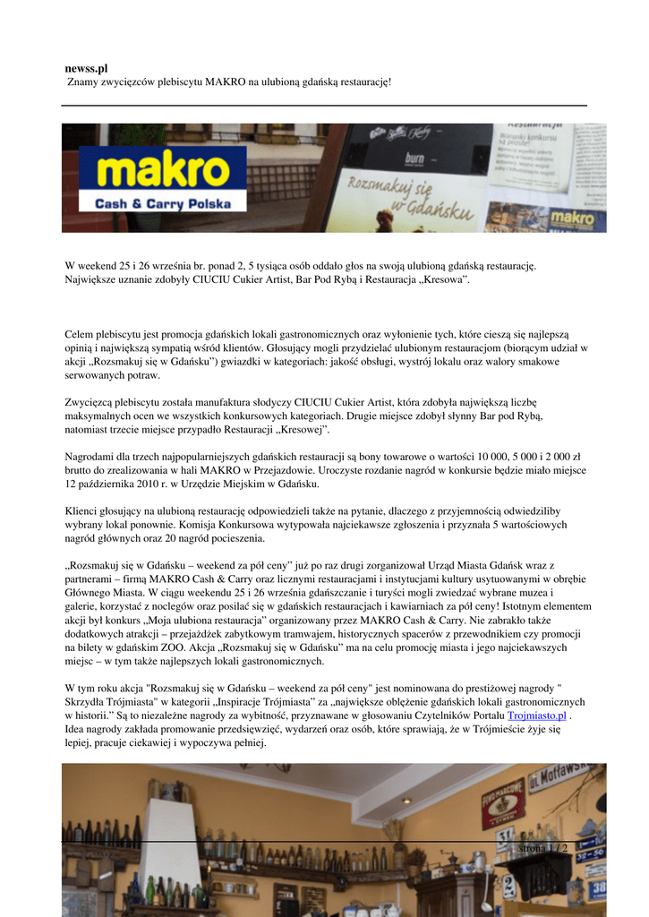 newss.pl Znamy zwycięzców plebiscytu MAKRO na ulubioną gdańską restaurację! W weekend 25 i 26 września br. ponad 2, 5 tysiąca osób oddało głos na swoją ulubioną gdańską restaurację. Największe uznanie zdobyły CIUCIU Cukier Artist, Bar Pod Rybą i Restauracja „Kresowa”. Celem plebiscytu jest promocja gdańskich lokali gastronomicznych oraz wyłonienie tych, które cieszą się najlepszą opinią i największą sympatią wśród klientów. Głosujący mogli przydzielać ulubionym restauracjom (biorącym udział w akcji „Rozsmakuj się w Gdańsku”) gwiazdki w kategoriach: jakość obsługi, wystrój lokalu oraz walory smakowe serwowanych potraw. Zwycięzcą plebiscytu została manufaktura słodyczy CIUCIU Cukier Artist, która zdobyła największą liczbę maksymalnych ocen we wszystkich konkursowych kategoriach. Drugie miejsce zdobył słynny Bar pod Rybą, natomiast trzecie miejsce przypadło Restauracji „Kresowej”. Nagrodami dla trzech najpopularniejszych gdańskich restauracji są bony towarowe o wartości 10 000, 5 000 i 2 000 zł brutto do zrealizowania w hali MAKRO w Przejazdowie. Uroczyste rozdanie nagród w konkursie będzie miało miejsce 12 października 2010 r. w Urzędzie Miejskim w Gdańsku. Klienci głosujący na ulubioną restaurację odpowiedzieli także na pytanie, dlaczego z przyjemnością odwiedziliby wybrany lokal ponownie. Komisja Konkursowa wytypowała najciekawsze zgłoszenia i przyznała 5 wartościowych nagród głównych oraz 20 nagród pocieszenia. „Rozsmakuj się w Gdańsku – weekend za pół ceny” już po raz drugi zorganizował Urząd Miasta Gdańsk wraz z partnerami – firmą MAKRO Cash & Carry oraz licznymi restauracjami i instytucjami kultury usytuowanymi w obrębie Głównego Miasta. W ciągu weekendu 25 i 26 września gdańszczanie i turyści mogli zwiedzać wybrane muzea i galerie, korzystać z noclegów oraz posilać się w gdańskich restauracjach i kawiarniach za pół ceny! Istotnym elementem akcji był konkurs „Moja ulubiona restauracja” organizowany przez MAKRO Cash & Carry. Nie zabrakło także dodatkowych atrakcji – przejażdżek zabytkowym tramwajem, historycznych spacerów z przewodnikiem czy promocji na bilety w gdańskim ZOO. Akcja „Rozsmakuj się w Gdańsku” ma na celu promocję miasta i jego najciekawszych miejsc – w tym także najlepszych lokali gastronomicznych. W tym roku akcja "Rozsmakuj się w Gdańsku – weekend za pół ceny" jest nominowana do prestiżowej nagrody " Skrzydła Trójmiasta" w kategorii „Inspiracje Trójmiasta” za „największe oblężenie gdańskich lokali gastronomicznych w historii.” Są to niezależne nagrody za wybitność, przyznawane w głosowaniu Czytelników Portalu Trojmiasto.pl . Idea nagrody zakłada promowanie przedsięwzięć, wydarzeń oraz osób, które sprawiają, że w Trójmieście żyje się lepiej, pracuje ciekawiej i wypoczywa pełniej. strona 1 / 2 newss.pl Znamy zwycięzców plebiscytu MAKRO na ulubioną gdańską restaurację! MAKRO Cash & Carry jest liderem w branży samoobsługowego handlu hurtowego. Usługi firmy, skierowane przede wszystkim do przedsiębiorców, obejmują zarówno kompleksowe zaopatrzenie, jak i nowoczesne rozwiązania biznesowe. W MAKRO klienci znajdą pod jednym dachem artykuły spożywcze i przemysłowe w szerokim wyborze, doskonałej jakości i przystępnych cenach – jedna nowoczesna hala to odpowiednik 50 hurtowni branżowych. Do dyspozycji kupujących są także usługi dodatkowe – m.in. doradztwo biznesowe czy szkolenia gastronomiczne – które skupiają się wokół nowoczesnego MAKRO Centrum Rozwoju Firm w Warszawie. W Polsce MAKRO Cash & Carry istnieje od 15 lat; posiada obecnie 29 hal. Łączna powierzchnia sprzedaży hurtowej wynosi ponad 269 000 m2. MAKRO Cash & Carry zatrudnia w Polsce około 7,5 tys. osób. Więcej informacji o MAKRO można znaleźć na stronie www.makro.pl METRO/MAKRO Cash & Carry działa w 30 krajach świata. Firma jest właścicielem ponad 600 hal samoobsługowego handlu hurtowego, zatrudnia ponad 100 000 pracowników na całym świecie, a w 2008 roku osiągnęła obrót w wysokości 33,1 miliardów Euro. METRO/MAKRO Cash & Carry jest siecią dystrybucyjną koncernu METRO Group, jednej z największych firm w branży handlowej na świecie. W 2008 roku obrót METRO Group wyniósł ponad 68 miliardy Euro. Firma ta zarządza 2100 obiektami handlowymi w 32 krajach świata oraz zatrudnia 290 tys. pracowników. W skład METRO Group wchodzą niezależnie działające sieci – poza METRO/MAKRO Cash & Carry są to: Real (hipermarkety), Media Markt oraz Saturn (liderzy wśród europejskich centrów z elektroniką użytkową) i Galerie Kaufhof (domy handlowe). Więcej informacji można znaleźć na stronie www.metrogroup.de . MAKRO Cash & Carry WIĘCEJ INFORMACJI MAKRO Cash & Carry Polska (PRESS BOX) strona 2 / 2