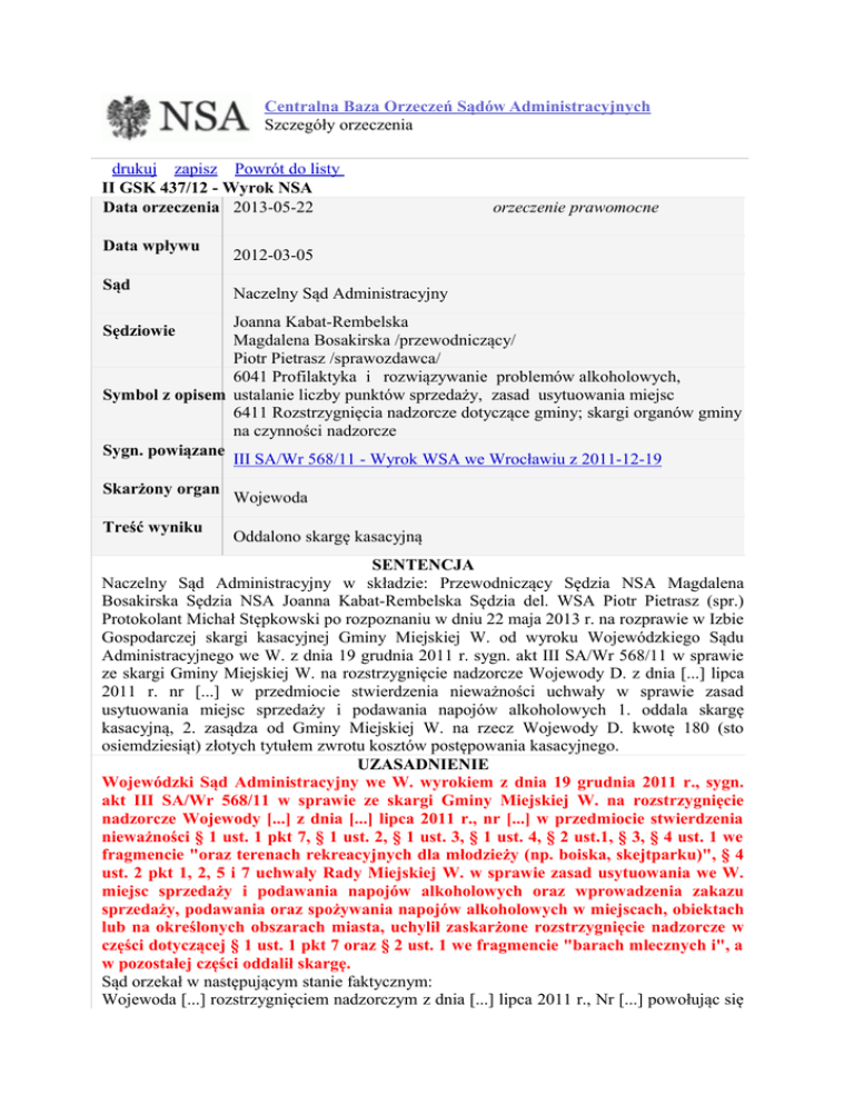 Centralna Baza Orzeczeń Sądów Administracyjnych Szczegóły orzeczenia drukuj zapisz Powrót do listy II GSK 437/12 - Wyrok NSA Data orzeczenia 2013-05-22 Data wpływu Sąd orzeczenie prawomocne 2012-03-05 Naczelny Sąd Administracyjny Joanna Kabat-Rembelska Magdalena Bosakirska /przewodniczący/ Piotr Pietrasz /sprawozdawca/ 6041 Profilaktyka i rozwiązywanie problemów alkoholowych, Symbol z opisem ustalanie liczby punktów sprzedaży, zasad usytuowania miejsc 6411 Rozstrzygnięcia nadzorcze dotyczące gminy; skargi organów gminy na czynności nadzorcze Sygn. powiązane III SA/Wr 568/11 - Wyrok WSA we Wrocławiu z 2011-12-19 Sędziowie Skarżony organ Treść wyniku Wojewoda Oddalono skargę kasacyjną SENTENCJA Naczelny Sąd Administracyjny w składzie: Przewodniczący Sędzia NSA Magdalena Bosakirska Sędzia NSA Joanna Kabat-Rembelska Sędzia del. WSA Piotr Pietrasz (spr.) Protokolant Michał Stępkowski po rozpoznaniu w dniu 22 maja 2013 r. na rozprawie w Izbie Gospodarczej skargi kasacyjnej Gminy Miejskiej W. od wyroku Wojewódzkiego Sądu Administracyjnego we W. z dnia 19 grudnia 2011 r. sygn. akt III SA/Wr 568/11 w sprawie ze skargi Gminy Miejskiej W. na rozstrzygnięcie nadzorcze Wojewody D. z dnia [...] lipca 2011 r. nr [...] w przedmiocie stwierdzenia nieważności uchwały w sprawie zasad usytuowania miejsc sprzedaży i podawania napojów alkoholowych 1. oddala skargę kasacyjną, 2. zasądza od Gminy Miejskiej W. na rzecz Wojewody D. kwotę 180 (sto osiemdziesiąt) złotych tytułem zwrotu kosztów postępowania kasacyjnego. UZASADNIENIE Wojewódzki Sąd Administracyjny we W. wyrokiem z dnia 19 grudnia 2011 r., sygn. akt III SA/Wr 568/11 w sprawie ze skargi Gminy Miejskiej W. na rozstrzygnięcie nadzorcze Wojewody [...] z dnia [...] lipca 2011 r., nr [...] w przedmiocie stwierdzenia nieważności § 1 ust. 1 pkt 7, § 1 ust. 2, § 1 ust. 3, § 1 ust. 4, § 2 ust.1, § 3, § 4 ust. 1 we fragmencie "oraz terenach rekreacyjnych dla młodzieży (np. boiska, skejtparku)", § 4 ust. 2 pkt 1, 2, 5 i 7 uchwały Rady Miejskiej W. w sprawie zasad usytuowania we W. miejsc sprzedaży i podawania napojów alkoholowych oraz wprowadzenia zakazu sprzedaży, podawania oraz spożywania napojów alkoholowych w miejscach, obiektach lub na określonych obszarach miasta, uchylił zaskarżone rozstrzygnięcie nadzorcze w części dotyczącej § 1 ust. 1 pkt 7 oraz § 2 ust. 1 we fragmencie "barach mlecznych i", a w pozostałej części oddalił skargę. Sąd orzekał w następującym stanie faktycznym: Wojewoda [...] rozstrzygnięciem nadzorczym z dnia [...] lipca 2011 r., Nr [...] powołując się na art. 91 ust. 1 ustawy z dnia 8 marca 1990 r. o samorządzie gminnym (t.j. Dz. U. z 2001 r. Nr 142, poz. 1591 ze zm.) stwierdził nieważność: § 1 ust. 1 pkt 7, § 1 ust. 2, § 1 ust. 3, § 1 ust. 4, § 2 ust. 1, § 3, § 4 ust. 1 we fragmencie: "oraz terenach rekreacyjnych dla młodzieży (np. boiska, skejtparki)", § 4 ust. 2 pkt 1,2, 5, 6 i 7 uchwały Nr [...] Rady Miejskiej W. z dnia [...] lipca 2011 r. w sprawie zasad usytuowania we W. miejsc sprzedaży i podawania napojów alkoholowych oraz wprowadzenia zakazu sprzedaży, podawania oraz spożywania napojów alkoholowych w miejscach, obiektach lub na określonych obszarach miasta. W uzasadnieniu rozstrzygnięcia nadzorczego wojewoda stwierdził podjęcie zakwestionowanych przepisów uchwały: - § 1 ust. 2, ust. 3 i ust. 4 z istotnym naruszeniem art. 12 ust. 2 ustawy z dnia 26 października 1982 r. o wychowaniu w trzeźwości i przeciwdziałaniu alkoholizmowi (t.j. Dz. U. z 2007 r. Nr 70, poz. 473 ze zm., zwanej także: u.w.t.), - § 1 ust. 1 pkt 7, § 2 ust. 1, § 4 ust. 1 we fragmencie: "oraz terenach rekreacyjnych dla młodzieży (np. boiska, skejtparki), § 4 ust. 2 pkt 1, 5 i 6 z istotnym naruszeniem art. 14 ust. 6 u.w.t. w zw. z art. 2 Konstytucji Rzeczypospolitej Polskiej z dnia 2 kwietnia 1997 r. (Dz. U. Nr 78, poz. 483 ze zm.), - § 3 z istotnym naruszeniem art. 14 ust. 6 u.w.t. oraz art. XII § 1 ustawy z dnia 26 czerwca 1974 r. Przepisy wprowadzające Kodeks pracy (Dz. U. Nr 24, poz. 142 ze zm.) w zw. z art. 6 ust. 1 ustawy z dnia 2 lipca 2004 r. o swobodzie działalności gospodarczej (t.j. Dz. U. z 2010 r. Nr 220, poz. 1447 ze zm.) oraz art. 20 i art. 32 Konstytucji Rzeczypospolitej Polskiej, - § 4 ust. 2 pkt 2 i pkt 7 z istotnym naruszeniem art. 14 ust. 6 u.w.t. Wojewoda odnosząc się do postanowień § 1 ust. 1 pkt 7 uchwały wskazał, że zgodnie z tą regulacją: "Nie dopuszcza się usytuowania miejsc stałej sprzedaży i podawania napojów alkoholowych w najbliższej okolicy następujących obiektów i miejsc: 7) przystanków początkowych i końcowych (tzw. pętli) tramwajowych i autobusowych komunikacji miejskiej." Na mocy § 2 ust. 1: "Wprowadza się zakaz sprzedaży, podawania i spożywania napojów alkoholowych w barach mlecznych i jadłodajniach." Według § 4 ust. 1 uchwały: "Wprowadza się zakaz spożywania napojów alkoholowych na ogólnodostępnych placach zabaw dla dzieci oraz terenach rekreacyjnych dla młodzieży (np. boiska, skejtparki)." W § 4 ust. 2 pkt 1, 5 i 6 uchwały wprowadzono zakaz spożywania, poza miejscami do tego wyznaczonymi, napojów alkoholowych na obszarze nadrzecznych traktów spacerowych (pkt 1), na podwórkach i we wnętrzach międzyblokowych (pkt 5), na ogólnodostępnych częściach wspólnych budynków mieszkalnych (pkt 6). Powyższym fragmentom uchwały wojewoda zarzucił naruszenie zasady pewności prawa wynikającej z art. 2 Konstytucji. Uchwała jest bowiem w tym przedmiocie nieprecyzyjna i stwarza problemy interpretacyjne. W ocenie wojewody normy stanowione przez prawodawcę powinny być sformułowane w sposób jasny, precyzyjny i jednoznaczny. Taki wymóg stawiany powinien być w szczególności aktom prawa miejscowego, gdyż stanowią prawo powszechnie obowiązujące na terenie działania organów, które je ustanowiły. Organ nadzoru podniósł, że w piśmie z dnia 19 lipc