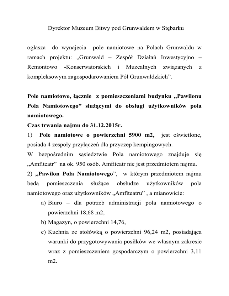Dyrektor Muzeum Bitwy pod Grunwaldem w Stębarku ogłasza do wynajęcia pole namiotowe na Polach Grunwaldu w ramach projektu: „Grunwald – Zespół Działań Inwestycyjno – Remontowo -Konserwatorskich i Muzealnych związanych z kompleksowym zagospodarowaniem Pól Grunwaldzkich”. Pole namiotowe, łącznie z pomieszczeniami budynku „Pawilonu Pola Namiotowego” służącymi do obsługi użytkowników pola namiotowego. Czas trwania najmu do 31.12.2015r. 1) Pole namiotowe o powierzchni 5900 m2, jest oświetlone, posiada 4 zespoły przyłączeń dla przyczep kempingowych. W bezpośrednim sąsiedztwie Pola namiotowego znajduje się „Amfiteatr” na ok. 950 osób. Amfiteatr nie jest przedmiotem najmu. 2) „Pawilon Pola Namiotowego”, w którym przedmiotem najmu będą pomieszczenia służące obsłudze użytkowników pola namiotowego oraz użytkowników „Amfiteatru” , a mianowicie: a) Biuro – dla potrzeb administracji pola namiotowego o powierzchni 18,68 m2, b) Magazyn, o powierzchni 14,76, c) Kuchnia ze stołówką o powierzchni 96,24 m2, posiadająca warunki do przygotowywania posiłków we własnym zakresie wraz z pomieszczeniem gospodarczym o powierzchni 3,11 m2. d) Moduł sanitarny: - toalety damskie posiadające kabiny WC, umywalki i prysznice, o powierzchni 47,63 m2. - toalety męskie posiadające kabiny WC, umywalki i prysznice, o powierzchni 48,69 m2. Pomieszczenia „Pawilonu Pola Namiotowego” będące przedmiotem najmu posiadają media z własnym opomiarowaniem. Cena wywoławcza: 3 zł. netto/1m2 powierzchni pomieszczeń „Pawilonu Pola Namiotowego”, będących przedmiotem najmu. Pole namiotowe będzie przedmiotem dzierżawy w ramach wylicytowanej stawki. Kaucja: 1000 zł. Ofertę należy przesłać w zamkniętej kopercie na adres: Muzeum Bitwy pod Grunwaldem w Stębarku, Stębark 1, 14-107 Gierzwałd do dnia 13 czerwiec 2013r. z dopiskiem na kopercie: oferta na najem „……………” na Polach Grunwaldu w ramach projektu: „Grunwald – Zespół Działań Inwestycyjno – Remontowo -Konserwatorskich i Muzealnych związanych z kompleksowym zagospodarowaniem Grunwaldzkich”. Termin otwarcia ofert: 14 czerwiec 2013r. godz. 11.00. 2 Pól Szczegółowe informacje o przedmiocie postępowania można uzyskać pod nr tel. 500219499 lub 89 6472227 Dyrektor Muzeum Bitwy pod Grunwaldem w Stębarku 3