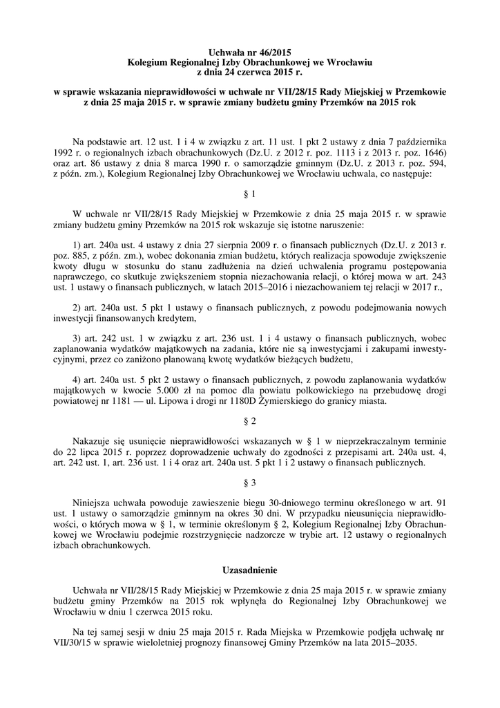 Uchwałanr46/2015 KolegiumRegionalnejIzbyObrachunkowejweWrocławiu zdnia24czerwca2015r. wsprawiewskazanianieprawidłowościwuchwalenrVII/28/15RadyMiejskiejwPrzemkowie zdnia25maja2015r.wsprawiezmianybudżetugminyPrzemkówna2015rok Napodstawieart.12ust.1i4wzwiązkuzart.11ust.1pkt2ustawyzdnia7października 1992r.oregionalnychizbachobrachunkowych(Dz.U.z2012r.poz.1113iz2013r.poz.1646) oraz art. 86 ustawy z dnia 8 marca 1990 r. o samorządzie gminnym (Dz.U. z 2013 r. poz. 594, zpóźn.zm.),KolegiumRegionalnejIzbyObrachunkowejweWrocławiuuchwala,conastępuje: §1 W uchwale nr VII/28/15 Rady Miejskiej w Przemkowie z dnia 25 maja 2015 r. w sprawie zmianybudżetugminyPrzemkówna2015rokwskazujesięistotnenaruszenie: 1)art.240aust.4ustawyzdnia27sierpnia2009r.ofinansachpublicznych(Dz.U.z2013r. poz.885,zpóźn.zm.),wobecdokonaniazmianbudżetu,którychrealizacjaspowodujezwiększenie kwoty długu w stosunku do stanu zadłużenia na dzień uchwalenia programu postępowania naprawczego, co skutkuje zwiększeniem stopnia niezachowania relacji, o której mowa w art. 243 ust.1ustawyofinansachpublicznych,wlatach2015–2016iniezachowaniemtejrelacjiw2017r., 2) art. 240a ust. 5 pkt 1 ustawy o finansach publicznych, z powodu podejmowania nowych inwestycjifinansowanychkredytem, 3) art. 242 ust. 1 w związku z art. 236 ust. 1 i 4 ustawy o finansach publicznych, wobec zaplanowania wydatków majątkowych na zadania, które nie są inwestycjami i zakupami inwestycyjnymi,przezcozaniżonoplanowanąkwotęwydatkówbieżącychbudżetu, 4) art. 240a ust. 5 pkt 2 ustawy o finansach publicznych, z powodu zaplanowania wydatków majątkowych w kwocie 5.000 zł na pomoc dla powiatu polkowickiego na przebudowę drogi powiatowejnr1181—ul.Lipowaidroginr1180DŻymierskiegodogranicymiasta. §2 Nakazuje się usunięcie nieprawidłowości wskazanych w § 1 w nieprzekraczalnym terminie do 22 lipca 2015 r. poprzez doprowadzenie uchwały do zgodności z przepisami art. 240a ust. 4, art.242ust.1,art.236ust.1i4orazart.240aust.5pkt1i2ustawyofinansachpublicznych. §3 Niniejsza uchwała powoduje zawieszenie biegu 30-dniowego terminu określonego w art. 91 ust. 1 ustawy o samorządzie gminnym na okres 30 dni. W przypadku nieusunięcia nieprawidłowości,októrychmowaw§1,wterminieokreślonym§2,KolegiumRegionalnejIzbyObrachunkowej we Wrocławiu podejmie rozstrzygnięcie nadzorcze w trybie art. 12 ustawy o regionalnych izbachobrachunkowych. Uzasadnienie UchwałanrVII/28/15RadyMiejskiejwPrzemkowiezdnia25maja2015r.wsprawiezmiany budżetu gminy Przemków na 2015 rok wpłynęła do Regionalnej Izby Obrachunkowej we Wrocławiuwdniu1czerwca2015roku. Na tej samej sesji w dniu 25 maja 2015 r. Rada Miejska w Przemkowie podjęła uchwałę nr VII/30/15wsprawiewieloletniejprognozyfinansowejGminyPrzemkównalata2015–2035. 2 Działającnapodstawieart.88ustawyzdnia8marca1990r.osamorządziegminnym(Dz.U. z 2013 r. poz. 594, z późn. zm.), w związku z realizacją przez Gminę programu postępowania naprawczego, Izba wystąpiła do Burmistrza Przemkowa o udzielenie wyjaśnień i informacji dotyczącychzmianbudżetuwprowadzonychwymienionąuchwałą,m.in.zaplanowaniadeficytubudżetu finansowanego kredytem, ujęcia w przychodach budżetu części zaciąganego kredytu, zaplanowania wydatków majątkowych na zadania niebędące inwestycjami lub zakupami inwestycyjnymi, wskazaniainwestycjikontynuowanychorazwydatkównanoweinwestycje.WyjaśnieniaBurmistrz przedstawiłpismemFin.3021.21.2015z19czerwca2015roku. Badajączgodnośćzprawemwymienionejuchwały,KolegiumRegionalnejIzbyObrachunkowejweWrocławiustwierdziło,conastępuje: ZpowodubrakumożliwościuchwaleniaprzezRadęMiejskąbudżetuGminyna2015rokoraz wieloletniejprognozyfinansowejzzachowaniemzasadokreślonychwart.243–244ustawyzdnia 27sierpnia2009r.ofinansachpublicznych(Dz.U.z2013r.poz.885,zpóźn.zm.)—zwanejdalej „u.f.p.”—izagrożeniarealizacjizadańpublicznychoraznieuchwaleniainieprzedłożeniaorganowi nadzoru w wyznaczonym terminie programu postępowania naprawczego, budżet Gminy na 2015 rok, działając na podstawie art. 240a ust. 8 u.f.p., ustaliła Regionalna Izba Obrachunkowa we Wrocławiu. Ustalając budżet Gminy Przemków na 2015 rok, Regionalna Izba Obrachunkowa we Wrocławiu określiła nadwyżkę budżetu w kwocie 5.027.097 zł, którą przeznaczyła na sfinansowanie przypadających do spłaty rat spłat rat kredytów i pożyczek (rozchody budżetu w kwocie 5.027.097zł).Przychodybudżetuniebyłyplanowane. Program postępowania naprawczego Rada Miejska przyjęła uchwałą nr IV/15/15 z dnia 19 lutego 2015 r. w sprawie programu postępowania naprawczego Gminy Przemków (zwanego dalejProgramemNaprawczym).ProgramNaprawczyzostałzaopiniowanypozytywniezzastrzeżeniamiprzezRegionalnąIzbęObrachunkowąweWrocławiu(uchwałanrII/88/2015SkładuOrzekającegozdnia25marca2015r.).ProgramNaprawczyRadaMiejskauchwaliłanalata2015–2017. WokresierealizacjiProgramuNaprawczegoRadaMiejskanieplanowaładeficytubudżetuwżadnymrokubudżetowymorazzaciąganianowychzobowiązań(kredytów)zwiększającychzadłużenie Gminy.Wlatach2015–2017wProgramieNaprawczymprzewidzianonadwyżkębudżetu. BadanąuchwałązmieniającąbudżetGminyna2015rokRadaMiejskawPrzemkowiem.in.: - zmniejszyła planowane dochody o kwotę 42.903,00 zł, z tego dochody bieżące zwiększyła o 97.168,00 zł i zmniejszyła dochody majątkowe o 140.071,00 zł, po zmianach dochody budżetu wynoszą 25.551.476,30 zł, z tego dochody bieżące 23.994.091,30 zł i dochody majątkowe 1.557.385,00zł, -zwiększyłaplanowanewydatkiokwotę7.380.762,44zł,ztegowydatkibieżącezwiększyła o kwotę 4.429.475,67 zł i wydatki majątkowe o kwotę 2.951.286,77 zł, po zmianach wydatki budżetu wynoszą 27.948.044,74 zł, z tego wydatki bieżące 24.996.757,97 zł i wydatki majątkowe 2.951.286,77zł, - określiła przychody budżetu w kwocie 5.557.178,33 zł, z tego z tytułu kredytu w kwocie 4.538.000,00 zł i z wolnych środków jako nadwyżki środków pien