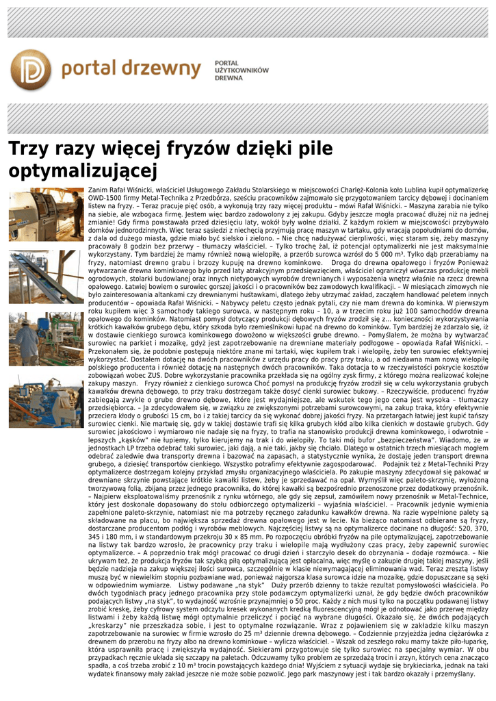 Trzy razy więcej fryzów dzięki pile optymalizującej Zanim Rafał Wiśnicki, właściciel Usługowego Zakładu Stolarskiego w miejscowości Charlęż-Kolonia koło Lublina kupił optymalizerkę OWD-1500 firmy Metal-Technika z Przedbórza, sześciu pracowników zajmowało się przygotowaniem tarcicy dębowej i docinaniem listew na fryzy. – Teraz pracuje pięć osób, a wykonują trzy razy więcej produktu – mówi Rafał Wiśnicki. – Maszyna zarabia nie tylko na siebie, ale wzbogaca firmę. Jestem więc bardzo zadowolony z jej zakupu. Gdyby jeszcze mogła pracować dłużej niż na jednej zmianie! Gdy firma powstawała przed dziesięciu laty, wokół były wolne działki. Z każdym rokiem w miejscowości przybywało domków jednorodzinnych. Więc teraz sąsiedzi z niechęcią przyjmują pracę maszyn w tartaku, gdy wracają popołudniami do domów, z dala od dużego miasta, gdzie miało być sielsko i zielono. – Nie chcę nadużywać cierpliwości, więc staram się, żeby maszyny pracowały 8 godzin bez przerwy – tłumaczy właściciel. – Tylko trochę żal, iż potencjał optymalizerki nie jest maksymalnie wykorzystany. Tym bardziej że mamy również nową wielopiłę, a przerób surowca wzrósł do 5 000 m³. Tylko dąb przerabiamy na fryzy, natomiast drewno grabu i brzozy kupuję na drewno kominkowe. Droga do drewna opałowego i fryzów Ponieważ wytwarzanie drewna kominkowego było przed laty atrakcyjnym przedsięwzięciem, właściciel ograniczył wówczas produkcję mebli ogrodowych, stolarki budowlanej oraz innych nietypowych wyrobów drewnianych i wyposażenia wnętrz właśnie na rzecz drewna opałowego. Łatwiej bowiem o surowiec gorszej jakości i o pracowników bez zawodowych kwalifikacji. – W miesiącach zimowych nie było zainteresowania altankami czy drewnianymi huśtawkami, dlatego żeby utrzymać zakład, zacząłem handlować peletem innych producentów – opowiada Rafał Wiśnicki. – Nabywcy peletu często jednak pytali, czy nie mam drewna do kominka. W pierwszym roku kupiłem więc 3 samochody takiego surowca, w następnym roku – 10, a w trzecim roku już 100 samochodów drewna opałowego do kominków. Natomiast pomysł dotyczący produkcji dębowych fryzów zrodził się z… konieczności wykorzystywania krótkich kawałków grubego dębu, który szkoda było rzemieślnikowi łupać na drewno do kominków. Tym bardziej że zdarzało się, iż w dostawie cienkiego surowca kominkowego dowożono w większości grube drewno. – Pomyślałem, że można by wytwarzać surowiec na parkiet i mozaikę, gdyż jest zapotrzebowanie na drewniane materiały podłogowe – opowiada Rafał Wiśnicki. – Przekonałem się, że podobnie postępują niektóre znane mi tartaki, więc kupiłem trak i wielopiłę, żeby ten surowiec efektywniej wykorzystać. Dostałem dotację na dwóch pracowników z urzędu pracy do pracy przy traku, a od niedawna mam nową wielopiłę polskiego producenta i również dotację na następnych dwóch pracowników. Taka dotacja to w rzeczywistości pokrycie kosztów zobowiązań wobec ZUS. Dobre wykorzystanie pracownika przekłada się na ogólny zysk firmy, z którego można realizować kolejne zakupy maszyn. Fryzy również z cienkiego surowca Choć pomysł na produkcję fryzów zrodził się w celu wykorzystania grubych kawałków drewna dębowego, to przy traku dostrzegam także dosyć cienki surowiec bukowy. – Rzeczywiście, producenci fryzów zabiegają zwykle o grube drewno dębowe, które jest wydajniejsze, ale wskutek tego jego cena jest wysoka – tłumaczy przedsiębiorca. – Ja zdecydowałem się, w związku ze zwiększonymi potrzebami surowcowymi, na zakup traka, który efektywnie przeciera kłody o grubości 15 cm, bo i z takiej tarcicy da się wykonać dobrej jakości fryzy. Na przetargach łatwiej jest kupić tańszy surowiec cienki. Nie martwię się, gdy w takiej dostawie trafi się kilka grubych kłód albo kilka cienkich w dostawie grubych. Gdy surowiec jakościowo i wymiarowo nie nadaje się na fryzy, to trafia na stanowisko produkcji drewna kominkowego, i odwrotnie – lepszych „kąsków” nie łupiemy, tylko kierujemy na trak i do wielopiły. To taki mój bufor „bezpieczeństwa”. Wiadomo, że w jednostkach LP trzeba odebrać taki surowiec, jaki dają, a nie taki, jakby się chciało. Dlatego w ostatnich trzech miesiącach mogłem odebrać zaledwie dwa transporty drewna i bazować na zapasach, a statystycznie wynika, że dostaję jeden transport drewna grubego, a dziesięć transportów cienkiego. Wszystko potrafimy efektywnie zagospodarować. Podajnik też z Metal-Techniki Przy optymalizerce dostrzegam kolejny przykład zmysłu organizacyjnego właściciela. Po zakupie maszyny zdecydował się pakować w drewniane skrzynie powstające krótkie kawałki listew, żeby je sprzedawać na opał. Wymyślił więc paleto-skrzynię, wyłożoną tworzywową folią, zbijaną przez jednego pracownika, do której kawałki są bezpośrednio przenoszone przez dodatkowy przenośnik. – Najpierw eksploatowaliśmy przenośnik z rynku wtórnego, ale gdy się zepsuł, zamówiłem nowy przenośnik w Metal-Technice, który jest doskonale dopasowany do stołu odbiorczego optymalizerki – wyjaśnia właściciel. – Pracownik jedynie wymienia zapełnione paleto-skrzynie, natomiast nie ma potrzeby ręcznego załadunku kawałków drewna. Na razie wypełnione palety są składowane na placu, bo największa sprzedaż drewna opałowego jest w lecie. Na bieżąco natomiast odbierane są fryzy, dostarczane producentom podłóg i wyrobów meblowych. Najczęściej listwy są na optymalizerce docinane na długość: 520, 370, 345 i 180 mm, i w standardowym przekroju 30 x 85 mm. Po rozpoczęciu obróbki fryzów na pile optymalizującej, zapotrzebowanie na listwy tak bardzo wzrosło, że pracownicy przy traku i wielopile mają wydłużony czas pracy, żeby zapewnić surowiec optymalizerce. – A poprzednio trak mógł pracować co 