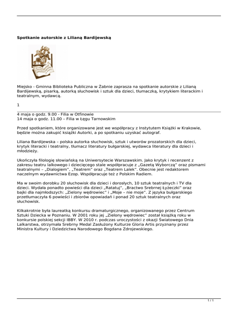 Spotkanie autorskie z Lilianą Bardijewską Miejsko - Gminna Biblioteka Publiczna w Żabnie zaprasza na spotkanie autorskie z Lilianą Bardijewską, pisarką, autorką słuchowisk i sztuk dla dzieci, tłumaczką, krytykiem literackim i teatralnym, wydawcą. 1 4 maja o godz. 9.00 - Filia w Otfinowie 14 maja o godz. 11.00 – Filia w Łęgu Tarnowskim Przed spotkaniem, które organizowane jest we współpracy z Instytutem Książki w Krakowie, będzie można zakupić książki Autorki, a po spotkaniu uzyskać autograf. Liliana Bardijewska – polska autorka słuchowisk, sztuk i utworów prozatorskich dla dzieci, krytyk literacki i teatralny, tłumacz literatury bułgarskiej, wydawca literatury dla dzieci i młodzieży. Ukończyła filologię słowiańską na Uniwersytecie Warszawskim. Jako krytyk i recenzent z zakresu teatru lalkowego i dziecięcego stale współpracuje z „Gazetą Wyborczą” oraz pismami teatralnymi – „Dialogiem”, „Teatrem” oraz „Teatrem Lalek”. Obecnie jest redaktorem naczelnym wydawnictwa Ezop. Współpracuje też z Polskim Radiem. Ma w swoim dorobku 20 słuchowisk dla dzieci i dorosłych, 10 sztuk teatralnych i TV dla dzieci. Wydała ponadto powieści dla dzieci „Ratatuj”, „Bractwo Srebrnej Łyżeczki” oraz bajki dla najmłodszych: „Zielony wędrowiec” i „Moje – nie moje”. Z języka bułgarskiego przetłumaczyła 6 powieści i zbiorów opowiadań i ponad 20 sztuk teatralnych oraz słuchowisk. Kilkakrotnie była laureatką konkursu dramaturgicznego, organizowanego przez Centrum Sztuki Dziecka w Poznaniu. W 2001 roku jej „Zielony wędrowiec” został książką roku w konkursie polskiej sekcji IBBY. W 2010 r. podczas uroczystości z okazji Światowego Dnia Lalkarstwa, otrzymała Srebrny Medal Zasłużony Kulturze Gloria Artis przyznany przez Ministra Kultury i Dziedzictwa Narodowego Bogdana Zdrojewskiego. 1/1 Powered by TCPDF (www.tcpdf.org)