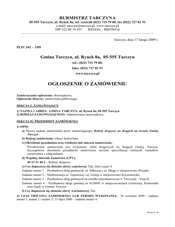 BURMISTRZ TARCZYNA 05-555 Tarczyn, ul. Rynek 8a, tel. centrali (022) 715 79 00, fax (022) 727 81 91 e-mail: [email protected], www.tarczyn.pl NIP 522 00 19 837 REGON 000550516 ____________________________________________________________________________________________________ Tarczyn, dnia 17 lutego 2009 r. PI.IV.341 – 3/09 Gmina Tarczyn, ul. Rynek 8a, 05-555 Tarczyn tel.: (022) 715 79 00, faks: (022) 727 81 91 www.tarczyn.pl OGŁOSZENIE O ZAMÓWIENIU Zamieszczanie ogłoszenia: obowiązkowe. Ogłoszenie dotyczy: zamówienia publicznego. SEKCJA I: ZAMAWIAJĄCY 1) NAZWA I ADRES: GMINA TARCZYN, ul. Rynek 8a, 05-555 Tarczyn 2) RODZAJ ZAMAWIAJĄCEGO: Administracja samorządowa. SEKCJA II: PRZEDMIOT ZAMÓWIENIA 1) OPIS: a) Nazwa nadana zamówieniu przez zamawiającego: Roboty drogowe na drogach na terenie Gminy Tarczyn b) Rodzaj zamówienia: roboty budowlane. c) Określenie przedmiotu oraz wielkości lub zakresu zamówienia: Przedmiotem zamówienia jest wykonanie robót drogowych na drogach Gminy Tarczyn. Szczegółowe określenie przedmiotu zamówienia zawiera specyfikacja istotnych warunków zamówienia z załącznikami. d) Wspólny Słownik Zamówień (CPV): 45 23 31 40-2 – Roboty drogowe, e) Czy dopuszcza się złożenie oferty częściowej: Tak, ilość części 4. Zadanie numer 1 – Przebudowa dróg gminnych: ul. Północna i ul. Długa w miejscowości Przypki; Zadanie numer 2 – Modernizacja ul. Topolowej i ul. Leśnej w miejscowości Korzeniówka; Zadanie numer 3 – Przebudowa dróg gminnych na osiedlu mieszkaniowym w Tarczynie – Etap II; Zadanie numer 4 – Przebudowa drogi gminnej nr 0128045 w miejscowościach Jeziorzany, Komorniki oraz Gąski w Gminie Tarczyn. f) Czy dopuszcza się złożenie oferty wariantowej: Nie. 2) CZAS TRWANIA ZAMÓWIENIA LUB TERMIN WYKONANIA: 30 września 2009 - zadanie numer 1, numer 2 i numer 3; 31 lipca 2009 – zadanie numer 4. Strona 1 z 4 SEKCJA III: INFORMACJE O FINANSOWYM I TECHNICZNYM CHARAKTERZE PRAWNYM, EKONOMICZNYM, 1) INFORMACJA NA TEMAT WADIUM Zamawiający wymaga wniesienia wadium (dla każdego zadania osobno) w wysokości: a) dla zadania numer 1 – 8 000,00 zł (słownie: osiem tysięcy zł 00/100), b) dla zadania numer 2 – 8 000,00 zł (słownie: osiem tysięcy zł 00/100), c) dla zadania numer 3 – 20 000,00 zł (słownie: dwadzieścia tysięcy zł 00/100), d) dla zadania numer 4 – 40 000,00 zł (słownie: czterdzieści tysięcy zł 00/100) Wadium w pieniądzu w zł (PLN) należy wnieść przelewem na konto Urzędu Miejskiego z siedzibą w Tarczynie przy ulicy Rynek 8a zlokalizowane w Banku DnB NORD Polska S.A., na numer konta: 61 1370 1138 0000 1804 4681 4002. Za termin wniesienia wadium w formie pieniężnej zostanie przyjęty termin wpływu na rachunek bankowy Zamawiającego. Na przelewie powinno widnieć Wadium w przetargu pn.: Roboty drogowe na drogach na terenie Gminy Tarczyn – zadanie numer …….. /wpisać numer zadania/ …………………………………….. /wpisać nazwę zadania/ Wadium wniesione w formach, określonych w art. 45 ust. 6 pkt. 2-pkt. 5 Pzp należy złożyć w oryginale w kasie Urzędu Miejskiego w Tarczynie. Zamawiający dopuszcza, aby wadium wnoszone w formie innej niż pieniężna było załączone do oferty – jako jej luźna, niezszyta część. W przypadku wniesienia wadium w formach przewidzianych w art. 45 ust. 6 pkt. 2-pkt. 5 Pzp dokumenty takie muszą zawierać następujące informacje: a) określenie przedmiotu przetargu – należy wpisać nazwę: Roboty drogowe na drogach na terenie Gminy Tarczyn – zadanie numer …….. /wpisać numer zadania/ …………………………………….. /wpisać nazwę zadania/ b) określenie podmiotu, który wystawia gwarancję lub poręczenie, c) określenie beneficjanta gwarancji lub poręczenia: Gmina Tarczyn; ul. Rynek 8a; kod:05-555 Tarczyn, d) określenie podmiotu, na rzecz którego wystawiana jest gwarancja lub poręczenie – dane wykonawcy; jeżeli ofertę składa konsorcjum lub inny podmiot wspólny w gwarancji lub poręczeniu muszą być wymienione wszystkie podmioty wchodzące w jego skład; e) określenie kwoty gwarancji lub poręczenia – musi ona odpowiadać kwocie wadium; kwota wadium ma być wyrażona w złotych polskich i ma wynikać wprost z treści gwarancji lub poręczenia f) gwarancja lub poręczenie musi zapewnić wypłatę pełnej kwoty wadium przetargowego – w razie zaistnienia okoliczności określonych w art. 46 ust. 4a i ust. 5 Pzp, g) określenie terminu ważności gwarancji lub poręczenia – okres ten nie może być krótszy niż 30 dni, licząc od dnia, w którym upłynął termin składania ofert; h) gwarancja lub poręczenie powinno zawierać stwierdzenie, że podmiot wystawiający gwarancję wypłaci beneficjantowi świadczenie ,,na pierwsze żądanie” w terminie nie dłuższym niż 30 dni od dnia zgłoszenia żądania. 2) WARUNKI UDZIAŁU Opis warunków udziału w postępowaniu oraz opis sposobu dokonywania oceny spełniania tych warunków: Wykonawca nie może podlegać wykluczeniu z ubiegania się o udzielenie zamówienia publicznego określonego w pkt. 2 siwz – na podstawie art. 22 ust. 1 i art. 24 ust. 1 i ust. 2 Pzp oraz rozporządzenia Prezesa Rady Ministrów z dnia 10 maja 2006 roku w sprawie rodzajów dokumentów, jakich może żądać zamawiający od wykonawcy oraz form, w jakich te dokumenty mogą być składane (Dz.U. z 2006 roku Nr 87, poz. 605 ze zm.). Wykonawca musi posiadać niezbędną wiedzę i doświadczenie oraz dysponować potencjałem technicznym i doświadczoną kadrą zdolną do wykonania przedmiotowego zamówienia, tj.: a) ma dysponować lub przedstawić pisemne zobowiązanie innych podmiotów do udostępnienia co najmniej następujących urządzeń: dla zadania numer 3 – zagęszczarka wibracyjna, równiarka, samochód Strona 2 z 4 samowyładowczy, wibrator płytowy; dla zadania numer 1, numer 2 i numer 4 – walec statyczny samojezdny, samochód samowyładowczy, rozkładar