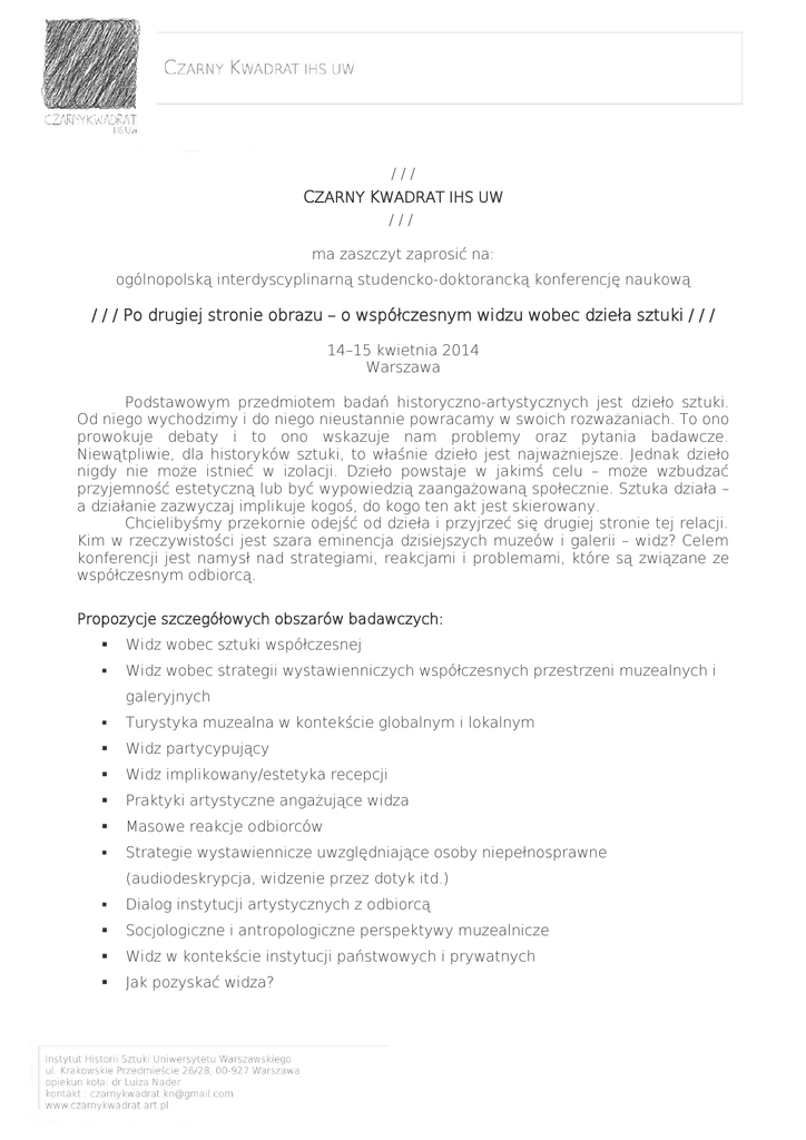 /// CZARNY KWADRAT IHS UW /// ma zaszczyt zaprosić na: ogólnopolską interdyscyplinarną studencko-doktorancką konferencję naukową / / / Po drugiej stronie obrazu – o współczesnym widzu wobec dzieła sztuki / / / 14–15 kwietnia 2014 Warszawa Podstawowym przedmiotem badań historyczno-artystycznych jest dzieło sztuki. Od niego wychodzimy i do niego nieustannie powracamy w swoich rozważaniach. To ono prowokuje debaty i to ono wskazuje nam problemy oraz pytania badawcze. Niewątpliwie, dla historyków sztuki, to właśnie dzieło jest najważniejsze. Jednak dzieło nigdy nie może istnieć w izolacji. Dzieło powstaje w jakimś celu – może wzbudzać przyjemność estetyczną lub być wypowiedzią zaangażowaną społecznie. Sztuka działa – a działanie zazwyczaj implikuje kogoś, do kogo ten akt jest skierowany. Chcielibyśmy przekornie odejść od dzieła i przyjrzeć się drugiej stronie tej relacji. Kim w rzeczywistości jest szara eminencja dzisiejszych muzeów i galerii – widz? Celem konferencji jest namysł nad strategiami, reakcjami i problemami, które są związane ze współczesnym odbiorcą. Propozycje szczegółowych obszarów badawczych: Widz wobec sztuki współczesnej Widz wobec strategii wystawienniczych współczesnych przestrzeni muzealnych i galeryjnych Turystyka muzealna w kontekście globalnym i lokalnym Widz partycypujący Widz implikowany/estetyka recepcji Praktyki artystyczne angażujące widza Masowe reakcje odbiorców Strategie wystawiennicze uwzględniające osoby niepełnosprawne (audiodeskrypcja, widzenie przez dotyk itd.) Dialog instytucji artystycznych z odbiorcą Socjologiczne i antropologiczne perspektywy muzealnicze Widz w kontekście instytucji państwowych i prywatnych Jak pozyskać widza? Do udziału w konferencji zapraszamy studentów, absolwentów, doktorantów oraz doktorów historii sztuki, kulturoznawstwa, etnologii, socjologii, filozofii jak również inne osoby zainteresowane zagadnieniem widza/odbiorcy dzieła sztuki. Na wypełnione formularze zgloszeniowe (dostępne na stronie www.czarnykwardat.art.pl) czekamy do 2 marca 2014 roku. Prosimy o przesyłanie ich na adres: [email protected] Czas trwania wystąpień – 20 minut,wystąpienia można wygłosić w języku polskim lub angielskim. Informacje o przyjęciu zgłoszenia zostaną podane do wiadomości do 16 marca 2014 roku. Szczegółowy program konferencji zostanie opublikowany na oficjalnej stonie internetowej Czarnego Kwadratu do 30 marca 2014 roku. W przypadku nadesłania dużej liczby zgłoszeń Organizatorzy zastrzegają sobie prawo do przeprowadzenia selekcji. Koszt konferencji – bezpłatna W wypadku jakichkolwiek pytań prosimy o kontakt pod adresem: [email protected] Szczegółowe informacje będą pojawiać się na oficjalnej stronie Czarnego Kwadratu (www.czarnykwardat.art.pl) oraz na fanpage'u na portalu społecznościowym facebook.com (www.facebook.com/CzarnyKwadrat). Z wyrazami szacunku, Zarząd i członkowie Koła Naukowego CZARNY KWADRAT IHS UW