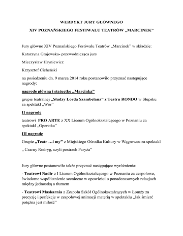 WERDYKT JURY GŁÓWNEGO XIV POZNAŃSKIEGO FESTIWALU TEATRÓW „MARCINEK” Jury główne XIV Poznańskiego Festiwalu Teatrów „Marcinek” w składzie: Katarzyna Grajewska- przewodnicząca jury Mieczysław Hryniewicz Krzysztof Cicheński na posiedzeniu dn. 9 marca 2014 roku postanowiło przyznać następujące nagrody: nagrodę główną i statuetkę „Marcinka” grupie teatralnej „Słudzy Lorda Szambelana” z Teatru RONDO w Słupsku za spektakl „Wór” II nagrodę teatrowi PRO ARTE z XX Liceum Ogólnokształcącego w Poznaniu za spektakl „Operetka” III nagrodę Grupie „Teatr …i my” z Miejskiego Ośrodka Kultury w Wągrowcu za spektakl „ Czarny Rodryg, czyli postrach Paryża” Jury główne postanowiło także przyznać następujące wyróżnienia: - Teatrowi Nadir z I Liceum Ogólnokształcącego w Poznaniu za zespołowe, świadome współistnienie sceniczne w opowieści o ponadczasowych relacjach między jednostką a tłumem - Teatrowi Maskarnia z Zespołu Szkół Ogólnokształcących w Łomży za precyzję i perfekcje w zespołowej animacji materią w spektaklu „Jak śmierć potężna jest miłość” - Teatrowi Matysarek z I Liceum Ogólnokształcącego w Złotowie za spontaniczność i radość w scenicznym obcowaniu z Witkacym w spektaklu „Karaluchy i odważna księżniczka” - Kamilowi Makowskiemu z Teatru Kumonoque z Zespołu Szkół HandlowoEkonomicznych w Białymstoku za kreację roli Boga w spektaklu „ Żywoty świętych osiedlowych” - Mateuszowi Iwińskiemu z Kujawskiego Ośrodka Kultury w Inowrocławiu za monodram „Mortal Kombajn” - Teatrowi ( Nie) Nasyceni z Młodzieżowego Ośrodka Kultury w Słupsku za zespołową grę aktorską w spektaklu „ Na pełnym morzu…” Wszystkim nagrodzonym i wyróżnionym serdecznie gratulujemy!