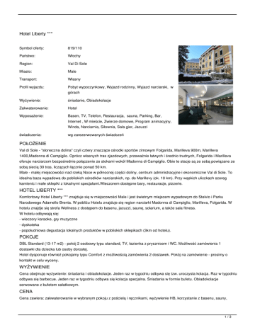 Hotel Liberty *** Symbol oferty: 819/110 Państwo: Włochy Region: Val Di Sole Miasto: Male Transport: Własny Profil wyjazdu: Pobyt wypoczynkowy, Wyjazd rodzinny, Wyjazd narciarski, w Wyżywienie: śniadanie, Obiadokolacje Zakwaterowanie: Hotel Wyposażenie: Basen, TV, Telefon, Restauracja, sauna, Parking, Bar, górach Internet , W mieście, Zwierze domowe, Program animacyjny, Winda, Narciarnia, Siłownia, Sala gier, Jacuzzi świadczenia: wg zarezerwowanych świadczeń POŁOŻENIE Val di Sole - "słoneczna dolina" czyli cztery znaczące ośrodki sportów zimowym Folgarida, Marilleva 900m, Marilleva 1400,Madonna di Campiglio. Oprócz własnych tras zjazdowych, przeważnie łatwych i średnio trudnych, Folgarida i Marilleva oferuje narciarzom bezpośrednie połączenie ze stokami wokół Madonna di Campiglio. Obie te stacje są ze sobą powiązane ze sobą siecią 30 tras, liczących łącznie ponad 50 km. Male - małej miejscowości nad rzeką Noce w północnej części doliny, centrum administracyjne i ekonomiczne Val di Sole. To idealna baza wypadowa do pobliskich ośrodków narciarskich, np. do Marillevy (ok. 10 km). Przy wąskich uliczkach szereg kamienic i małe sklepiki z lokalnymi specjałami.Wieczorem dostępne bary, restauracje, pizzerie. HOTEL LIBERTY *** Komfortowy Hotel Liberty *** znajduje się w miejscowości Male i jest świetnym miejscem wypadowym do Stelvio i Parku Narodowego Adamello Brenta. W pobliżu Hotelu znajduje się region narciarki Madonna di Campiglio, Marilleva, Folgarida. W hotelu znajdje się strefa Wellness z dostępem do basenu, jacuzzi, saunę, solarium, a także sala fitness. W hotelu odbywają się: - wieczory karaoke, gry muzyczne - dyskoteka - popołudniowa degustacja lokalnych produktów w pobliskich sklepikach (3km od hotelu). POKOJE DBL Standard (13-17 m2) - pokój 2 osobowy typu standard, TV, łazienka z prysznicem i WC. Możliwość zamówienia 1 dostawki dla dziecka lub osoby dorosłej. Hotel dysponuje również pokojamy typu Comfort z możliwością zamówienia 2 dostawek. Pokój na zamówienie - prosimy o kontakt w celu wyceny. WYŻYWIENIE Cena obejmuje wyżywienie: śniadania i obiadokolacje. Jeden raz w tygodniu odbywa się tzw. uroczysta kolacja. Raz w tygodniu odbywa się barbecue. Jeden raz w tygodniu odbywa się kolacja specjalna. Śniadania w formie bufetu. Obiadokolacje serwowane z bufetem sałatkowym. CENA Cena zawiera: zakwaterowanie w wybranym pokoju z pościelą i ręcznikami, wyżywienie HB, korzystanie z basenu, sauny, 1/3 hammamu, sali fitness, sali gier, obowiązkowe, podstawowe ubezpieczenie turystyczne KL, NNW,Wi-Fi ADSL 20 MB, transfer do regionu narciarskiego Daolasa (skibus odjeżdża do kolejki Comezzadura/Daolasa> 5 minut), wieczorne rozrywki, parking, uroczysta kolacja świąteczna w terminie 24.12. - 31.12.2016, uroczysta sylwestrowa kolacja z muzyką w terminie 26.12 -02.01.2017, korzystanie z narciarni z podgrzewaczami do butów, 1 miejsce parkingowe, Cena nie zawiera: transportu, korzystanie z zabiegów SPA, korzystania z solarium 10 EUR, garażu płatnego (opcjonalnie) 3 EUR/dzień, ubezpieczenia narciarskiego (opcjonalnie) 70 PLN / osoba 6 dni na nartach, ubezpieczenia od kosztów rezygnacji 3%, ubezpieczenia od chorób przewlekłych, napoi do obiadokolacji. kolacją w domku górskim (farmhouse) 20 EUR/os., pobytu małych psów 35 EUR/tydzień, (max 2 małe psy w tygodniu w hotelu), karnetu narciarskiego płatnego na miejscu. Atrakcje: • Możliwość gry w tenisa w hali, • Jazda konna, • Kolejka linowa z Passo Tonale prowadząca na lodowiec Presena na wysokość 3000m.n.p.m, • Łyżwy, • Wspinaczki po zamarzniętych wodospadach, • Loty paralotniami, • Wędrówki na rakietach śnieżnych przez Park Narodowy Stelvio, • Kąpiele w basenach termalnych, kąpiele węglanowe, • Snowpark Freestyle Arena w Passo Tonale (nartostrada Ski-Cross), • Wyprawy wysokogórskie, • Zwiedzanie Parku Narodowego Stilfserjoch, • Psie zaprzęgi, • Liczne puby, dyskoteki i bary z winem, • Dla dzieci Daolasa Kids przy stacji kolejki Daolasa-Val Mastellina: ogrzewane pokoje zabaw z zabawkami, dmuchanymi zamkami i trasą Snowtubing lub Kraina ślizgawek • Klub Crimolino w Val di Pejo: znajduje się tam wioska indiańska Eskimosów Inuit z igloo, miniklubem, placem zabaw i Snowtubing, barem i restauracją, • Biancaneve Snow Park w Cogolo di Peio, • Nowy park La Bruscadela: stok do Snowtubingu, airboardu I zjeżdzalnia na bobie I sankach, dla dzieci śnieżne pagórki i gumowe zwierzaki, • W babyparkach Marilladia w Marilleva i Fantaski w Passo Tonale są dla dzieci tunele i dmuchane zamki, instruktorzy oferują opiekę nad dzieckiem oraz program animacyjny, • Możliwość spróbowania kuchni regionalnej w okolicznych barach, restauracjach i gospodarstwach agroturystycznych, • Biblioteka miejska, kościół, liczne kina, imprezy kulturalne w Male. TERMINY: od: 2017-03-11 do: 2017-03-18 (8 dni), miejsca: zamów cena od: 1729 PLN CENNIK: Długość pobytu: 8 dni Grupa cenowa: E Wyżywienie (do wyboru) (*) HB (śniadania i obiadokolacje) Ubezpieczenie (obligatoryjne) (*) Fundusz Gwarancyjny - Europa Pobyt w obiekcie (do wyboru) Pokój 2-os. Standard+1 dost. dla dziecka 8-15 lat standardowo dla osób: 3 pokój 1-osobowy (-) 10 (-) 2/3 (*) Pokój 2-osobowy Standard standardowo dla osób: 2 pokój 2-osobowy standard z dostawką dla dorosłego standardowo dla osób: 3 Pokój 2-os. Standard+1 dost.dla dziecka do 7,99lat standardowo dla osób: 3 Zniżka (do wyboru) (*) Oferta katalogowa Ubezpieczenie KL, NNW + SKI OC, KR (*) obowiązkowe podstawowe ubezpieczenie KL, NNW Dziecko do 15,99 lat (*) Osoba dorosła Dziecko 0-8 lat Ubezpieczenie (opcjonalne) ubezpieczenie od kosztów rezygnacji (-) -253 (-) (-) Ubezpieczenie (do wyboru) Rodzaj osoby (do wyboru) 386 70 35 1179 1684 1 3% Waluta: PLN Aktualne ceny z systemu S.A.R.T. (-) - cena usługi, podatku kalkulowana przy osobie lub gratis (*) - kwota wliczona w cenę