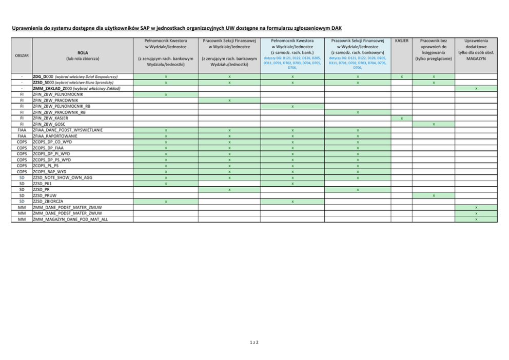 Uprawnienia do systemu dostępne dla użytkowników SAP w jednostkach organizacyjnych UW dostępne na formularzu zgłoszeniowym DAK OBSZAR - FI FI FI FI FI FI FIAA FIAA COPS COPS COPS COPS COPS COPS SD SD SD SD SD MM MM MM ROLA (lub rola zbiorcza) ZDG_D000 (wybrać właściwy Dział Gospodarczy) ZZSD_S000 (wybrać właściwe Biuro Sprzedaży) ZMM_ZAKLAD_Z000 (wybrać właściwy Zakład) ZFIN_ZBW_PELNOMOCNIK ZFIN_ZBW_PRACOWNIK ZFIN_ZBW_PELNOMOCNIK_RB ZFIN_ZBW_PRACOWNIK_RB ZFIN_ZBW_KASJER ZFIN_ZBW_GOSC ZFIAA_DANE_PODST_WYSWIETLANIE ZFIAA_RAPORTOWANIE ZCOPS_DP_CO_WYD ZCOPS_DP_FIAA ZCOPS_DP_PI_WYD ZCOPS_DP_PS_WYD ZCOPS_PL_PS ZCOPS_RAP_WYD ZZSD_NOTE_SHOW_OWN_AGG ZZSD_PK1 ZZSD_PR ZZSD_PRUW ZZSD_ZBIORCZA ZMM_DANE_PODST_MATER_ZMUW ZMM_DANE_PODST_MATER_ZWUW ZMM_MAGAZYN_DANE_POD_MAT_ALL Pełnomocnik Kwestora w Wydziale/Jednostce Pracownik Sekcji Finansowej w Wydziale/Jednostce Pełnomocnik Kwestora w Wydziale/Jednostce (z samodz. rach. bank.) Pracownik Sekcji Finansowej w Wydziale/Jednostce (z samodz. rach. bankowym) (z zerującym rach. bankowym Wydziału/Jednostki) (z zerującym rach. bankowym Wydziału/Jednostki) dotyczy DG: D121, D122, D126, D205, D311, D701, D702, D703, D704, D705, D706, dotyczy DG: D121, D122, D126, D205, D311, D701, D702, D703, D704, D705, D706, x x x x x x x x KASJER Pracownik bez uprawnień do księgowania (tylko przeglądanie) x x x Uprawnienia dodatkowe tylko dla osób obsł. MAGAZYN x x x x x x x x x x x x x x x x x x x x x x x x x x x x x x x x x x x x x x x x x x x x x x x x x x x x x 1z2 Opisy ról oraz transakcji składających się na role można zobaczyć np. w Formularzu Zgłoszeniowym SAP (jak w załaczonym niżej obrazie). Po zalogowaniu do Formularzy SAP należy wybrać przycisk "Opisy ról" i pobrać właściwą tabelę ze szczegółowym opisem ról. 2z2
