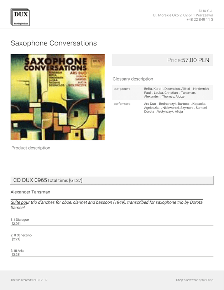 DUX S.J. Ul. Morskie Oko 2, 02-511 Warszawa +48 22 849 11 3 Saxophone Conversations Price:57,00 PLN Glossary description composers Beffa, Karol ∎, Desenclos, Alfred ∎, Hindemith, Paul ∎, Lauba, Christian ∎, Tansman, Alexander ∎, Thomys, Alojzy ∎ performers Ars Duo ∎, Bednarczyk, Bartosz ∎, Kopacka, Agnieszka ∎, Nidzworski, Szymon ∎, Samsel, Dorota ∎, Wołyńczyk, Alicja ∎ Product description CD DUX 0965Total time: [61:37] Alexander Tansman Suite pour trio d’anches for oboe, clarinet and bassoon (1949), transcribed for saxophone trio by Dorota Samsel 1. I Dialogue [2:01] 2. II Scherzino [2:21] 3. III Aria [3:28] The file created: 09-03-2017 Shop`s software AptusShop DUX S.J. Ul. Morskie Oko 2, 02-511 Warszawa +48 22 849 11 3 4. IV Finale [3:47] Karol Beffa Obsession (2009) 5. I Libre | Free [1:55] 6. IV ćwierćnuta = 200 [2:57] Paul Hindemith Konzertstück für zwei Altsaxophone (1933) 7. I Lebhaft [3:18] 8. II Mäßig langsam [2:09] 9. III Lebhaft [3:06] Christian Lauba Balafon (1992-1994)) 10. Balafon (1992-1994) [6:42] Christian Lauba Ars (1992-1994) 11. Ars (1992-1994) The file created: 09-03-2017 Shop`s software AptusShop DUX S.J. Ul. Morskie Oko 2, 02-511 Warszawa +48 22 849 11 3 [4:39] Alojzy Thomys Miniatures in various styles (1968) 12. IV Andantino (molto rubato) [4:36] 13. V Vivo scherzando [1:59] 14. VI Allegro con fuoco [2:03] 15. VII Vivace [1:07] 16. VIII Andante con passione [4:35] Alfred Desenclos Prelude, Cadence et Finale 17. Prelude, Cadence et Finale [10:53] Performers: Ars Duo Bartosz Bednarczyk /piano/ Agnieszka Kopacka /piano/ Szymon Nidzworski /tenor saxophone/ Dorota Samsel /soprano saxophone/ Alicja Wołyńczyk /soprano saxophone/ The file created: 09-03-2017 Powered by TCPDF (www.tcpdf.org) Shop`s software AptusShop