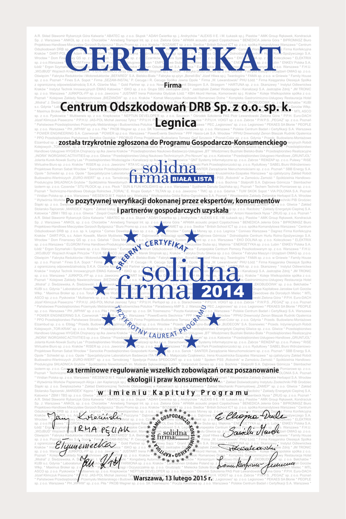 A.R. Skład Sławomir Rybarczyk Góra Kalwaria * ABATEC sp. z o.o. Słupsk * ADAH Ćwiertka sp. j. Andrychów * ALEXIS II E. i M. Łukasik sp.j. Piastów * AMK Group Rękawek, Kondraciuk Sp. J. Warszawa * ANKOL sp. z o.o. Chorzelów * Anneberg Transpol Int. sp. z o.o. Zielona Góra * APAMA acoustic project Częstochowa * BENEDICA Jelenia Góra * BIPROMASZ Biuro Projektowo-Handlowe Mieczysław Gorzoch Bydgoszcz * Biuro Promo sp. z o.o. Kraków * BOZAMET sp. z o.o. Siedlce * British School ICT sp. z o.o. spółka Komandytowa Warszawa * Centrum Odszkodowań DRB sp. z o.o. sp. k. Legnica * Comex Deweloperstwo sp. z o.o., sp. K. Wrocław * Compass Money sp. z o.o. Legnica * Coniveo Warszawa * Dagnez Firma Konfekcyjna Kraków * DART-POL s.c. Adam Kowalik, Marcin Myśliwiec Pszczyna * Dąbrowskie Wodociągi spółka z o.o. Dąbrowa Górnicza * Dolnośląskie Centrum Hurtu Rolno-Spożywczego S.A. Wrocław * Dom Finansowy QS sp. z o.o. Gdańsk * Dora Metal sp. z o.o. Czarnków * Ecovis System Rewident sp. z o.o. Warszawa * EKO DOLINA sp. z o.o. Koleczkowo * ELEKTRIX sp. z o.o.Warszawa * ELGROM Firma Handlowo-Produkcyjno-Usługowa Raszyn * EMPOL Ewa Siuba, Mieczysław Siuba sp.j. Miękinia * ENERGETYKA sp. z o.o. Lubin * ENKEV Polska S.A. Łódź * Ergon Szymański i Synowie sp. z o.o. Warszawa * Europejskie Centrum Odszkodowań S.A. Legnica * Europejskie Centrum Pomocy Poszkodowanym sp. z o.o. Warszawa * F.H.U. „WOJBUD” Wojciech Knapik Pińczów * F.U.H. SEMACO Jerzy Skałoń, Marek Strojniak sp.j. Kraków * Fabryka Drutu Gliwice sp. z o.o. Gliwice * Fabryka Maszyn i Urządzeń OMAG sp. z o.o. Oświęcim * Fabryka Reduktorów i Motoreduktorów „BEFARED” S.A. Bielsko-Biała * Fabryka sp.ężyn „Bonell-Bis” Józef Hliwa sp.j. Twardogóra * FAMA sp. z o.o. w Gniewie * Family House sp. z o.o. Poznań * Fines S.A. Sopot * Firma „SEZAM-INSTAL” P. Cecuga i R. Cecuga Spółka Jawna Opole * Firma „W. Lewandowski” PHU Łódź * Firma Księgarska Olesiejuk Spółka z ograniczoną odpowiedzialnością S.K.A. Ożarów Maz. * Gold Partner sp. z o.o. Nowy Sącz * Granit Strzegom S.A. Strzegom * HARTUNA sp. z o.o. Skarszewy * Instytut Odlewnictwa Kraków * Instytut Technik Innowacyjnych EMAG Katowice * ISKO sp. z o.o. Grupa SBS Jastrzębie Zdrój * Jastrzębski Zakład Wodociągów i Kanalizacji S.A. Jastrzębie Zdrój * JM TRONIC sp. z o.o. Warszawa * JURKPOL-FP sp. z o.o. Jaworzno * JUSTART Irena Potomska Głydziak Łódź * KBH Akord Hernas, Komorowski sp.j. Kraków * Koleje Wielkopolskie spółka z o.o. Poznań * Kolejowe Zakłady Nawierzchniowe „BIEŻANÓW” sp. z o.o. Kraków * Komat Mieczysław Kozłowski Romanowo Dolne * Kompleks Gastronimiczno-Usługowy Restauracja Hotel „Mistral” J. Śledziewska, A. Śledziewski, I. Rożnawska Marki * Kongsberg Automotive sp. z o.o. Pruszków * Konsorcjum Projektowo-Wykonawcze „EKOBUDOWA” sp. z o.o. Bełchatów * KUBI s.c. Gdynia * Laboratorium Kosmetyków Naturalnych FARMONA sp. z o.o. Kraków * Lantmannen Unibake Poland sp. z o.o. Poznań * Lubuska Grupa Kapitałowa Jarosław Łoń Gorzów Wlkp. * Maximus Broker sp. z o.o. Toruń * Miejskie Wodociągi i Oczyszczalnia sp. z o.o. Grudziądz * Mielecka Szkoła Biznesu Policealne Studium Zawodowe dla Dorosłych Mielec * MTL ASCO sp. z o.o. Pyskowice * Multiserwis sp. z o.o. Krapkowice * NEPTUN DEVELOPER sp. z o.o. Szczecin * Ośrodek Szkolenia PAS Piotr Lewandowski Zielona Góra * P.P.H. Euro-DACH Józef Klimczuk Piaseczno * P.P.H.U. JAS-POL Michał Jasnosz Tylicz * P.P.U.H. Perfopol sp. z o. o. Starachowice * P.P.U.H. VOIGT sp. z o.o. Zabrze * P.W.P.S. „PEGAZ” sp. z o.o. Poznań * Państwowe Przedsiębiorstwo Przemysłu Meblarskiego i Budownictwa Potulice * Paradowscy AMP S. J. Warszawa * PEC „Legionowo” sp. z o.o. Legionowo * PEKAES SA Błonie * PEOPLE sp. z o.o. Warszawa * PH „WPHW” sp. z o.o. Piła * PKOB Wegner sp. z o.o. SK Trzemeszno * Poczta Kwiatowa sp. z o.o. Warszawa * Polskie Centrum Badań i Certyfikacji S.A. Warszawa * POWER ENGINEERING S.A. Czerwonak * POWER sp.z o.o. Warszawa * PowerEvents Siechnice * PPF Hasco-Lek S.A. Wrocław * PPHU Drewnostyl Zenon Błaszak Rudniki Opalenica * PPO Przedsiębiorstwo Państwowe Strzelce Opolskie * PROBUD Firma Projektowo-Budowlana Tomasz Graf Szczecin * Pronet-Color sp. z o.o. Gdynia * Przeds. Budowlano-Montażowe Elzambud sp. z o. o. Elbląg * Przeds. Budownictwa Ogólnego Dach Bud sp. z o.o. Wrocław * Przeds. Inżynieryjno-Budowlane „BUDECON” S.A. Sosnowiec * Przeds. Inżynieryjnych Robót Kolejowych „TOR-KRAK” sp. z o.o. Kraków * Przedsiębiorstwo Drogowo Budowlane sp. z o.o. Brodnica * Przedsiębiorstwo Energetyki Cieplnej Gliwice sp. z o.o. Gliwice * Przedsiębiorstwo Handlowo Usługowe HYGIEIA Chojnaccy sp.łka Jawna Kraków * Przedsiębiorstwo Naukowo-Badawczo-Usługowe „BT” Włodzimierz Buziński Bielsko-Biała * Przedsiębiorstwo Realizacyjne „INORA” INORGANIC ACTIVITIES sp. z o.o. Gliwice * Przedsiębiorstwo Usług Naukowo-Technicznych „Pro Novum” sp. z o.o. Katowice * Przedsiębiorstwo Usługowo-Handlowe „GRUNTJOL” Jolanta Kurek-Nowak Suchy Las * Przedsiębiorstwo Wodociągów i Kanalizacji sp.łka z o.o. Starachowice * QNT Systemy Informatyczne sp. z o.o. Zabrze * REMZAP sp. z o.o. Puławy * RISE Wirtualne Biuro sp. z o.o. Kraków * RISER sp. z o.o. Jaworzno * RTA VC sp. z o.o. S.K.A. Warszawa * Rydułtowski Park Przedsiębiorczości sp. z o.o. Rydułtowy * SABEL Biuro WdrożeniowoProjektowe Roman Sabat Wrocław * Sanockie Przedsiębiorstwo Gospodarki Komunalnej sp. z o.o. Sanok * SANTER Zarządzanie Nieruchomościami sp. z o.o. Poznań * SBB Energy S.A. Opole * Schiedel sp. z o.o. Opole * Specjalistyczne Laboratorium Badawcze ITA-TEST s.c. Małgorzata Czajkiewicz, Irena Kruszelnicka-Szapałas Warszawa * sp.cjalistyczny Zakład Robót Budowalno-Wiertniczych „EURO-WIERT” sp. z o.o. Tarnobrzeg * Spedycja Polska SPEDCONT sp. z o.o. Łódź * Społem PSS „Robotnik” w Zamościu Zamość 