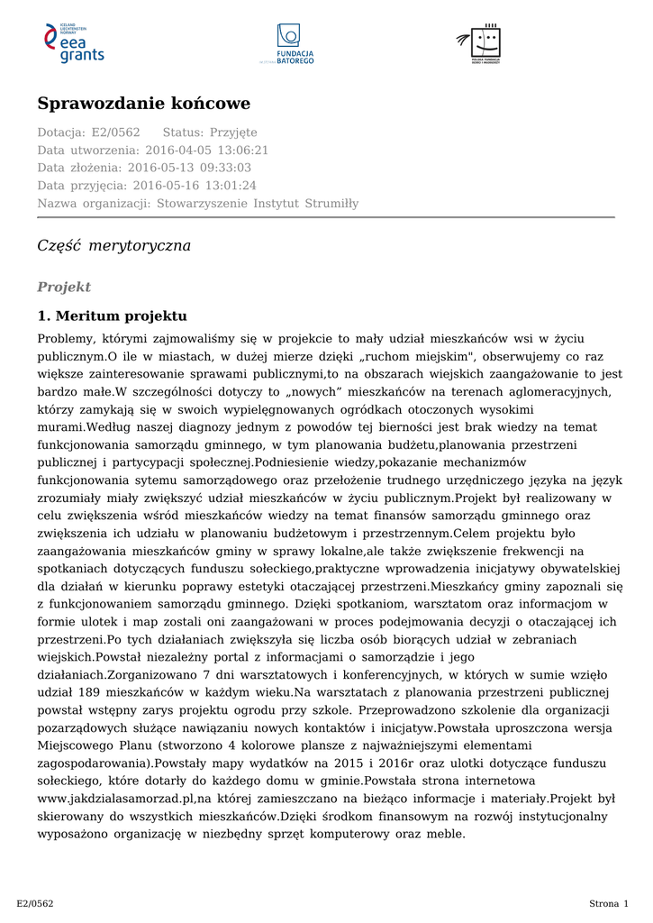 Sprawozdanie końcowe Dotacja: E2/0562 Status: Przyjęte Data utworzenia: 2016-04-05 13:06:21 Data złożenia: 2016-05-13 09:33:03 Data przyjęcia: 2016-05-16 13:01:24 Nazwa organizacji: Stowarzyszenie Instytut Strumiłły Część merytoryczna Projekt 1. Meritum projektu Problemy, którymi zajmowaliśmy się w projekcie to mały udział mieszkańców wsi w życiu publicznym.O ile w miastach, w dużej mierze dzięki „ruchom miejskim", obserwujemy co raz większe zainteresowanie sprawami publicznymi,to na obszarach wiejskich zaangażowanie to jest bardzo małe.W szczególności dotyczy to „nowych” mieszkańców na terenach aglomeracyjnych, którzy zamykają się w swoich wypielęgnowanych ogródkach otoczonych wysokimi murami.Według naszej diagnozy jednym z powodów tej bierności jest brak wiedzy na temat funkcjonowania samorządu gminnego, w tym planowania budżetu,planowania przestrzeni publicznej i partycypacji społecznej.Podniesienie wiedzy,pokazanie mechanizmów funkcjonowania sytemu samorządowego oraz przełożenie trudnego urzędniczego języka na język zrozumiały miały zwiększyć udział mieszkańców w życiu publicznym.Projekt był realizowany w celu zwiększenia wśród mieszkańców wiedzy na temat finansów samorządu gminnego oraz zwiększenia ich udziału w planowaniu budżetowym i przestrzennym.Celem projektu było zaangażowania mieszkańców gminy w sprawy lokalne,ale także zwiększenie frekwencji na spotkaniach dotyczących funduszu sołeckiego,praktyczne wprowadzenia inicjatywy obywatelskiej dla działań w kierunku poprawy estetyki otaczającej przestrzeni.Mieszkańcy gminy zapoznali się z funkcjonowaniem samorządu gminnego. Dzięki spotkaniom, warsztatom oraz informacjom w formie ulotek i map zostali oni zaangażowani w proces podejmowania decyzji o otaczającej ich przestrzeni.Po tych działaniach zwiększyła się liczba osób biorących udział w zebraniach wiejskich.Powstał niezależny portal z informacjami o samorządzie i jego działaniach.Zorganizowano 7 dni warsztatowych i konferencyjnych, w których w sumie wzięło udział 189 mieszkańców w każdym wieku.Na warsztatach z planowania przestrzeni publicznej powstał wstępny zarys projektu ogrodu przy szkole. Przeprowadzono szkolenie dla organizacji pozarządowych służące nawiązaniu nowych kontaktów i inicjatyw.Powstała uproszczona wersja Miejscowego Planu (stworzono 4 kolorowe plansze z najważniejszymi elementami zagospodarowania).Powstały mapy wydatków na 2015 i 2016r oraz ulotki dotyczące funduszu sołeckiego, które dotarły do każdego domu w gminie.Powstała strona internetowa www.jakdzialasamorzad.pl,na której zamieszczano na bieżąco informacje i materiały.Projekt był skierowany do wszystkich mieszkańców.Dzięki środkom finansowym na rozwój instytucjonalny wyposażono organizację w niezbędny sprzęt komputerowy oraz meble. E2/0562 Strona 1 2. Podsumowanie działań 2 A. opis działań w dotychczas złożonych sprawozdaniach - wybór podwykonawców na wykonanie strony internetowej - wybór oferty sieci komórkowej, podpisanie umowy i zakup telefony komórkowego - merytoryczne opracowanie mapy wydatków - graficzne opracowanie mapy wydatków - zakup komputera 2 B. opis działań od ostatniego sprawozdania W okresie od maja 2015r do lipca 2015r były prowadzone dalsze działania związane z mapą wydatków i budżetem gminy na rok 2015. W połowie czerwca do 3811 gospodarstw domowych zostały rozesłane przygotowane mapy, z których mieszkańcy mogli dowiedzieć się jak będą wyglądać wydatki gminy w 2015r. W ramach projektu przewidziane było spotkanie z mieszkańcami, które zostało zorganizowane pod hasłem: „Na co gmina wydaje nasze podatki”. Odbyło się ono na początku czerwca w nowo otwartym budynku Biblioteki Publicznej w Michałowicach, która przystosowana jest dla osób niepełnosprawnych i starszych. Na spotkaniu została przedstawiona działalność Instytutu Strumiłły oraz omówienie budżetu na podstawie przygotowanych materiałów, ale co najważniejsze sama idea tworzenia map wydatków oraz zasady, którym podlega samorząd podczas uchwalania budżetu. Na spotkanie zostali zaproszenie wszyscy mieszkańcy. Zostały przygotowane plakaty zapraszające, które zostały rozwieszone na tablicach informacyjnych w całej gminie, ale także pojawiły się na stronie internetowej projektu, Facebook-u Instytutu Strumiłły oraz stronie Gminy Michałowice. W spotkaniu uczestniczyła zarówno młodzież jak i osoby starsze. Dzięki tej formie przedstawienia wydatków gminy mieszkańcy zwrócili uwagę na przejrzystość i klarowną informację na temat całego budżetu gminy. W spotkaniu uczestniczyło 28 osób. Mimo niesprzyjającej aury widać było zaangażowanie i zainteresowanie tematem wśród przybyłych. Mniejsza Liczba uczestników ta spowodowana była prawdopodobnie wysokimi temperaturami, które tego dnia wystąpiły (+35 St C.). Zmiany względem harmonogramu związane były z opóźnieniem gminy podczas uchwalania budżetu, co skutkowało przesunięciem działań z okresu luty-maj na marzec lipiec). W okresie od sierpnia 2015r do września 2015r były powadzone działania dotyczące funduszu sołeckiego. Zadanie to miało na celu pokazanie czym jest i jak działa fundusz sołecki. W ramach wolontariatu w sierpniu została opracowana ulotka wraz z tekstem informującym czym jest i w jaki sposób można skorzystać z funduszu sołeckiego. Pokazano także działania i realizacje, które udało się wykonać przy pomocy tego narzędzia. Dodatkową informacją była mapa, na której przedstawiono kwoty jakie są przeznaczone na dane sołectwo w 2016r. W połowie sierpnia zostało wydrukowane 4000szt ulotek, które pod koniec sierpnia zostały rozesłane do 3811 gospodarstw domowych, pozostała cześć trafiła do budynków użyteczności publicznej. We wrześniu zostały zorganizowane dwa spotkania (jedno w Bibliotece Publicznej w Michałowica