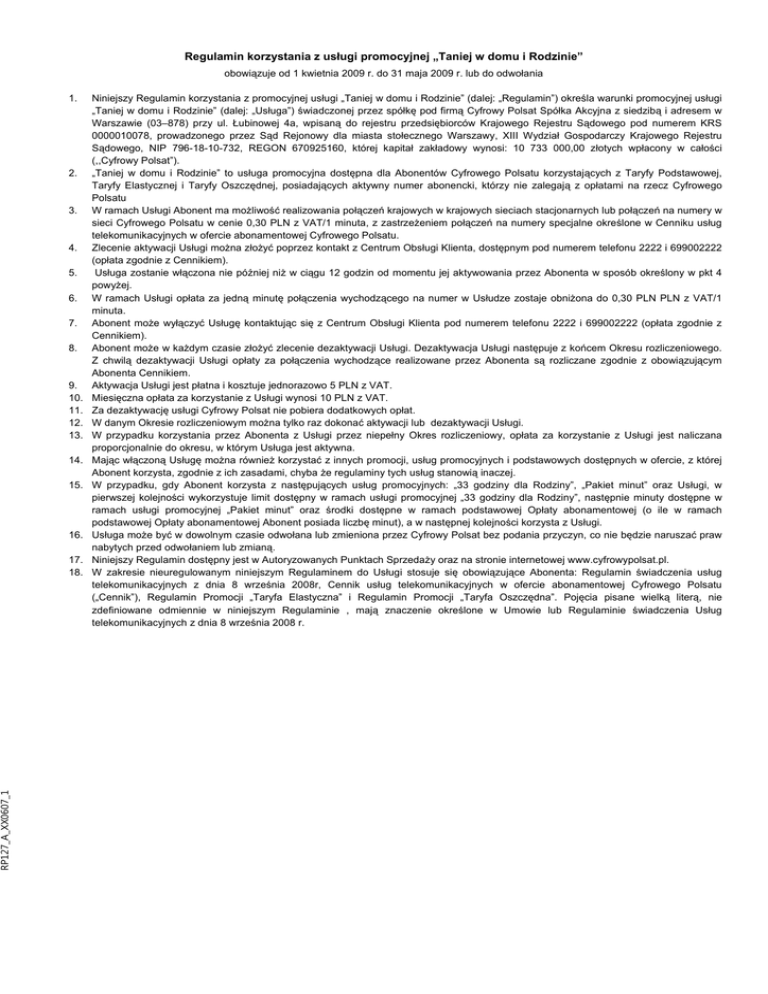 RP127_A_XX0607_1 Regulamin korzystania z usługi promocyjnej „Taniej w domu i Rodzinie” obowiązuje od 1 kwietnia 2009 r. do 31 maja 2009 r. lub do odwołania 1. 2. 3. 4. 5. 6. 7. 8. 9. 10. 11. 12. 13. 14. 15. 16. 17. 18. Niniejszy Regulamin korzystania z promocyjnej usługi „Taniej w domu i Rodzinie” (dalej: „Regulamin”) określa warunki promocyjnej usługi „Taniej w domu i Rodzinie” (dalej: „Usługa”) świadczonej przez spółkę pod firmą Cyfrowy Polsat Spółka Akcyjna z siedzibą i adresem w Warszawie (03–878) przy ul. Łubinowej 4a, wpisaną do rejestru przedsiębiorców Krajowego Rejestru Sądowego pod numerem KRS 0000010078, prowadzonego przez Sąd Rejonowy dla miasta stołecznego Warszawy, XIII Wydział Gospodarczy Krajowego Rejestru Sądowego, NIP 796-18-10-732, REGON 670925160, której kapitał zakładowy wynosi: 10 733 000,00 złotych wpłacony w całości (,,Cyfrowy Polsat”). „Taniej w domu i Rodzinie” to usługa promocyjna dostępna dla Abonentów Cyfrowego Polsatu korzystających z Taryfy Podstawowej, Taryfy Elastycznej i Taryfy Oszczędnej, posiadających aktywny numer abonencki, którzy nie zalegają z opłatami na rzecz Cyfrowego Polsatu W ramach Usługi Abonent ma możliwość realizowania połączeń krajowych w krajowych sieciach stacjonarnych lub połączeń na numery w sieci Cyfrowego Polsatu w cenie 0,30 PLN z VAT/1 minuta, z zastrzeżeniem połączeń na numery specjalne określone w Cenniku usług telekomunikacyjnych w ofercie abonamentowej Cyfrowego Polsatu. Zlecenie aktywacji Usługi można złożyć poprzez kontakt z Centrum Obsługi Klienta, dostępnym pod numerem telefonu 2222 i 699002222 (opłata zgodnie z Cennikiem). Usługa zostanie włączona nie później niż w ciągu 12 godzin od momentu jej aktywowania przez Abonenta w sposób określony w pkt 4 powyżej. W ramach Usługi opłata za jedną minutę połączenia wychodzącego na numer w Usłudze zostaje obniżona do 0,30 PLN PLN z VAT/1 minuta. Abonent może wyłączyć Usługę kontaktując się z Centrum Obsługi Klienta pod numerem telefonu 2222 i 699002222 (opłata zgodnie z Cennikiem). Abonent może w każdym czasie złożyć zlecenie dezaktywacji Usługi. Dezaktywacja Usługi następuje z końcem Okresu rozliczeniowego. Z chwilą dezaktywacji Usługi opłaty za połączenia wychodzące realizowane przez Abonenta są rozliczane zgodnie z obowiązującym Abonenta Cennikiem. Aktywacja Usługi jest płatna i kosztuje jednorazowo 5 PLN z VAT. Miesięczna opłata za korzystanie z Usługi wynosi 10 PLN z VAT. Za dezaktywację usługi Cyfrowy Polsat nie pobiera dodatkowych opłat. W danym Okresie rozliczeniowym można tylko raz dokonać aktywacji lub dezaktywacji Usługi. W przypadku korzystania przez Abonenta z Usługi przez niepełny Okres rozliczeniowy, opłata za korzystanie z Usługi jest naliczana proporcjonalnie do okresu, w którym Usługa jest aktywna. Mając włączoną Usługę można również korzystać z innych promocji, usług promocyjnych i podstawowych dostępnych w ofercie, z której Abonent korzysta, zgodnie z ich zasadami, chyba że regulaminy tych usług stanowią inaczej. W przypadku, gdy Abonent korzysta z następujących usług promocyjnych: „33 godziny dla Rodziny”, „Pakiet minut” oraz Usługi, w pierwszej kolejności wykorzystuje limit dostępny w ramach usługi promocyjnej „33 godziny dla Rodziny”, następnie minuty dostępne w ramach usługi promocyjnej „Pakiet minut” oraz środki dostępne w ramach podstawowej Opłaty abonamentowej (o ile w ramach podstawowej Opłaty abonamentowej Abonent posiada liczbę minut), a w następnej kolejności korzysta z Usługi. Usługa może być w dowolnym czasie odwołana lub zmieniona przez Cyfrowy Polsat bez podania przyczyn, co nie będzie naruszać praw nabytych przed odwołaniem lub zmianą. Niniejszy Regulamin dostępny jest w Autoryzowanych Punktach Sprzedaży oraz na stronie internetowej www.cyfrowypolsat.pl. W zakresie nieuregulowanym niniejszym Regulaminem do Usługi stosuje się obowiązujące Abonenta: Regulamin świadczenia usług telekomunikacyjnych z dnia 8 września 2008r, Cennik usług telekomunikacyjnych w ofercie abonamentowej Cyfrowego Polsatu („Cennik”), Regulamin Promocji „Taryfa Elastyczna” i Regulamin Promocji „Taryfa Oszczędna”. Pojęcia pisane wielką literą, nie zdefiniowane odmiennie w niniejszym Regulaminie , mają znaczenie określone w Umowie lub Regulaminie świadczenia Usług telekomunikacyjnych z dnia 8 września 2008 r.