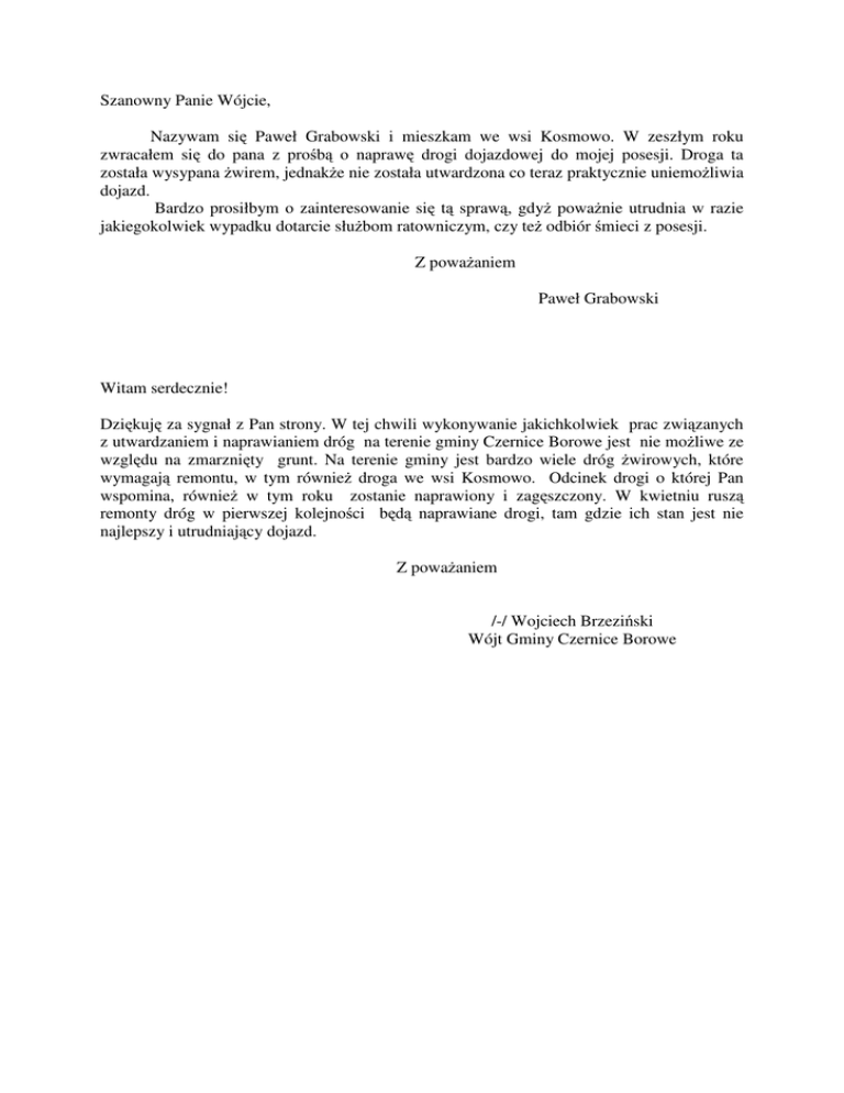 Szanowny Panie Wójcie, Nazywam się Paweł Grabowski i mieszkam we wsi Kosmowo. W zeszłym roku zwracałem się do pana z prośbą o naprawę drogi dojazdowej do mojej posesji. Droga ta została wysypana żwirem, jednakże nie została utwardzona co teraz praktycznie uniemożliwia dojazd. Bardzo prosiłbym o zainteresowanie się tą sprawą, gdyż poważnie utrudnia w razie jakiegokolwiek wypadku dotarcie służbom ratowniczym, czy też odbiór śmieci z posesji. Z poważaniem Paweł Grabowski Witam serdecznie! Dziękuję za sygnał z Pan strony. W tej chwili wykonywanie jakichkolwiek prac związanych z utwardzaniem i naprawianiem dróg na terenie gminy Czernice Borowe jest nie możliwe ze względu na zmarznięty grunt. Na terenie gminy jest bardzo wiele dróg żwirowych, które wymagają remontu, w tym również droga we wsi Kosmowo. Odcinek drogi o której Pan wspomina, również w tym roku zostanie naprawiony i zagęszczony. W kwietniu ruszą remonty dróg w pierwszej kolejności będą naprawiane drogi, tam gdzie ich stan jest nie najlepszy i utrudniający dojazd. Z poważaniem /-/ Wojciech Brzeziński Wójt Gminy Czernice Borowe