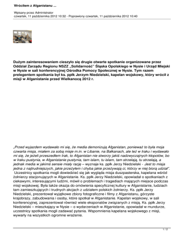 Wróciłem z Afganistanu ... Wpisany przez Administrator czwartek, 11 października 2012 10:32 - Poprawiony czwartek, 11 października 2012 10:40 Dużym zainteresowaniem cieszyło się drugie otwarte spotkanie organizowane przez Oddział Zarządu Regionu NSZZ „Solidarność” Śląska Opolskiego w Nysie i Urząd Miejski w Nysie w sali konferencyjnej Ośrodka Pomocy Społecznej w Nysie. Tym razem prelegentem spotkania był ks. ppłk Jerzym Niedzielski, kapelan wojskowy, który wrócił z misji w Afganistanie przed Wielkanocą 2012 r. „Przed wyjazdem wydawało mi się, że media demonizują Afganistan, ponieważ to była moja czwarta misja, miałem za sobą misje m.in. w Libanie, na Bałkanach, ale też w Iraku i wydawało mi się, że jeżeli przeszedłem Irak, to Afganistan nie stworzy jakiś nadzwyczajnych kłopotów, bo w Iraku pustynia, w Afganistanie pustynia, tam islam, tu islam, tam strzelają, tu strzelają, a jednak media w jakimś sensie miały rację – wyznaje ks. ppłk Jerzy Niedzielski - Jest to misja jedna z najtrudniejszych, jakie przeżyłem i chyba jakie przeżywają ci, którzy w niej biorą udział”. Uczestnicy spotkania mogli dowiedzieć się jak wygląda misja duszpasterska, kapelana wśród żołnierzy stacjonujących w Afganistanie. Ks. ppłk Jerzy Niedzielski, opowiadał o spotkaniach z ciekawymi, interesującymi ludźmi, mówił o problemach i tragediach mających miejsce podczas misji wojskowej. Była także okazja do omówienia specyficznej kultury w Afganistanie, ludziach tam zamieszkujących i trudnych akcjach z udziałem polskich żołnierzy. Ks. ppłk Jerzy Niedzielski, prezentował wyjątkowe zbiory fotograficzne i filmy z Afganistanu, górzyste krajobrazy, zabudowania i osoby, które spotkał w Afganistanie. Kapelan wojskowy, w sali konferencyjnej, zaprezentował również wiele eksponatów związanych z misją. Ks. ppłk Jerzy Niedzielski – mieszkający w Nysie – o wydarzeniach w Afganistanie, opowiadał w mundurze, uczestnicy spotkania mogli zadawać pytania. Wspomnienia kapelana wojskowego z misji, wywarły na wszystkich ogromne wrażenie. 1/2 Wróciłem z Afganistanu ... Wpisany przez Administrator czwartek, 11 października 2012 10:32 - Poprawiony czwartek, 11 października 2012 10:40 Od listopada 2008 roku zmieniła się organizacja PKW w Afganistanie. Powstały Polskie Siły Zadaniowe (Polish Task Force White Eagle), które jako jedna z Brygadowych Grup Bojowych w Dowództwie Regionalnym Wschód (Regional Command East) przejęły odpowiedzialność za prowincję Ghazni. 7 kwietnia 2012 r. w Afganistanie w prowincji Ghazni zakończył się proces rozmieszczania Polskich Sił Zadaniowych zgodnie w wcześniejszymi międzynarodowymi ustaleniami. Od tego dnia polscy żołnierze odpowiadają za północna część prowincji Ghazni. Strefa odpowiedzialności obejmuje dziewięć dystryktów: Nawor, Ajiristan, Rashidan, Jaghato, Waghez, Ghazni, Zanakhan, Khawja Omari, Koghani. Wszystkie siły Sojuszu podlegają natowskiemu dowództwu operacji. Polski kontyngent rozmieszczony jest w bazach w prowincji: Ghazni, Vulcan, Waghez oraz w bazie sił koalicyjnych w Bagram (źródło MON, www.isaf.wp.mil.pl). Spotkania z interesującymi ludźmi, na ciekawe tematy, będą organizowane cyklicznie, raz w miesiącu przez Oddział Zarządu Regionu NSZZ „Solidarność” Śląska Opolskiego w Nysie i Urząd Miejski w Nysie. Źródło informacji: www.nysa.eu/aktualności Więcej zdjęć na stronie: www.nysa.eu/aktualności 2/2