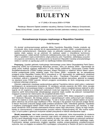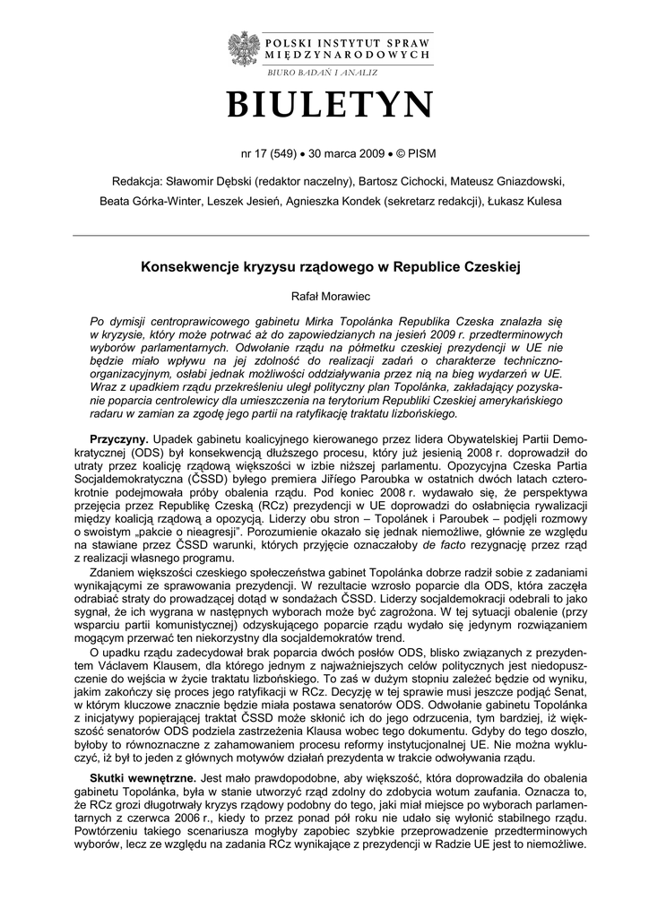 BIURO BADAŃ I ANALIZ BIULETYN nr 17 (549) 30 marca 2009 © PISM Redakcja: Sławomir Dębski (redaktor naczelny), Bartosz Cichocki, Mateusz Gniazdowski, Beata Górka-Winter, Leszek Jesień, Agnieszka Kondek (sekretarz redakcji), Łukasz Kulesa Konsekwencje kryzysu rządowego w Republice Czeskiej Rafał Morawiec Po dymisji centroprawicowego gabinetu Mirka Topolánka Republika Czeska znalazła się w kryzysie, który może potrwać aż do zapowiedzianych na jesień 2009 r. przedterminowych wyborów parlamentarnych. Odwołanie rządu na półmetku czeskiej prezydencji w UE nie będzie miało wpływu na jej zdolność do realizacji zadań o charakterze technicznoorganizacyjnym, osłabi jednak możliwości oddziaływania przez nią na bieg wydarzeń w UE. Wraz z upadkiem rządu przekreśleniu uległ polityczny plan Topolánka, zakładający pozyskanie poparcia centrolewicy dla umieszczenia na terytorium Republiki Czeskiej amerykańskiego radaru w zamian za zgodę jego partii na ratyfikację traktatu lizbońskiego. Przyczyny. Upadek gabinetu koalicyjnego kierowanego przez lidera Obywatelskiej Partii Demokratycznej (ODS) był konsekwencją dłuższego procesu, który już jesienią 2008 r. doprowadził do utraty przez koalicję rządową większości w izbie niższej parlamentu. Opozycyjna Czeska Partia Socjaldemokratyczna (ČSSD) byłego premiera Jiříego Paroubka w ostatnich dwóch latach czterokrotnie podejmowała próby obalenia rządu. Pod koniec 2008 r. wydawało się, że perspektywa przejęcia przez Republikę Czeską (RCz) prezydencji w UE doprowadzi do osłabnięcia rywalizacji między koalicją rządową a opozycją. Liderzy obu stron – Topolánek i Paroubek – podjęli rozmowy o swoistym „pakcie o nieagresji”. Porozumienie okazało się jednak niemożliwe, głównie ze względu na stawiane przez ČSSD warunki, których przyjęcie oznaczałoby de facto rezygnację przez rząd z realizacji własnego programu. Zdaniem większości czeskiego społeczeństwa gabinet Topolánka dobrze radził sobie z zadaniami wynikającymi ze sprawowania prezydencji. W rezultacie wzrosło poparcie dla ODS, która zaczęła odrabiać straty do prowadzącej dotąd w sondażach ČSSD. Liderzy socjaldemokracji odebrali to jako sygnał, że ich wygrana w następnych wyborach może być zagrożona. W tej sytuacji obalenie (przy wsparciu partii komunistycznej) odzyskującego poparcie rządu wydało się jedynym rozwiązaniem mogącym przerwać ten niekorzystny dla socjaldemokratów trend. O upadku rządu zadecydował brak poparcia dwóch posłów ODS, blisko związanych z prezydentem Václavem Klausem, dla którego jednym z najważniejszych celów politycznych jest niedopuszczenie do wejścia w życie traktatu lizbońskiego. To zaś w dużym stopniu zależeć będzie od wyniku, jakim zakończy się proces jego ratyfikacji w RCz. Decyzję w tej sprawie musi jeszcze podjąć Senat, w którym kluczowe znacznie będzie miała postawa senatorów ODS. Odwołanie gabinetu Topolánka z inicjatywy popierającej traktat ČSSD może skłonić ich do jego odrzucenia, tym bardziej, iż większość senatorów ODS podziela zastrzeżenia Klausa wobec tego dokumentu. Gdyby do tego doszło, byłoby to równoznaczne z zahamowaniem procesu reformy instytucjonalnej UE. Nie można wykluczyć, iż był to jeden z głównych motywów działań prezydenta w trakcie odwoływania rządu. Skutki wewnętrzne. Jest mało prawdopodobne, aby większość, która doprowadziła do obalenia gabinetu Topolánka, była w stanie utworzyć rząd zdolny do zdobycia wotum zaufania. Oznacza to, że RCz grozi długotrwały kryzys rządowy podobny do tego, jaki miał miejsce po wyborach parlamentarnych z czerwca 2006 r., kiedy to przez ponad pół roku nie udało się wyłonić stabilnego rządu. Powtórzeniu takiego scenariusza mogłyby zapobiec szybkie przeprowadzenie przedterminowych wyborów, lecz ze względu na zadania RCz wynikające z prezydencji w Radzie UE jest to niemożliwe. 1998 Polski Instytut Spraw Międzynarodowych Liderom ODS i ČSSD udało się wstępnie uzgodnić, że wybory odbędą się w październiku 2009 r. Nie porozumieli się jednak co do kształtu gabinetu, który do tego czasu pokieruje sprawami kraju. W dużym stopniu zależeć będzie to od tego, komu prezydent powierzy misję utworzenia rządu. Klaus zapowiedział już, że powoła tylko tego kandydata, który uzyska poparcie stabilnej większości w izbie niższej, wyłonionej w drodze porozumienia partii politycznych, nie zaś – jak to miało miejsce po wyborach 2006 r. – pozyskania przez koalicję kilku posłów z innych ugrupowań. Spełnienie warunków prezydenta w praktyce byłoby możliwe jedynie w przypadku zawarcia porozumienia przez ODS i ČSSD, co wykluczają jak dotąd liderzy obu partii, mając nadzieję na realizację własnych planów politycznych. ODS, która pozostaje największym ugrupowaniem w izbie niższej parlamentu, domaga się, aby to Topolánek znowu otrzymał nominację na premiera i pokierował rządem aż do wyborów. Socjaldemokraci są gotowi tolerować rząd Topolánka do czasu zakończenia czeskiej prezydencji pod pewnymi warunkami (odwołanie ministra spraw wewnętrznych i prokuratora generalnego), potem jednak chcieliby powołania „gabinetu ekspertów” (przy wsparciu komunistów), na którego skład mieliby decydujący wpływ. Prawdopodobnie liderzy obu ugrupowań ostatecznie zaakceptują warunki prezydenta, bowiem w przeciwnym przypadku Klaus, argumentując, iż sprawami kraju nie może długotrwale administrować zdymisjonowany gabinet Topolanka, mógłby powierzyć misję utworzenia rządu któremuś ze swoich politycznych sprzymierzeńców. Wprawdzie taki rząd nie miałby szans na zyskanie wotum zaufania, lecz w praktyce mógłby działać przez dłuższy czas, bowiem konstytucja RCz nie wiąże prezydenta żadnymi terminami w kwestii mianowania nowego premiera w miejsce zdymisjonowanego. W interesie Topolánka i Paroub