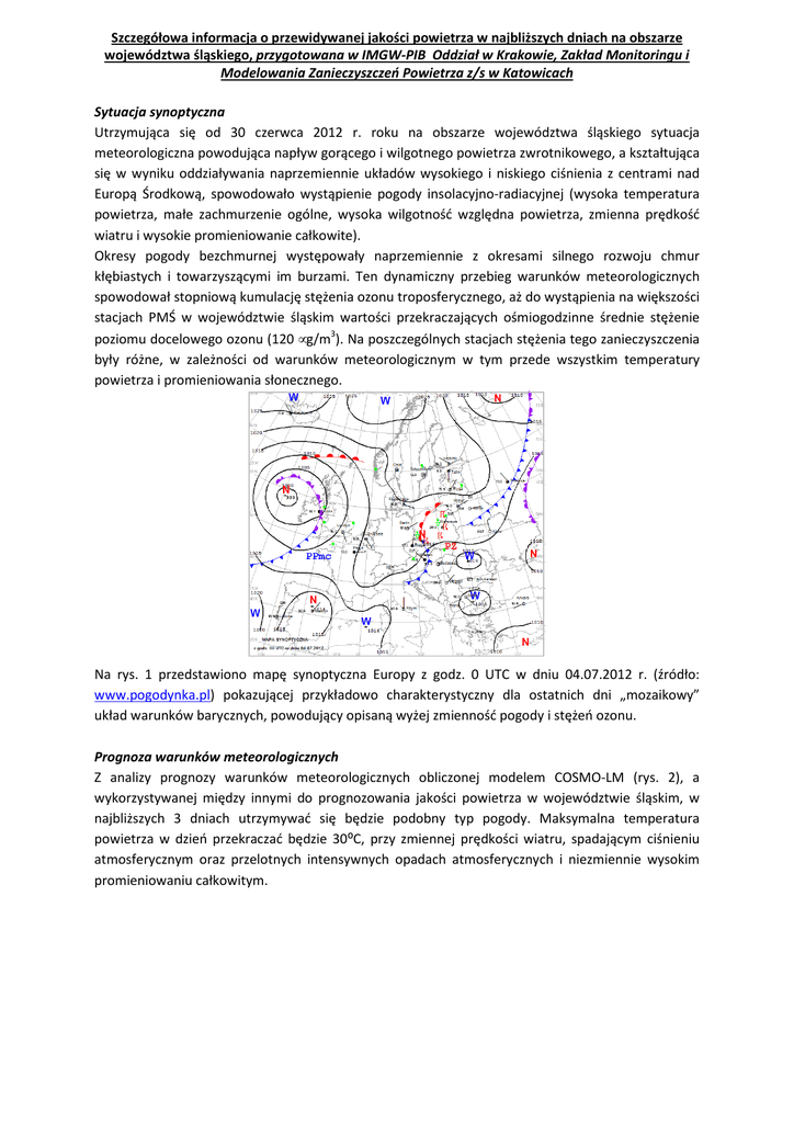 Szczegółowa informacja o przewidywanej jakości powietrza w najbliższych dniach na obszarze województwa śląskiego, przygotowana w IMGW-PIB Oddział w Krakowie, Zakład Monitoringu i Modelowania Zanieczyszczeń Powietrza z/s w Katowicach Sytuacja synoptyczna Utrzymująca się od 30 czerwca 2012 r. roku na obszarze województwa śląskiego sytuacja meteorologiczna powodująca napływ gorącego i wilgotnego powietrza zwrotnikowego, a kształtująca się w wyniku oddziaływania naprzemiennie układów wysokiego i niskiego ciśnienia z centrami nad Europą Środkową, spowodowało wystąpienie pogody insolacyjno-radiacyjnej (wysoka temperatura powietrza, małe zachmurzenie ogólne, wysoka wilgotność względna powietrza, zmienna prędkość wiatru i wysokie promieniowanie całkowite). Okresy pogody bezchmurnej występowały naprzemiennie z okresami silnego rozwoju chmur kłębiastych i towarzyszącymi im burzami. Ten dynamiczny przebieg warunków meteorologicznych spowodował stopniową kumulację stężenia ozonu troposferycznego, aż do wystąpienia na większości stacjach PMŚ w województwie śląskim wartości przekraczających ośmiogodzinne średnie stężenie poziomu docelowego ozonu (120 µg/m3). Na poszczególnych stacjach stężenia tego zanieczyszczenia były różne, w zależności od warunków meteorologicznym w tym przede wszystkim temperatury powietrza i promieniowania słonecznego. Na rys. 1 przedstawiono mapę synoptyczna Europy z godz. 0 UTC w dniu 04.07.2012 r. (źródło: www.pogodynka.pl) pokazującej przykładowo charakterystyczny dla ostatnich dni „mozaikowy” układ warunków barycznych, powodujący opisaną wyżej zmienność pogody i stężeń ozonu. Prognoza warunków meteorologicznych Z analizy prognozy warunków meteorologicznych obliczonej modelem COSMO-LM (rys. 2), a wykorzystywanej między innymi do prognozowania jakości powietrza w województwie śląskim, w najbliższych 3 dniach utrzymywać się będzie podobny typ pogody. Maksymalna temperatura powietrza w dzień przekraczać będzie 30⁰C, przy zmiennej prędkości wiatru, spadającym ciśnieniu atmosferycznym oraz przelotnych intensywnych opadach atmosferycznych i niezmiennie wysokim promieniowaniu całkowitym. 35 33 Temperatura powietrza [°C] 31 29 Katowice Bielsko-Biała Częstochowa Racibórz 27 25 23 21 19 17 15 Ciśnienie atmosferyczne n.p.m. [hPa] 4.VII 5.VII 6.VII 7.VII 1016 1015 1014 1013 Katowice Bielsko-Biała Częstochowa Racibórz 1012 1011 1010 1009 1008 4.VII 5.VII 6.VII 7.VII Suma opadu atmosferycznego [mm] 7 6 5 Katowice 4 Bielsko-Biała 3 Częstochowa Racibórz 2 1 0 4.VII 5.VII 6.VII 7.VII 6 Prędkość wiatru [m/s] 5 4 Katowice Bielsko-Biała 3 Częstochowa 2 Racibórz 1 0 4.VII 5.VII 6.VII 7.VII Rys. 2 przedstawia prognozowany przebieg temperatury powietrza, ciśnienia atmosferycznego, prędkości wiatru i opadu atmosferycznego dla Bieska-Biała, Częstochowa, Katowice i Raciborza z modelu COSMO - prognoza od O UTC na 78 godzin w przód z krokiem 1-godzinnym (źródło danych: IMGW-PIB Dział Numerycznych Prognoz Meteorologicznych COSMO).