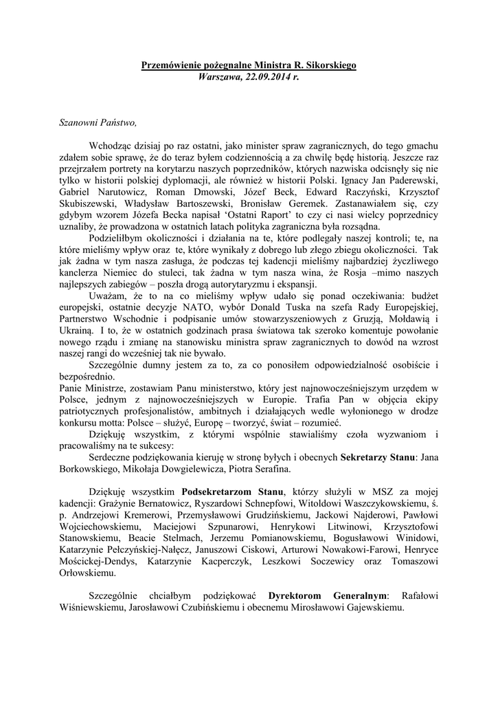 Przemówienie pożegnalne Ministra R. Sikorskiego Warszawa, 22.09.2014 r. Szanowni Państwo, Wchodząc dzisiaj po raz ostatni, jako minister spraw zagranicznych, do tego gmachu zdałem sobie sprawę, że do teraz byłem codziennością a za chwilę będę historią. Jeszcze raz przejrzałem portrety na korytarzu naszych poprzedników, których nazwiska odcisnęły się nie tylko w historii polskiej dyplomacji, ale również w historii Polski. Ignacy Jan Paderewski, Gabriel Narutowicz, Roman Dmowski, Józef Beck, Edward Raczyński, Krzysztof Skubiszewski, Władysław Bartoszewski, Bronisław Geremek. Zastanawiałem się, czy gdybym wzorem Józefa Becka napisał ‘Ostatni Raport’ to czy ci nasi wielcy poprzednicy uznaliby, że prowadzona w ostatnich latach polityka zagraniczna była rozsądna. Podzieliłbym okoliczności i działania na te, które podlegały naszej kontroli; te, na które mieliśmy wpływ oraz te, które wynikały z dobrego lub złego zbiegu okoliczności. Tak jak żadna w tym nasza zasługa, że podczas tej kadencji mieliśmy najbardziej życzliwego kanclerza Niemiec do stuleci, tak żadna w tym nasza wina, że Rosja –mimo naszych najlepszych zabiegów – poszła drogą autorytaryzmu i ekspansji. Uważam, że to na co mieliśmy wpływ udało się ponad oczekiwania: budżet europejski, ostatnie decyzje NATO, wybór Donald Tuska na szefa Rady Europejskiej, Partnerstwo Wschodnie i podpisanie umów stowarzyszeniowych z Gruzją, Mołdawią i Ukrainą. I to, że w ostatnich godzinach prasa światowa tak szeroko komentuje powołanie nowego rządu i zmianę na stanowisku ministra spraw zagranicznych to dowód na wzrost naszej rangi do wcześniej tak nie bywało. Szczególnie dumny jestem za to, za co ponosiłem odpowiedzialność osobiście i bezpośrednio. Panie Ministrze, zostawiam Panu ministerstwo, który jest najnowocześniejszym urzędem w Polsce, jednym z najnowocześniejszych w Europie. Trafia Pan w objęcia ekipy patriotycznych profesjonalistów, ambitnych i działających wedle wyłonionego w drodze konkursu motta: Polsce – służyć, Europę – tworzyć, świat – rozumieć. Dziękuję wszystkim, z którymi wspólnie stawialiśmy czoła wyzwaniom i pracowaliśmy na te sukcesy: Serdeczne podziękowania kieruję w stronę byłych i obecnych Sekretarzy Stanu: Jana Borkowskiego, Mikołaja Dowgielewicza, Piotra Serafina. Dziękuję wszystkim Podsekretarzom Stanu, którzy służyli w MSZ za mojej kadencji: Grażynie Bernatowicz, Ryszardowi Schnepfowi, Witoldowi Waszczykowskiemu, ś. p. Andrzejowi Kremerowi, Przemysławowi Grudzińskiemu, Jackowi Najderowi, Pawłowi Wojciechowskiemu, Maciejowi Szpunarowi, Henrykowi Litwinowi, Krzysztofowi Stanowskiemu, Beacie Stelmach, Jerzemu Pomianowskiemu, Bogusławowi Winidowi, Katarzynie Pełczyńskiej-Nałęcz, Januszowi Ciskowi, Arturowi Nowakowi-Farowi, Henryce Mościckej-Dendys, Katarzynie Kacperczyk, Leszkowi Soczewicy oraz Tomaszowi Orłowskiemu. Szczególnie chciałbym podziękować Dyrektorom Generalnym: Rafałowi Wiśniewskiemu, Jarosławowi Czubińskiemu i obecnemu Mirosławowi Gajewskiemu. Dziękuję Dyrektorom Sekretariatu Ministra, którzy o każdej porze dnia i nocy pilnowali spraw bezpośrednio mnie dotyczących: Tadeuszowi Chomickiemu, Cezaremu Królowi, Tomaszowi Chłoniowi oraz Marcinowi Wilczkowi. Uważam, że miałem najlepszych rzeczników w rządzie: Piotra Paszkowskiego, Marcina Bosackiego i Marcina Wojciechowskiego. Dzielnie wspierał mnie gabinet polityczny: Michał Marcinkiewicz, Aleksandra Klimont i Ewa Jerzykowska. Szczególne podziękowania należą się osobom, które pracowały ze mną najbliżej, nieocenionym paniom z sekretariatu osobistego Małgorzacie Strazińskiej i Annie Leszczyńskiej, które wytrzymały ze mną całe siedem lat. Ekipom BOR dziękuję za skuteczną ochronę. Słowa wdzięczności kieruję do wszystkich szefów placówek dyplomatycznych, dyrektorów biur i departamentów oraz wszystkich pracowników MSZ. Ale najbardziej dziękuję mojej żonie, Annie. Dziękuję i przepraszam: za ciągłe odbieranie blackberry, za weekendy i urlopy przerwane kryzysami międzynarodowymi, i za wystawianie naszej prywatności na wścibskość mediów. Pozdrawiam Aleksandra i Tadeusza, dla których Tata nie zawsze miał dość czasu. Moi drodzy, Praca z Wami w MSZ to było wyzwanie, ale zawsze zaszczyt i przyjemność. Panie Ministrze, Przekazuję Panu ministerstwo, w moim subiektywnym osądzie, w lepszym stanie niż je zastałem. Polska znaczy więcej w polityce zagranicznej, ale koniunktura wokół naszego kraju, nasze otoczenie międzynarodowe jest trudniejsze niż wtedy gdy ja zaczynałem. Będzie miał Pan nie lada wyzwanie, niezmiernie będę Pana wspierał. A oponentom przypomnimy słowa Winstona Churchilla, który miał powiedzieć: „Masz wrogów? To dobrze. To znaczy, czegoś w życiu broniłeś.” Szanowni Państwo, Panie Ministrze, powodzenia.