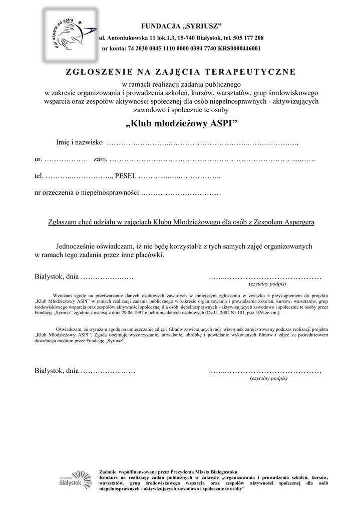 FUNDACJA „SYRIUSZ” ul. Antoniukowska 11 lok.1.3, 15-740 Białystok, tel. 505 177 208 nr konta: 74 2030 0045 1110 0000 0394 7740 KRS0000446001 ZGŁOSZENIE NA ZAJĘCIA TERAPEUTYCZNE w ramach realizacji zadania publicznego w zakresie organizowania i prowadzenia szkoleń, kursów, warsztatów, grup środowiskowego wsparcia oraz zespołów aktywności społecznej dla osób niepełnosprawnych - aktywizujących zawodowo i społecznie te osoby „Klub młodzieżowy ASPI” Imię i nazwisko ………….…………..…………………………..………..………., ur. ……………… zam. ………………………....……………………………………….....…… tel. ………..…………….., PESEL ………...........…………….. nr orzeczenia o niepełnosprawności …………………………… Zgłaszam chęć udziału w zajęciach Klubu Młodzieżowego dla osób z Zespołem Aspergera Jednocześnie oświadczam, iż nie będę korzystał/a z tych samych zajęć organizowanych w ramach tego zadania przez inne placówki. Białystok, dnia …………….…… ..…...……………………………… (czytelny podpis) Wyrażam zgodę na przetwarzanie danych osobowych zawartych w niniejszym zgłoszeniu w związku z przystąpieniem do projektu „Klub Młodzieżowy ASPI” w ramach realizacji zadania publicznego w zakresie organizowania i prowadzenia szkoleń, kursów, warsztatów, grup środowiskowego wsparcia oraz zespołów aktywności społecznej dla osób niepełnosprawnych - aktywizujących zawodowo i społecznie te osoby przez Fundację „Syriusz” zgodnie z ustawą z dnia 29.06.1997 o ochronie danych osobowych (Dz.U. 2002 Nr 101, poz. 926 ze zm.). Oświadczam, że wyrażam zgodę na umieszczanie zdjęć i filmów zawierających mój wizerunek zarejestrowany podczas realizacji projektu „Klub Młodzieżowy ASPI”. Zgoda obejmuje wykorzystanie, utrwalanie, obróbkę i powielanie wykonanych filmów i zdjęć za pośrednictwem dowolnego medium przez Fundację „Syriusz”. Białystok, dnia ……………..…… ..…...……………………………… (czytelny podpis) Zadanie współfinansowane przez Prezydenta Miasta Białegostoku. Konkurs na realizację zadań publicznych w zakresie „organizowania i prowadzenia szkoleń, kursów, warsztatów, grup środowiskowego wsparcia oraz zespołów aktywności społecznej dla osób niepełnosprawnych - aktywizujących zawodowo i społecznie te osoby”