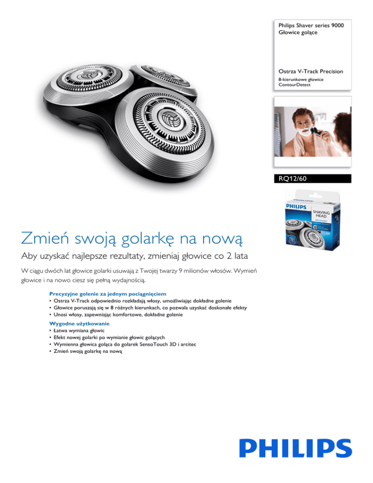 Philips Shaver series 9000 Głowice golące Ostrza V-Track Precision 8-kierunkowe głowice ContourDetect RQ12/60 Zmień swoją golarkę na nową Aby uzyskać najlepsze rezultaty, zmieniaj głowice co 2 lata W ciągu dwóch lat głowice golarki usuwają z Twojej twarzy 9 milionów włosów. Wymień głowice i na nowo ciesz się pełną wydajnością. Precyzyjne golenie za jednym pociągnięciem • Ostrza V-Track odpowiednio rozkładają włosy, umożliwiając dokładne golenie • Głowice poruszają się w 8 różnych kierunkach, co pozwala uzyskać doskonałe efekty • Unosi włosy, zapewniając komfortowe, dokładne golenie Wygodne użytkowanie • Łatwa wymiana głowic • Efekt nowej golarki po wymianie głowic golących • Wymienna głowica goląca do golarek SensoTouch 3D i arcitec • Zmień swoją golarkę na nową RQ12/60 Głowice golące Ostrza V-Track Precision 8-kierunkowe głowice ContourDetect Zalety Ostrza V-Track Precision Super Lift & Cut Action wymianie głowic golących. Po ich wymianie można zresetować wskaźnik wymiany, naciskając i przytrzymując wyłącznik golarki przez ponad 5 sekund. W przeciwnym razie wskaźnik wymiany wyłączy się automatycznie po kolejnych 9 goleniach. Zgodność Opatentowane ostrza V-Track Precision delikatnie ustawiają każdy włos pod optymalnym kątem, bez względu na jego długość i kąt przylegania do skóry. Rezultat to 30% dokładniejsze golenie przy mniejszej liczbie pociągnięć oraz skóra w doskonałym stanie. Dokładniejsze golenie dzięki podwójnym ostrzom systemu Super Lift & Cut Action. Pierwsze ostrze unosi włoski, a drugie delikatnie goli je tuż przy skórze, zapewniając prawdziwą gładkość. Prosta wymiana Wymienna głowica RQ12+ pasuje do wszystkich golarek SensoTouch 3D (RQ12xx) i arcitec (RQ10xx). 8-kierunkowe głowice ContourDetect Zmień swoją golarkę na nową Łatwa konserwacja elementu golącego dzięki wygodnemu zdejmowaniu i nakładaniu. 8-kierunkowe głowice ContourDetect idealnie dopasowują się do kształtu twarzy i szyi. Wychwycisz 20% więcej włosów za każdym pociągnięciem, dzięki czemu golenie będzie niezwykle dokładne i gładkie. Twoja golarka jak nowa Aby przywrócić pełną wydajność, wymieniaj głowice golące co 2 lata. Najnowsze golarki firmy Philips są wyposażone we wbudowaną funkcję przypomnienia o RQ12/60 Głowice golące Ostrza V-Track Precision 8-kierunkowe głowice ContourDetect Dane techniczne Głowice golące • Do modelu: arcitec (RQ10xx), SensoTouch 3D (RQ12xx) Akcesoria • Dołączone do zestawu: Uchwyt pierścienia ustalającego, Nasadka zabezpieczająca • Data wydania 2016-12-07 © 2016 Koninklijke Philips N.V. Wszelkie prawa zastrzeżone. Wersja: 4.1.1 Dane techniczne mogą ulec zmianie bez powiadomienia. Znaki towarowe są własnością Koninklijke Philips N.V. lub własnością odpowiednich firm. EAN: 08 71010 37020 92 www.philips.com