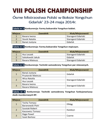 Tabela nr 1. Konkurencja: Formy bokserskie Yongchun kobiet. Miejsce Zawodnik 1 Basara Iwona 2 Stosik Natalia 3 Banaś Justyna Klub/Miejscowość Starogard Gdański Starogard Gdański Gdańsk Tabela nr 2. Konkurencja: Formy bokserskie Yongchun mężczyzn. Miejsce Zawodnik 1 Hus Leszek 2 Sokołowski Jakub 3 Basara Mateusz Klub/Miejscowość Starogard Gdański Gdańsk Starogard Gdański Tabela nr 3. Konkurencja: Techniki samoobrony Yongchun par mieszanych. Miejsce 1 2 3 Zawodnik Banaś Justyna Przytarski Mateusz Wica Natalia Hus Leszek Basara Iwona Basara Mateusz Klub/Miejscowość Gdańsk Starogard Gdański Starogard Gdański Tabela nr 4. Konkurencja: Techniki samoobrony Yongchun funkcjonariuszy służb mundurowych RP. Miejsce 1 2 3 Zawodnik Tocha Tomasz Baranowski Piotr Szostak Robert Kaszowicz Tomasz Dęga Paweł Szast Bartosz Klub/Miejscowość Elbląg Kwidzyn Czarne Tabela nr 5. Konkurencja: Full-contact Yongchun Sanshou, 77-85 kg. Miejsce Zawodnik 1 Przybysz Mariusz 2 Baranowski Piotr 3 Chludziński Eryk Klub/Miejscowość Bartoszyce Elbląg Puck Tabela nr 6. Konkurencja: Full-contact Yongchun Sanshou, powyżej 86-95 kg. Miejsce Zawodnik 1 Śmigaj Łukasz 2 Zieliński Artur 3 Tylicki Krzysztof Klub/Miejscowość Środa Wielkopolska Elbląg Kętrzyn Tabela nr 7. Konkurencja: Full-contact Yongchun Sanshou, 96-103 kg. Miejsce Zawodnik 1 Jakóbowski Dawid 2 Karpus Paweł 3 Kornet Zbigniew Klub/Miejscowość Gdańsk Tuchola Gdańsk Tabela nr 8. Konkurencja: Full-contact Yongchun Sanshou, 109-124 kg. Miejsce Zawodnik 1 Wysocki Michał 2 Szlachtowski Janusz 3 Krefta Jarosław Klub/Miejscowość Gdańsk Czarne Sztum Sędzia Główny Zawodów: Krzysztof Radziejowski