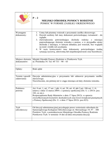 P–2 MIEJSKI OŚRODEK POMOCY RODZINIE POMOC W FORMIE ZASIŁKU OKRESOWEGO Wymagane dokumenty: 1. Ustny lub pisemny wniosek o przyznanie zasiłku okresowego. 2. Dowód osobisty lub inny dokument potwierdzający tożsamość - do wglądu. 3. Zaświadczenia potwierdzające dochody rodziny z miesiąca poprzedzającego złożenie wniosku o pomoc, a w przypadku utraty dochodu z miesiąca, w którym składany jest wniosek, bez względu na tytuł i źródło ich uzyskania. 4. W razie konieczności inne dokumenty potwierdzające trudną sytuację życiową, zdrowotną lub niepełnosprawność oraz bezrobocie. Miejsce złożenia Miejski Ośrodek Pomocy Rodzinie w Piotrkowie Tryb. dokumentów: ul. Próchnika 34. Tel. 44 733 – 90 – 03 Opłaty: Brak opłat Termin i sposób załatwienia: Decyzja administracyjna o przyznaniu lub odmowie przyznania zasiłku okresowego. Niezwłocznie, nie później niż w ciągu miesiąca od daty złożenia wniosku. Podstawa prawna: Art. 8 ust. 1, art. 17 ust. 1 pkt. 4, art. 38, art. 41 pkt 2,art. 106 ust. 1 i 4, ustawy z dnia 12 marca 2004 r. o pomocy społecznej (Dz. U. z 2013r. poz. 182, ze zm.). Rozporządzenie Rady Ministrów z dnia 17 lipca 2012r. w sprawie zweryfikowanych kryteriów dochodowych oraz kwot świadczeń pieniężnych z Pomocy Społecznej (Dz. U. z dnia 17 lipca 2012r. poz.823). Tryb odwoławczy: Od decyzji administracyjnej przysługuje prawo wniesienia odwołania do Samorządowego Kolegium Odwoławczego ul. Słowackiego 19, 97 – 300 Piotrków Tryb. z pośrednictwem Miejskiego Ośrodka Pomocy Rodzinie Piotrkowie Tryb. w terminie 14 dni od dnia otrzymania decyzji. Uwagi: Zasiłek okresowy przysługuje w szczególności ze względu na długotrwałą chorobę, niepełnosprawność, bezrobocie, możliwość utrzymania lub nabycia uprawnień do świadczeń z innych systemów zabezpieczenia społecznego: 1. osobie samotnie gospodarującej, której dochód jest niższy od kryterium dochodowego osoby samotnie gospodarującej, 2. rodzinie, której dochód jest niższy od kryterium dochodowego rodziny. Kryterium dochodowe osoby samotnie gospodarującej wynosi 542 zł, a kryterium dochodowe na osobę w rodzinie wynosi 456zł. Decyzję administracyjną o przyznaniu lub odmowie przyznania świadczenia, wydaje się po przeprowadzeniu rodzinnego wywiadu środowiskowego. W szczególnie uzasadnionych przypadkach zasiłek okresowy może być przyznany pod warunkiem zwrotu.