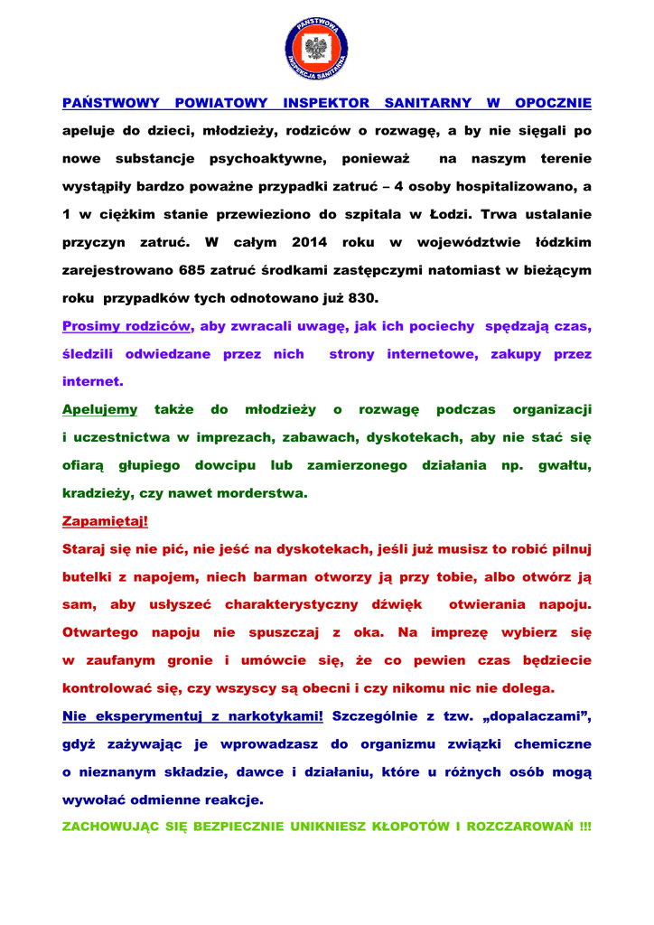 PAŃSTWOWY POWIATOWY INSPEKTOR SANITARNY W OPOCZNIE apeluje do dzieci, młodzieży, rodziców o rozwagę, a by nie sięgali po nowe substancje psychoaktywne, ponieważ na naszym terenie wystąpiły bardzo poważne przypadki zatruć – 4 osoby hospitalizowano, a 1 w ciężkim stanie przewieziono do szpitala w Łodzi. Trwa ustalanie przyczyn zatruć. W całym 2014 roku w województwie łódzkim zarejestrowano 685 zatruć środkami zastępczymi natomiast w bieżącym roku przypadków tych odnotowano już 830. Prosimy rodziców, aby zwracali uwagę, jak ich pociechy spędzają czas, śledzili odwiedzane przez nich strony internetowe, zakupy przez internet. Apelujemy także do młodzieży o rozwagę podczas organizacji i uczestnictwa w imprezach, zabawach, dyskotekach, aby nie stać się ofiarą głupiego dowcipu lub zamierzonego działania np. gwałtu, kradzieży, czy nawet morderstwa. Zapamiętaj! Staraj się nie pić, nie jeść na dyskotekach, jeśli już musisz to robić pilnuj butelki z napojem, niech barman otworzy ją przy tobie, albo otwórz ją sam, aby Otwartego usłyszeć napoju charakterystyczny nie spuszczaj z dźwięk oka. Na otwierania imprezę napoju. wybierz się w zaufanym gronie i umówcie się, że co pewien czas będziecie kontrolować się, czy wszyscy są obecni i czy nikomu nic nie dolega. Nie eksperymentuj z narkotykami! Szczególnie z tzw. „dopalaczami”, gdyż zażywając je wprowadzasz do organizmu związki chemiczne o nieznanym składzie, dawce i działaniu, które u różnych osób mogą wywołać odmienne reakcje. ZACHOWUJĄC SIĘ BEZPIECZNIE UNIKNIESZ KŁOPOTÓW I ROZCZAROWAŃ !!!