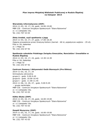 Plan imprez Miejskiej Biblioteki Publicznej w Rudzie Śląskiej na listopad 2014 Warsztaty informatyczne (ZHP) 2014-11-03, 10, 17, 24, godz. 16.00-19.00 MBP CIS - Centrum Inicjatyw Społecznych "Stara Bykowina" ul. 11 Listopada 15a. Tel. (32) 707 43 03 Złoty środek, czyli spotkania z jogą 2014-11-03, 10, 17, 27, godz. 17.00-18.30 Zajęcia prowadzone przez Grażynę Kotlorz (karnet - 60 zł, pojedyncze wejście – 25 zł). Filia nr 18, Halemba ul. 1 Maja 32 Tel. (32) 242 67 92 Spotkanie członków Polskiego Związku Emerytów, Rencistów i Inwalidów w Rudzie Śląskiej 2014-11-03, 10, 17, 24, godz. 12.30-14.30 Filia nr 18, Halemba ul. 1 Maja 32 Tel. (32) 242 67 92 Centrum Pomocy i Aktywności Osób Starszych (Pro Ethica) 2014-11-03, 10, 17, 24 Gimnastyka zdrowotna grupa A - godz. 9.00-9.45 grupa B - godz. 10.00-10.45 grupa C - godz. 11.00-11.45 2014-11-06, 13, 20, 27, godz. 9.00-9.45 – grupa zamknięta. MBP CIS - Centrum Inicjatyw Społecznych "Stara Bykowina" ul. 11 Listopada 15a. Tel. (32) 707 43 03 Kółko Skata (ZHP) 2014-11-03, 10, 17, 24, godz. 16.00-19.00 MBP CIS - Centrum Inicjatyw Społecznych "Stara Bykowina" ul. 11 Listopada 15a. Tel. (32) 707 43 03 Zespół Muzyczny (ZHP) 2014-11-03, 10, 17, 24, godz. 16.00-19.00 MBP CIS - Centrum Inicjatyw Społecznych "Stara Bykowina" ul. 11 Listopada 15a. Tel. (32) 707 43 03 Zajęcia dla dzieci z Przedszkola nr 12 2014-11-04, 05, godz. 10.00 MBP CIS - Centrum Inicjatyw Społecznych „Stary Orzegów” ul. Kard. A. Hlonda 29 Tel. (32) 248 36 37 Czytanie rozwija 2014-11-04, 06, 13, 18, 20, 25, 27, godz. 9.00-11.00 Głośne czytanie bajek w przedszkolu. Filia nr 8, Halemba ul. Kaczmarka 38 Tel. (32) 243 23 41 Taneczne pasje 2014-11-04, 18, godz. 16.30 Warsztaty taneczne dla dzieci. MBP CIS - Centrum Inicjatyw Społecznych „Stary Orzegów” ul. Kard. A. Hlonda 29 Tel. (32) 248 36 37 Teatr (Komedia) „CZARNY KOT” 2014-11-04, 18, 25, godz. 10.30-12.00 Próby teatralno - wokalne. MBP CIS - Centrum Inicjatyw Społecznych "Stara Bykowina" ul. 11 Listopada 15a. Tel. (32) 707 43 03 Centrum Pomocy i Aktywności Osób Starszych (Pro Ethica) 2014-11-04, 18, 25, godz. 10.00-12.00 Perfekcyjna Pani Domu. MBP CIS - Centrum Inicjatyw Społecznych "Stara Bykowina" ul. 11 Listopada 15a. Tel. (32) 707 43 03 Centrum Pomocy i Aktywności Osób Starszych (Pro Ethica) 2014-11-04, 18, 25, godz. 16.15-18.45 Warsztaty artystyczne w różnych grupach tematycznych (Rękodzieło). MBP CIS - Centrum Inicjatyw Społecznych "Stara Bykowina" ul. 11 Listopada 15a. Tel. (32) 707 43 03 Centrum Pomocy i Aktywności Osób Starszych (Pro Ethica) 2014-11-04, 18, 25, godz. 15.00-17.00 Zajęcia informatyczne MBP CIS - Centrum Inicjatyw Społecznych "Stara Bykowina" ul. 11 Listopada 15a. Tel. (32) 707 43 03 Spotkanie członków Śląskiego Związku Pszczelarzy 2014-11-05, godz. 16.30 MBP CIS - Centrum Inicjatyw Społecznych „Stary Orzegów” ul. Kard. A. Hlonda 29 Tel. (32) 248 36 37 Twoje życie w Twoich rękach 2014-11-05, godz. 18.00 Spektakl edukacyjny „Dzwonek” dla dzieci i młodzieży z przesłaniem antyuzależnieniowym. Występ przygotowany przez studentów i licealistów w ramach programu „Razem Bezpieczniej” i koordynatora projektu komisarza policji Krzysztofa Piechaczka. MBP CIS - Centrum Inicjatyw Społecznych „Stary Orzegów” ul. Kard. A. Hlonda 29 Tel. (32) 248 36 37 Centrum Pomocy i Aktywności Osób Starszych (Pro Ethica) 2014-11-05, 12, 19, 26, godz. 9.00-11.00 Klub Babci i Wnusia MBP CIS - Centrum Inicjatyw Społecznych "Stara Bykowina" ul. 11 Listopada 15a. Tel. (32) 707 43 03 Centrum Pomocy i Aktywności Osób Starszych (Pro Ethica) Język niemiecki 2014-11-05, 12, 19, 26, godz. 16.00-17.00 Język rosyjski 2014-11-05, 12, 19, 26, godz. 17.00-18.00 Język angielski 2014-11-07, 14, 21, 28, godz. 16.30-17.30 MBP CIS - Centrum Inicjatyw Społecznych "Stara Bykowina" ul. 11 Listopada 15a. Tel. (32) 707 43 03 Spotkania z pasjami 2014-11-06, 20, godz. 11.00 MBP CIS - Centrum Inicjatyw Społecznych "Stara Bykowina" ul. 11 Listopada 15a. Tel. (32) 707 43 03 Centrum Pomocy i Aktywności Osób Starszych (Pro Ethica) 2014-11-06, 13, 20, 27, godz. 16.15 – 18.45 Zajęcia malarskie grupy artystycznej „Inspiracje” MBP CIS - Centrum Inicjatyw Społecznych "Stara Bykowina" ul. 11 Listopada 15a. Tel. (32) 707 43 03 Tenis stołowy (ZHP) 2014-11-06, 13, 20, 27, godz. 10.00-13.00 MBP CIS - Centrum Inicjatyw Społecznych "Stara Bykowina" ul. 11 Listopada 15a. Tel. (32) 707 43 03 Liga Play Station (HP) 2014-11-06, 13, 20, 27, godz. 10.00-13.00 MBP CIS - Centrum Inicjatyw Społecznych "Stara Bykowina" ul. 11 Listopada 15a. Tel. (32) 707 43 03 Godulowe Silva Rerum 2014-11-07, godz. 17.00 Promocja książki Adama Podgórskiego. Biblioteka Centralna, Wirek ul. Dąbrowskiego 18 Tel. (32) 242 05 86 Twoje życie w Twoich rękach 2014-11-07, 14, 21, 28, godz. 17.30 Zbiórka otwarta 77 Drużyny Harcerskiej ZHP Komendy Chorągwi Śląskiej. MBP CIS - Centrum Inicjatyw Społecznych „Stary Orzegów” ul. Kard. A. Hlonda 29 Tel. (32) 248 36 37 Zbiórki harcerskie (ZHP) 2014-11-06, 13, 20, 27, godz. 16.00-19.00 – Zuchy 2014-11-07, 14, 21, 28, godz. 16.00-19.00 – Harcerze MBP CIS - Centrum Inicjatyw Społecznych "Stara Bykowina" ul. 11 Listopada 15a. Tel. (32) 707 43 03 Centrum Pomocy i Aktywności Osób Starszych (Pro Ethica) 2014-11-07, 14, 21, 28, godz. 11.30-14.30 Zajęcia psychospołeczne - grupa A MBP CIS - Centrum Inicjatyw Społecznych "Stara Bykowina" ul. 11 Listopada 15a. Tel. (32) 707 43 03 Centrum Pomocy i Aktywności Osób Starszych (Pro Ethica) 2014-11-07, 14, 21, 28, godz. 9.00-11.00 Mnemotechniki dla osób starszych- doskonalenie pamięci. MBP CIS - Centrum Inicjatyw Społecznych "Stara Bykowina" ul. 11 Listopada 15a. Tel. (32) 707 43 03 Dyskusyjny Klub Książki – Klub Literacki – BARWY. 2014-11-07, godz. 18.00 W programie dyskusja o literaturze współczesnej. Ted Hughes „Pogromca snów i inne opowieści o stworzeniu świata” , Turniej Je