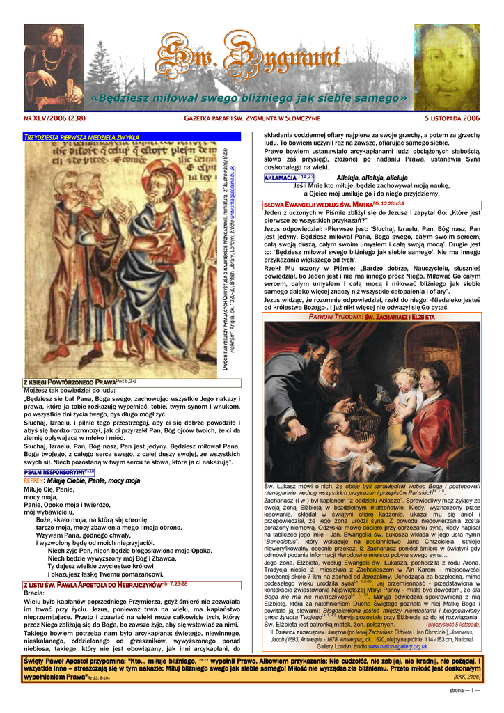 Sw. Zygmunt «Będziesz miłował swego bliźniego jak siebie samego» NR XLV/2006 (23 (238) GAZETKA PARAFII ŚW. ZYGMUNTA W SŁOMCZYNIE DWÓCH FARYZEUSZY PYTAJĄCYCH CHRYSTUSA O NAJWIĘKSZE PRZYKAZANIE, miniatura, z "Ilustrowanej Biblii Holkham", Anglia, ok. 1320-30, British Library, Londyn; źródło www.imagesonline.bl.uk TRZYDZIESTA PIERWSZA NIEDZIELA ZWYKŁA 5 LISTOPADA 2006 składania codziennej ofiary najpierw za swoje grzechy, a potem za grzechy ludu. To bowiem uczynił raz na zawsze, ofiarując samego siebie. Prawo bowiem ustanawiało arcykapłanami ludzi obciążonych słabością, słowo zaś przysięgi, złożonej po nadaniu Prawa, ustanawia Syna doskonałego na wieki. AKLAMACJA J 14,23 Alleluja, alleluja, alleluja Jeśli Mnie kto miłuje, będzie zachowywał moją naukę, a Ojciec mój umiłuje go i do niego przyjdziemy. SŁOWA EWANGELII WEDŁUG ŚW. MARKAMk 12,28b-34 Jeden z uczonych w Piśmie zbliżył się do Jezusa i zapytał Go: „Które jest pierwsze ze wszystkich przykazań?” Jezus odpowiedział: «Pierwsze jest: ‘Słuchaj, Izraelu, Pan, Bóg nasz, Pan jest jedyny. Będziesz miłował Pana, Boga swego, całym swoim sercem, całą swoją duszą, całym swoim umysłem i całą swoją mocą’. Drugie jest to: ‘Będziesz miłował swego bliźniego jak siebie samego’. Nie ma innego przykazania większego od tych’. Rzekł Mu uczony w Piśmie: „Bardzo dobrze, Nauczycielu, słusznieś powiedział, bo Jeden jest i nie ma innego prócz Niego. Miłować Go całym sercem, całym umysłem i całą mocą i miłować bliźniego jak siebie samego daleko więcej znaczy niż wszystkie całopalenia i ofiary”. Jezus widząc, że rozumnie odpowiedział, rzekł do niego: «Niedaleko jesteś od królestwa Bożego». I już nikt więcej nie odważył się Go pytać. PATRONI TYGODNIA: ŚW. ZACHARIASZ I ELŻBIETA Z KSIĘGI POWTÓRZONEGO PRAWAPwt 6,2-6 Mojżesz tak powiedział do ludu: „Będziesz się bał Pana, Boga swego, zachowując wszystkie Jego nakazy i prawa, które ja tobie rozkazuję wypełniać, tobie, twym synom i wnukom, po wszystkie dni życia twego, byś długo mógł żyć. Słuchaj, Izraelu, i pilnie tego przestrzegaj, aby ci się dobrze powodziło i abyś się bardzo rozmnożył, jak ci przyrzekł Pan, Bóg ojców twoich, że ci da ziemię opływającą w mleko i miód. Słuchaj, Izraelu, Pan, Bóg nasz, Pan jest jedyny. Będziesz miłował Pana, Boga twojego, z całego serca swego, z całej duszy swojej, ze wszystkich swych sił. Niech pozostaną w twym sercu te słowa, które ja ci nakazuję”. PSALM RESPONSORYJNYPs18 REFREN: Miłuję Ciebie, Panie, mocy moja Miłuję Cię, Panie, mocy moja, Panie, Opoko moja i twierdzo, mój wybawicielu. Boże, skało moja, na którą się chronię, tarczo moja, mocy zbawienia mego i moja obrono. Wzywam Pana, godnego chwały, i wyzwolony będę od moich nieprzyjaciół. Niech żyje Pan, niech będzie błogosławiona moja Opoka. Niech będzie wywyższony mój Bóg i Zbawca. Ty dajesz wielkie zwycięstwo królowi i okazujesz łaskę Twemu pomazańcowi. Z LISTU ŚW. PAWŁA APOSTOŁA DO HEBRAJCZYKÓWHbr 7,23-28 Bracia: Wielu było kapłanów poprzedniego Przymierza, gdyż śmierć nie zezwalała im trwać przy życiu. Jezus, ponieważ trwa na wieki, ma kapłaństwo nieprzemijające. Przeto i zbawiać na wieki może całkowicie tych, którzy przez Niego zbliżają się do Boga, bo zawsze żyje, aby się wstawiać za nimi. Takiego bowiem potrzeba nam było arcykapłana: świętego, niewinnego, nieskalanego, oddzielonego od grzeszników, wywyższonego ponad niebiosa, takiego, który nie jest obowiązany, jak inni arcykapłani, do Św. Łukasz mówi o nich, że oboje byli sprawiedliwi wobec Boga i postępowali nienagannie według wszystkich przykazań i przepisów PańskichŁk 1, 6. Zachariasz (I w.) był kapłanem “z oddziału Abiasza”. Sprawiedliwy mąż żyjący ze swoją żoną Elżbietą w bezdzietnym małżeństwie. Kiedy, wyznaczony przez losowanie, składał w świątyni ofiarę kadzenia, ukazał mu się anioł i przepowiedział, że jego żona urodzi syna. Z powodu niedowierzania został porażony niemową. Odzyskał mowę dopiero przy obrzezaniu syna, kiedy napisał na tabliczce jego imię - Jan. Ewangelia św. Łukasza wkłada w jego usta hymn “Benedictus”, który wskazuje na posłannictwo Jana Chrzciciela. Istnieje nieweryfikowalny obecnie przekaz, iż Zachariasz poniósł śmierć w świątyni gdy odmówił podania informacji Herodowi o miejscu pobytu swego syna… Jego żona, Elżbieta, według Ewangelii św. Łukasza, pochodziła z rodu Arona. Tradycja niesie iż, mieszkała z Zachariaszem w Ain Karem - miejscowości położonej około 7 km na zachód od Jerozolimy. Uchodząca za bezpłodną, mimo podeszłego wieku urodziła synaŁk 1,5-80. Jej brzemienność - przedstawiona w kontekście zwiastowania Najświętszej Maryi Panny - miała być dowodem, że dla Boga nie ma nic niemożliwegoŁk 1, 37. Maryja odwiedziła spokrewnioną z nią Elżbietę, która za natchnieniem Ducha Świętego poznała w niej Matkę Boga i powitała ją słowami: Błogosławiona jesteś między niewiastami i błogosławiony owoc żywota TwojegoŁk 1, 42 Maryja pozostała przy Elżbiecie aż do jej rozwiązania. Św. Elżbieta jest patronką matek, żon, położnych. (uroczystość 5 listopada) il. DZIEWICA Z DZIECIĘCIEM I ŚWIĘTYMI (po lewej Zachariasz, Elżbieta i Jan Chrzciciel), JORDAENS, Jacob (1593, Antwerpia - 1678, Antwerpia), ok. 1620, olejny na płótnie, 114×153 cm, National Gallery, Londyn; źródło www.nationalgallery.org.uk Święty Paweł Apostoł przypomina: przypomina: "Kto… miłuje bliźniego, 2822 wypełnił Prawo. Albowiem przykazania: Nie cudzołóż, nie zabijaj, nie kradnij, nie pożądaj, i wszystkie inne – streszczają się w tym nakazie: Miłuj bliźniego bliźniego swego jak siebie samego! Miłość nie wyrządza zła bliźniemu. Przeto miłość jest doskonałym wypełnieniem Prawa" Rz 13, 8-10. 