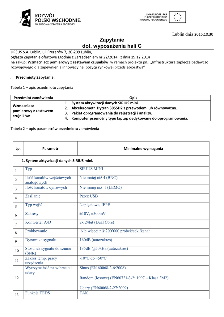Lublin dnia 2015.10.30 Zapytanie dot. wyposażenia hali C URSUS S.A. Lublin, ul. Frezerów 7, 20-209 Lublin, ogłasza Zapytanie ofertowe zgodnie z Zarządzeniem nr 22/2014 z dnia 19.12.2014 na zakup: Wzmacniacz pomiarowy z zestawem czujników w ramach projektu pn.: „Infrastruktura zaplecza badawczo rozwojowego dla zapewnienia innowacyjnej pozycji rynkowej przedsiębiorstwa” I. Przedmioty Zapytania: Tabela 1 – opis przedmiotu zapytania Przedmiot zamówienia Wzmacniacz pomiarowy z zestawem czujników 1. 2. 3. 4. Opis System aktywizacji danych SIRIUS mini. Akcelerometr Dytran 3055D2 z przewodem lub równoważny. Pakiet oprogramowania do rejestracji i analizy. Komputer przenośny typu laptop dedykowany do oprogramowania. Tabela 2 – opis parametrów przedmiotu zamówienia Lp. Parametr Minimalne wymagania 1. System aktywizacji danych SIRIUS mini. Typ SIRIUS MINI Nie mniej niż 4 (BNC) 3 Ilość kanałów wejściowych analogowych Ilość kanałów cyfrowych 4 Zasilanie Przez USB 5 Typ wejść Napięciowe, IEPE 6 Zakresy ±10V, ±500mV 7 Konwerter A/D 2x 24bit (Dual Core) 8 Próbkowanie Nie więcej niż 200’000 próbek/sek./kanał 9 Dynamika sygnału 160dB (autozakres) Stosunek sygnału do szumu (SNR) Zakres temp. pracy urządzenia Wytrzymałość na wibracje i udary 135dB @50kHz (autozakres) 1 2 10 11 -10°C do +50°C Sinus (EN 60068-2-6:2008) Random (losowe) (EN60721-3-2: 1997 – Klasa 2M2) 12 13 Nie mniej niż 1 (LEMO) Funkcja TEDS Udary (EN60068-2-27:2009) TAK 2. Akcelerometr Dytran 3055D2 z przewodem lub równoważny. 1 Model 3055D2 2 Zakres pomiarowy Nie więcej niż ±50g 3 Czułość (±5%) Nie mniej niż 100 mV/g 4 Odpowiedź częstotliwości Nie więcej niż 1-10’000Hz ±10% 5 Zakres temperatur pracy Nie mniej niż -51°C do 120°C 6 Zasilanie 18-30V, 2-20mA 7 Masa przetwornika Nie więcej niż 10 gramów 8 Konektor 10-32 9 Izolacja podstawy TAK 10 Czujnik hermetyczny TAK 11 Przewód 6011A30 9 metrów, osłona Teflon 3. Pakiet oprogramowania do rejestracji i analizy. 1 2 3 4 5 6 7 Oprogramowanie DEWESoft X2 rejestracja w czasie rzeczywistym rejestracja w dziedzinie częstotliwości analiza FFT moduł „Math Manager” umożliwiający filtrowanie podstawowy moduł statystyczny: uśrednianie, RMS, min., max. możliwość eksportu danych do wielu innych formatów m.in. Excel, Flexpro, Matlab, Diadem i inne 4. Komputer przenośny typu laptop dedykowany do oprogramowania. 1 Procesor Intel Core i5 Mobile (i5-5200U); 2.2GHz 2 Dysk HDD Nie mniej niż 1 TB 3 Napęd wbudowany DVD±RW 4 Pamięć 4096 MB (SODIMM DDR3L) 5 Przekątna ekranu LCD Nie więcej niż 17,3 cala 6 Maksymalna LCD rozdzielczość 1600 x 900 7 Klawiatura numeryczna Złącza zewnętrzne 10 2x USB2.0 1x USB 3.0 1x 15-stykowe D-Sub (monitor) 1x combo audio (mikrofon/słuchawki) 1x HDMI 1x RJ45 (LAN) 1x wejście zasilania (DC-in) Przybliżony czas pracy na Nie mniej niż 4h bateriach System operacyjny Microsoft Windows 7 Prof. 64-bt 11 Masa netto 8 9 Nie więcej niż 2,9 kg II. Miejsce składania i otwierania ofert Oferty na załączonym formularzu należy składać do dnia 2015.11.06 do godz. 15.00 mailowo na adres: [email protected] lub osobiście w Sekretariacie Zamawiającego, ul. Frezerów 7, 20-209 Lublin. Ogłoszenie zaproponowanych cen oraz nazw oferentów będzie dostępne dla zainteresowanych 15 minut po terminie złożenia. III. Kryterium wyboru 100% cena Złożone oferty muszą spełniać wszystkie parametry minimalne opisane w zapytaniu Przedmiot zamówienia musi być przekazany protokolarnie na podstawie załączonej umowy. Termin dostawy 14 dni od podpisania umowy Płatność będzie dokonana przelewem zgodnie z umową IV. Dane kontaktowe Pracownikiem upoważnionym do kontaktów jest: Remigiusz Śnieżek tel. 785 114 688 lub, email: [email protected] V. Ważność oferty Oferta jest ważna przez 30 dni VI. Zamawiający zastrzega sobie prawo odwołania Zapytania bez podania przyczyny zamknięcia Zapytania bez wyboru jakiejkolwiek z ofert unieważnienia Zapytania bez podania przyczyny Umowa sprzedaży nr ………………. W ramach projektu pn.: „Infrastruktura zaplecza badawczo rozwojowego dla zapewnienia innowacyjnej pozycji rynkowej przedsiębiorstwa” Zawarta w ……………, w dniu ………………. 2015r. pomiędzy: Panem/Firmą _____________________, zamieszkałym w _________________ , przy ul. _______________________, legitymującym się dowodem osobistym o numerze ________________________, wydanym przez ___________________________, NIP:_______________, PESEL_____________ zwanym dalej Sprzedawcą, a spółką URSUS S.A. z siedzibą w Lublinie, ul. Frezerów 7, 20-209 Lublin, wpisaną do Rejestru Przedsiębiorców Krajowego Rejestru Sądowego przez Sąd Rejonowy Lublin - Wschód w Lublinie z siedzibą w Świdniku, VI Wydział Gospodarczy Krajowego Rejestru Sądowego pod numerem KRS 0000013785, kapitał zakładowy 41.180.000 zł opłacony w całości, REGON: 510481080, NIP: 7392388 088, reprezentowaną przez: Jana Wielgusa – Członka Zarządu, Agnieszkę Wiśniewską – Prokurenta, zwanym dalej Kupującym, o następującej treści: § 1. 1. Na podstawie niniejszej umowy Sprzedawca sprzedaje a Kupujący kupuje przedmiot umowy zgodny z ofertą złożoną Kupującemu w dniu ……………., stanowiącą załącznik do niniejszej umowy, szczegółowo w niej opisany, za cenę ……… (………….) złotych netto powiększoną o należny podatek od towarów i usług. 2. Kupujący dokona zapłaty ceny określonej w § 1 pkt 1 w terminie wskazanym na fakturze wystawionej przez Sprzedawcę. 3. Wydanie przedmiotu umowy nastąpi do dnia …………….. i zostanie potwierdzone protokołem zdawczo odbiorczym. 4. Wraz z wydaniem przedmiotu umowy Sprzedawca przekaże Kupującemu wszelkie dokumenty dotyczące przedmiotu umowy niezbędne do jego prawidłowego używania, w tym instrukcję obsługi i kartę gwarancyjną. 5. Sprzedawca oświadcza ponadto, że przedmiot umowy jest wolny od wad prawnyc