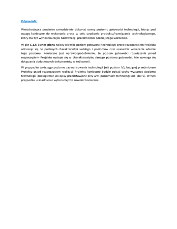 Odpowiedź: Wnioskodawca powinien samodzielnie dokonać oceny poziomu gotowości technologii, biorąc pod uwagę konieczne do wykonania prace w celu uzyskania produktu/rozwiązania technologicznego, który ma być wynikiem części badawczej i przedmiotem późniejszego wdrożenia. W pkt C.1.5 Biznes planu należy określić poziom gotowości technologii przed rozpoczęciem Projektu odnosząc się do podanych charakterystyk każdego z poziomów oraz uzasadnić wskazanie właśnie tego poziomu. Konieczne jest uprawdopodobnienie, że poziom gotowości rozwiązania przed rozpoczęciem Projektu wpisuje się w charakterystykę danego poziomu gotowości. Nie wymaga się dołączania dodatkowych dokumentów w tej kwestii. W przypadku wyższego poziomu zaawansowania technologii (niż poziom IV), będącej przedmiotem Projektu przed rozpoczęciem realizacji Projektu konieczne będzie opisać cechy wyższego poziomu technologii (analogicznie jak opisy przedstawione przy ww. poziomach technologii od I do IV). W tym przypadku uzasadnienie wyboru będzie również konieczne.