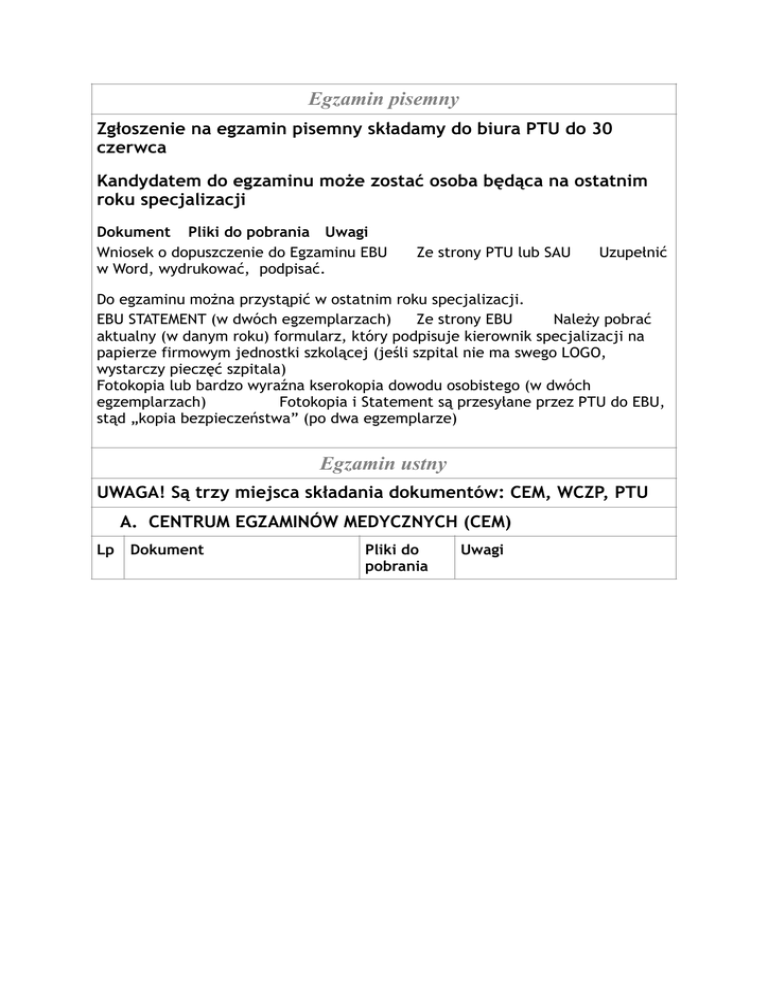 Egzamin pisemny Zgłoszenie na egzamin pisemny składamy do biura PTU do 30 czerwca Kandydatem do egzaminu może zostać osoba będąca na ostatnim roku specjalizacji Dokument Pliki do pobrania Uwagi Wniosek o dopuszczenie do Egzaminu EBU w Word, wydrukować, podpisać. Ze strony PTU lub SAU Uzupełnić Do egzaminu można przystąpić w ostatnim roku specjalizacji. EBU STATEMENT (w dwóch egzemplarzach) Ze strony EBU Należy pobrać aktualny (w danym roku) formularz, który podpisuje kierownik specjalizacji na papierze firmowym jednostki szkolącej (jeśli szpital nie ma swego LOGO, wystarczy pieczęć szpitala) Fotokopia lub bardzo wyraźna kserokopia dowodu osobistego (w dwóch egzemplarzach) Fotokopia i Statement są przesyłane przez PTU do EBU, stąd „kopia bezpieczeństwa” (po dwa egzemplarze) Egzamin ustny UWAGA! Są trzy miejsca składania dokumentów: CEM, WCZP, PTU A. CENTRUM EGZAMINÓW MEDYCZNYCH (CEM) Lp Dokument Pliki do pobrania Uwagi 1 Wniosek do CEM o przystąpienie do Państwowego Egzaminu Specjalizacyjnego (PES). Składamy go w formie elektronicznej. Wniosek do wydrukowa nia po zalogowani u się na www.cem. edu.pl Oficjalny deadline rejestracji – do 31 grudnia roku poprzedzającego termin egzaminu ustnego! Dotyczy on wszystkich osób, które zakończyły w tym czasie specjalizację. Inni kandydaci, którzy kończą specjalizację między 01.01. a dniem egzaminu ustnego, rejestrują się (tj. składają Wniosek do CEM) tuż po pierwszym stycznia. Formalnie jest tak, jakby przystępowali do egzaminu w sesji jesiennej. Wydrukowany i podpisany Wniosek należy dołączyć do teczki z pozostałymi dokumentami. B. Wojewódzkie Centrum Zdrowia Publicznego (WCZP) lub odpowiednio podmiot obsługujący MON bądź MSW Oficjalny termin składania dokumentów do WCZP /MON/MSW upływa 31 grudnia Lp . Dokument Pliki do pobrania 1 Wydrukowany i podpisany Wniosek (ten, o którym mowa w punkcie A) 2 Oświadczenie o rezygnacji z Do pobrania udziału w PES i przystąpieniu do ze strony egzaminu organizowanego przez CEM europejskie towarzystwo naukowe Uwagi Zaleca się wyszukanie aktualnej wersji Oświadczenia na stronach CEM. Pamiętajmy, że ubiegamy się o uznanie egzaminu FEBU za równoważny w całości. 3 Opinia zawodowa sporządzona i podpisana przez kierownika specjalizacji 4 Harmonogram odbywania specjalizacji podpisany przez kierownika specjalizacji W tym chronologicznym harmonogramie, rozpisanym na poszczególne lata specjalizacji, warto uwzględnić wszystkie formy samokształcenia (str.39 Programu), dodatkowe kursy, szkolenia, kongresy i inne formy aktywności zawodowej świadczące o rozwoju kandydata. 5 Karta Specjalizacyjna podpisana przez kierownika specjalizacji wypełniona szczegółowo i świadcząca o odbyciu przez kandydata wszystkich obowiązkowych kursów i stażów oraz o pomyślnym złożeniu przez kandydata wszystkich wymaganych kolokwiów, zaopatrzona adnotacją o dopuszczeniu kandydata do egzaminu Pieczątki kierownika specjalizacji wszędzie tam, gdzie nie ma obowiązku pieczątki koordynatora stażu/ kursu/egzaminu i jednostki, w której był staż, egzamin językowy, kurs zdrowia publicznego. 6 Indeks zabiegów i procedur medycznych - w których kandydat uczestniczył oraz które przeprowadził osobiście pod kuratelą kierownika specjalizacji lub wyznaczonego przez niego specjalisty Strony połączone w sposób trwały. Na początku tabela ze zbiorczym zestawieniem za całą specjalizację. Wszystkie dokumenty poświadczone pieczątką i podpisem kierownika specjalizacji. 7 Kopie zaświadczeń o odbyciu wszystkich kursów specjalizacyjnych wymienionych w Programie Specjalizacji w Urologii (CMKP) od str. 22 do str. 27 Oryginały certyfikatów z kursów lub ich kopie poświadczone ZA ZGODNOŚĆ Z ORYGINAŁEM pieczątką i podpisem kierownika specjalizacji. Ponumerować w prawym górnym rogu zgodnie z kolejnością w programie specjalizacji. 1 – kurs wprowadzający część A 2 – kurs wprowadzający część B 3 – kurs wprowadzający część C 4 – Chirurgia rekonstrukcyjna i mikrochirurgia 5 – Chirurgia endokrynologiczna 6 – Leczenie żywieniowe 7 – Onkologia urologiczna 8 – Endourologia 9 – Neurourologia 10 – Urologia dziecięca 11 – Diagnostyka obrazowa 12 – Laparoskopia w urologii 13 – Zdrowie publiczne (patrz poniżej) 8 Zaświadczenia o złożeniu wszystkich kolokwiów ujętych w Programie Specjalizacji w Urologii na str. 40. Wpisać imię i nazwisko kandydata, podpis i pieczątka kierownika specjalizacji. 9 Zaświadczenie o odbyciu przez kandydata zakładowych dyżurów lekarskich - w liczbie określonej w Programie Specjalizacji w Urologii (co najmniej 3 dyżury w miesiącu w czasie dwuletniego stażu specjalizacyjnego w chirurgii oraz w czasie czteroletniego stażu specjalizacyjnego w urologii) Wpisać imię i nazwisko kandydata, podpis i pieczątka kierownika specjalizacji. 10 Zaświadczenie o praktycznej znajomości języka obcego potwierdzone zaliczeniem w Studium Języków Obcych uczelni medycznej albo uczelni prowadzącej działalność dydaktyczną i badawczą w dziedzinie nauk medycznych Zaświadczenie wydane z egzaminu z języka obcego + wpis w Karcie Specjalizacyjnej (pieczątka i podpis egzaminatora, pieczątka instytucji egzaminującej). 11 Kopia publikacji w naukowym czasopiśmie medycznym lub doniesienia wydrukowanego w materiałach kongresowych. Ewentualnie można dołączyć pracę poglądową, zaprezentowaną na posiedzeniu regionalnego oddziału PTU Publikacja przygotowana przez kandydata lub przy jego istotnym udziale – o czym zaświadcza na piśmie pierwszy autor publikacji. Uwaga! Zgodnie z obowiązującym od tego roku Rozporządzeniem kierownik specjalizacji ocenia złożoną w dokumentach pracę naukową lub poglądową. Tak więc do pracy trzeba dołączyć ocenę kierownika. DOKUMENTY SKŁADANE WARUNKOWO (NIE OBOWIĄZUJĄ WSZYSTKICH KANDYDATÓW) Kopia dyplomu z tytułem specjalisty w dziedzinie c