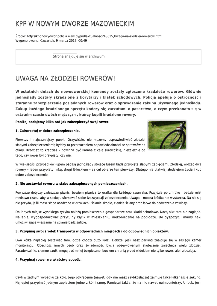 KPP W NOWYM DWORZE MAZOWIECKIM Źródło: http://kppnowydwor.policja.waw.pl/pnd/aktualnosci/43615,Uwaga-na-zlodziei-rowerow.html Wygenerowano: Czwartek, 9 marca 2017, 00:49 Strona znajduje się w archiwum. UWAGA NA ZŁODZIEI ROWERÓW! W ostatnich dniach do nowodworskiej komendy zostały zgłoszone kradzieże rowerów. Głównie jednoślady zostały skradzione z korytarzy i klatek schodowych. Policja apeluje o ostrożność i staranne zabezpieczenie posiadanych rowerów oraz o sprawdzanie zakupu używanego jednośladu. Zakup każdego kradzionego sprzętu kończy się zarzutami o paserstwo, o czym przekonało się w ostatnim czasie dwóch mężczyzn , którzy kupili kradzione rowery. Poniżej podajemy kilka rad jak zabezpieczyć swój rower. 1. Zainwestuj w dobre zabezpieczenie. Pierwszy i najważniejszy punkt. Oczywiście, nie możemy usprawiedliwiać złodziei słabymi zabezpieczeniami; byłoby to przerzucaniem odpowiedzialności ze sprawców na ofiary. Kradzież to kradzież – powinna być karana z całą surowością, niezależnie od tego, czy rower był przypięty, czy nie. W większości przypadków łupem padają jednoślady stojące luzem bądź przypięte słabymi zapięciami. Złodziej, widząc dwa rowery – jeden przypięty linką, drugi U-lockiem – za cel obierze ten pierwszy. Dlatego nie ułatwiaj złodziejom życia i kup dobre zabezpieczenie. 2. Nie zostawiaj roweru w słabo zabezpieczonych pomieszczeniach. Powyższe dotyczy zwłaszcza piwnic, bowiem piwnica to gratka dla każdego cwaniaka. Przyjdzie po zmroku i będzie miał mnóstwo czasu, aby w spokoju sforsować słabe (zazwyczaj) zabezpieczenia. Uwaga – mocna kłódka nie wystarcza. Na nic się nie przyda, jeśli masz słabo osadzone w drzwiach i ścianie skoble, cienkie ściany oraz łatwe do podważenia zawiasy. Do innych miejsc wysokiego ryzyka należą pomieszczenia gospodarcze oraz klatki schodowe. Nocą nikt tam nie zagląda. Najlepiej wygospodarować przytulny kącik w mieszkaniu, niekoniecznie na podłodze. Do dyspozycji mamy haki umożliwiające wieszanie na ścianie bądź suficie. 3. Przypinaj swój środek transportu w odpowiednich miejscach i do odpowiednich obiektów. Dwa kółka najlepiej zostawiać tam, gdzie chodzi dużo ludzi. Dobrze, jeśli nasz parking znajduje się w zasięgu kamer monitoringu. Obecność innych osób oraz świadomość bycia obserwowanym skutecznie zniechęca wielu złodziei. Paradoksalnie, ciemne zaułki mogą być mniej bezpieczne, bowiem chronią przed widokiem nie tylko rower, ale i złodzieja. 4. Przypinaj rower we właściwy sposób. Czyli w żadnym wypadku za koło. Jego odkręcenie (nawet, gdy nie masz szybkozłącza) zajmuje kilka-kilkanaście sekund. Najlepiej przypinać jednym zapięciem jedno z kół i ramę. Pamiętaj także, że na nic nawet najmocniejszy, U-lock, jeśli uczepisz się cienkiego drzewka bądź chwiejącego słupa. Wybieraj mocne obiekty solidnie wtopione w grunt: stojaki w kształcie litery U. Ze znakami uważaj – jeśli są niskie, po odkręceniu tarczy całość można przełożyć przez sztycę i uciec w siną dal. 5. Sprawdzaj legalność nowych nabytków. Złodzieje kradną rowery, bo wiedzą, że na niezajeżdżone używki jest popyt. Dlatego uważaj przy kupowaniu jednośladów z drugiej ręki (zwłaszcza na giełdach). Spisz numery ramy i sprawdź je na policji oraz w Bazie Rowerów. Poproś o dowód zakupu bądź jego sporządzenie. Może się przydać, jeśli wpadniesz na kontrolę lub zechcesz kolejny raz sprzedać maszynę. Staraj się nie napędzać nielegalnego biznesu. Kolejny podwędzony rower może należeć do ciebie i raczej nie byłoby ci miło, gdybyś zobaczył go kupionego po taniości na bazarze. 6. Do codziennej jazdy nie używaj drogiego sprzętu. To tylko półśrodek, bowiem cykliście codziennemu utrata nawet taniego roweru stworzy komunikacyjny problem. Droższy sprzęt zdecydowanie kusi złodzieja, a łatwiej przeboleć stratę jednośladu za kilkaset złotych, niż za kilka tysięcy. Do miejskiej jazdy nie potrzebujesz drogiego, wyżyłowanego, superlekkiego ścigacza. 7. Reaguj na widok skradzionego jednośladu. Jeśli z ogłoszenia o kradzieży bądź innego źródła zapamiętałeś wygląd podwędzonej maszyny i przypadkiem wypatrzysz coś łudząco podobnego w plenerze, nie pozostawaj bierny. Zadzwoń do okradzionej osoby oraz na policję. Pamiętaj także o prawie obywatelskiego ujęcia, choć tutaj zalecam ostrożność i odrobinę sprytu. Ściąganie kogoś z roweru może być niebezpieczne, ale śledzenie złodzieja i „tymczasowe zabezpieczenie mienia” własnym zapięciem, gdy ten zostawi sprzęt pod budynkiem – już mniej. Wtedy spokojnie możemy odejść na bezpieczny dystans i wykonać szybki telefon. Bez względu na metodę, warto reagować. Dzięki pomocy innych zguby czasami się znajdują. Niektórzy złodzieje to bezmyślni amatorzy, wykorzystujący po prostu okazję – biorą cudzy rower i jeżdżą nim po własnym mieście. Albo wiozą na lokalną giełdę. Co zrobić, gdy ukradną mój rower? Jak najszybciej zgłoś kradzież na policji i w Bazie Rowerów. Poinformuj znajomych oraz najbliższe otoczenie. Umieść ogłoszenia w internecie, dołączając zdjęcia i opis. Nie od parady okazuje się także przejrzenie stron aukcyjnych (szukaj zwłaszcza w swoim regionie; zwróć uwagę także na części – złodziej może pozbywać się łupu partiami) oraz odwiedzenie miejscowej giełdy, lombardów itp. Pamiętaj o cierpliwości – złodziej czasami czeka ze sprzedażą, aż sprawa nieco ucichnie. Skradzione maszyny potrafią odnaleźć się po wielu miesiącach. Ocena: 0/5 (0) Tweetnij