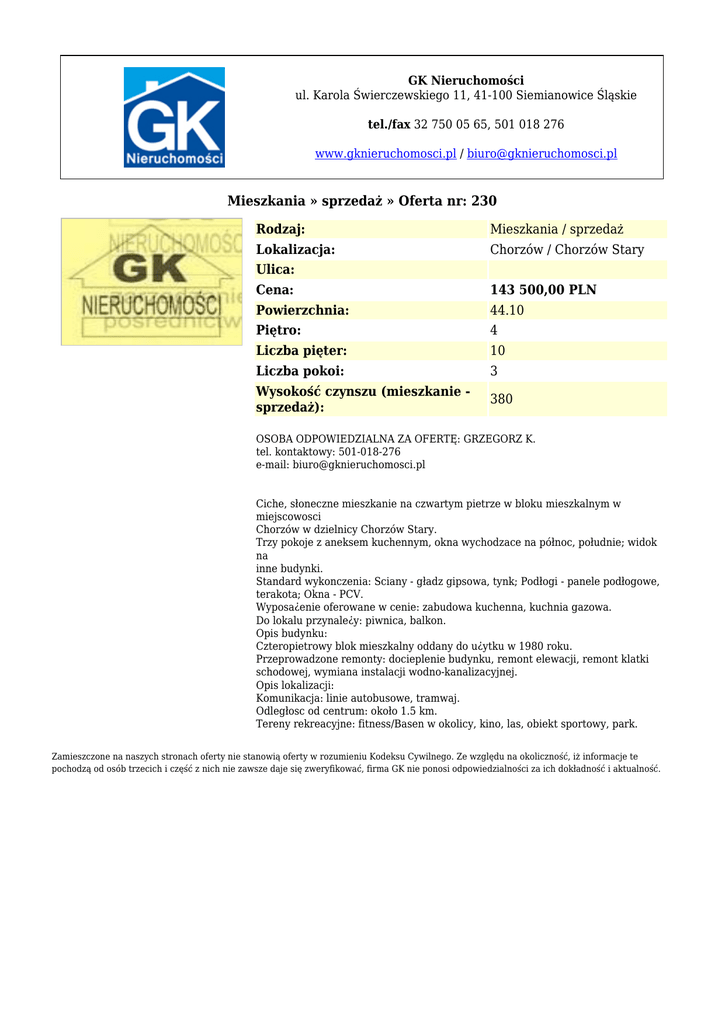 GK Nieruchomości ul. Karola Świerczewskiego 11, 41-100 Siemianowice Śląskie tel./fax 32 750 05 65, 501 018 276 www.gknieruchomosci.pl / [email protected] Mieszkania » sprzedaż » Oferta nr: 230 Rodzaj: Mieszkania / sprzedaż Lokalizacja: Chorzów / Chorzów Stary Ulica: Cena: 143 500,00 PLN Powierzchnia: 44.10 Piętro: 4 Liczba pięter: 10 Liczba pokoi: 3 Wysokość czynszu (mieszkanie sprzedaż): 380 OSOBA ODPOWIEDZIALNA ZA OFERTĘ: GRZEGORZ K. tel. kontaktowy: 501-018-276 e-mail: [email protected] Ciche, słoneczne mieszkanie na czwartym pietrze w bloku mieszkalnym w miejscowosci Chorzów w dzielnicy Chorzów Stary. Trzy pokoje z aneksem kuchennym, okna wychodzace na północ, południe; widok na inne budynki. Standard wykonczenia: Sciany - gładz gipsowa, tynk; Podłogi - panele podłogowe, terakota; Okna - PCV. Wyposa¿enie oferowane w cenie: zabudowa kuchenna, kuchnia gazowa. Do lokalu przynale¿y: piwnica, balkon. Opis budynku: Czteropietrowy blok mieszkalny oddany do u¿ytku w 1980 roku. Przeprowadzone remonty: docieplenie budynku, remont elewacji, remont klatki schodowej, wymiana instalacji wodno-kanalizacyjnej. Opis lokalizacji: Komunikacja: linie autobusowe, tramwaj. Odległosc od centrum: około 1.5 km. Tereny rekreacyjne: fitness/Basen w okolicy, kino, las, obiekt sportowy, park. Zamieszczone na naszych stronach oferty nie stanowią oferty w rozumieniu Kodeksu Cywilnego. Ze względu na okoliczność, iż informacje te pochodzą od osób trzecich i część z nich nie zawsze daje się zweryfikować, firma GK nie ponosi odpowiedzialności za ich dokładność i aktualność.