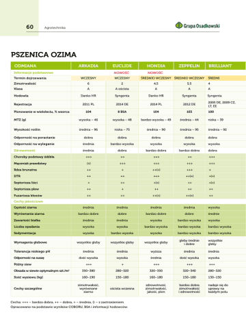 60 Agrotechnika pszenica OZIMa Odmiana ARKADIA Informacje podstawowe Termin dojrzewania EUCLIDE HONDIA NOWOŚĆ NOWOŚĆ ZEPPELIN wczesny wczesny Zimotrwałość 6 2 4,5 5,5 4 Klasa A A oścista A A A Danko HR Syngenta Danko HR Syngenta 2011 PL 2014 DE 2014 PL 2012 DE 104 8 BSA 104 103 MTZ [g] wysoka − 46 wysoka − 48 bardzo wysoka − 49 średnia − 44 niska − 39 Wysokość roślin średnia − 96 niska − 75 średnia − 90 średnia − 95 średnia − 92 Odporność na porastanie dobra dobra dobra dobra Odporność na wyleganie średnia bardzo wysoka wysoka wysoka Zdrowotność średnia dobra bardzo dobra bardzo dobra dobra +++ ++ +++ ++ +++ Mączniak prawdziwy (+) +++ +++ +++ +++ Rdza brunatna ++ + ++(+) +++ + DTR ++ ++ +++ ++(+) +(+) Septorioza liści + ++ +(+) ++ +(+) Septorioza plew ++ + ++ ++ ++ Fuzarioza kłosów ++ ++ ++(+) ++(+) ++ średnia średnia średnia średnia wysoka bardzo dobre dobre bardzo dobre dobre średnie Zawartość białka średnia średnia wysoka bardzo wysoka wysoka Liczba opadania wysoka wysoka bardzo wysoka bardzo wysoka bardzo wysoka Sedymentacja wysoka bardzo wysoka wysoka bardzo wysoka bardzo wysoka wszystkie gleby wszystkie gleby wszystkie gleby gleby średnie i dobre średnia średnia wyższa średnia średnia dość wysoka wysoka średnia dość wysoka wysoka +++ + +++ +++ Obsada w siewie optymalnym szt./m 350−380 280−320 320−350 320−340 280−320 Ilość wysiewu [kg] 160−190 150−180 160−180 150−180 130−150 Cechy szczególne zimotrwałość, wyrównane ziarno oścista wczesna zdrowotność, zimotrwałość, jakość, plon bardzo dobra zimotrwałość i zdrowotność Hodowla Rejestracja Plonowanie w wieloleciu, % wzorca Choroby podstawy źdźbła średnio wczesny średnio wczesny BRILLIANT średni Syngenta 2005 DE, 2009 CZ, LT, EE 100 dobra wysoka Cechy jakościowe Gęstość ziarna Wyrównanie ziarna Wymagania glebowe Tolerancja niskiego pH Odporność na suszę Późny siew 2 Cecha: +++ – bardzo dobra, ++ – dobra, + – średnia, () – z zastrzeżeniem Opracowano na podstawie wyników COBORU, BSA i informacji hodowców. wszystkie gleby +++ nadaje się do uprawy na każdym polu Agrotechnika INFORMATOR GRUPY OSADKOWSKI • JESIEŃ 2015 PAMIER PRAKTIK JULIUS KWS LIVIUS KWS OZON 61 MEISTER KEPLER OSTROGA NOWOŚĆ średni średni średni średnio późny średnio późny średnio późny późny późny 4 4 5 3,5 4 1,5 2,5 6 A A A B B B A A oścista Syngenta RAGT KWS Lochow KWS Lochow KWS Lochow RAGT Nickerson Danko HR 2008 DE 2012 PL 2008 DE, 2011 LT, LV 2013 PL 2010 PL 2011 PL, 2010 DE 2010 PL 2008 PL 104 107 107 106 100 101 100 średnia − 40 wysoka − 45 bardzo wysoka − 47 wysoka − 46 wysoka − 46 wysoka − 46 bardzo wysoka − 48 średnioniska − 89 niska − 80 średnia − 95 średnia − 96 niska − 80 średnioniska − 88 niska − 81 średnia − 92 dobra dobra dobra dobra dobra bardzo dobra dobra bardzo dobra wysoka średnia średnia bardzo wysoka bardzo wysoka bardzo wysoka średnia dobra dobra bardzo dobra średnia bardzo dobra bardzo dobra bardzo dobra +++ +++ ++ +++ ++(+) +++ +++ +++ +++ ++ ++(+) ++ ++(+) ++ +++ + ++ ++(+) ++ ++ (+) ++ ++ ++ +++ ++ ++ ++ +++ ++ ++(+) +++ +++ ++ + ++ ++ + ++ ++ ++ ++ ++ +(+) ++ + ++ ++ ++ ++(+) ++ +(+) ++(+) ++ +++ +++ +++ bardzo wysoka średnia średnia średnia średnia średnia średnia dobre średnie bardzo dobre bardzo dobre bardzo dobre bardzo dobre bardzo dobre bardzo dobre wysoka średnia średnia wysoka niższa wysoka średnia wysoka bardzo wysoka bardzo wysoka bardzo wysoka bardzo wysoka bardzo wysoka bardzo wysoka bardzo wysoka średnia bardzo wysoka bardzo wysoka wysoka wysoka bardzo wysoka wysoka wysoka bardzo wysoka gleby średnie i dobre wszystkie gleby gleby średnie i dobre gleby średnie i dobre gleby zaopatrzone w wodę wszystkie gleby gleby średnie i dobre gleby średnie i dobre niższa średnia średnia niższa średnia średnia średnia średnia średnia dość wysoka średnia średnia niższa wysoka średnia średnia +++ +++ +++ ++ ++ ++ +++ 300−350 300−330 260−340 280−320 280−320 300−350 300−330 350−380 140−160 140−150 130−170 150−180 150−180 150−170 160−190 180−200 wysoki plon, odmiana na trudniejsze stanowiska zimotrwałość, dorodne ziarno rekordowy plon, dorodne ziarno wysoko plonująca, do intensywnej produkcji wysoki plon, wysoka jakość, grube ziarno wysoki plon, zdrowotność, grube ziarno zimotrwałość, jakość, oścista późna 103 średnia − 41 bardzo wysoka dobra średnia +++ tworzy piękny, zdrowy, wyrównany łan
