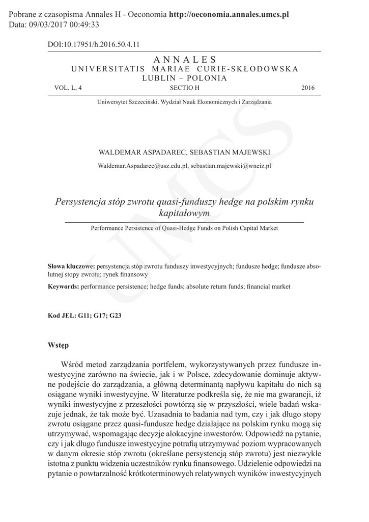 Pobrane z czasopisma Annales H - Oeconomia http://oeconomia.annales.umcs.pl Data: 09/03/2017 00:49:33 DOI:10.17951/h.2016.50.4.11 ANNALES U N I V E R S I TAT I S M A R I A E C U R I E - S K Ł O D O W S K A LU BLI N – P O L ONIA VOL. L, 4 SECTIO H 2016 CS Uniwersytet Szczeciński. Wydział Nauk Ekonomicznych i Zarządzania WALDEMAR ASPADAREC, SEBASTIAN MAJEWSKI [email protected], [email protected] M Persystencja stóp zwrotu quasi-funduszy hedge na polskim rynku kapitałowym Performance Persistence of Quasi-Hedge Funds on Polish Capital Market U Słowa kluczowe: persystencja stóp zwrotu funduszy inwestycyjnych; fundusze hedge; fundusze absolutnej stopy zwrotu; rynek finansowy Keywords: performance persistence; hedge funds; absolute return funds; financial market Kod JEL: G11; G17; G23 Wstęp Wśród metod zarządzania portfelem, wykorzystywanych przez fundusze inwestycyjne zarówno na świecie, jak i w Polsce, zdecydowanie dominuje aktywne podejście do zarządzania, a główną determinantą napływu kapitału do nich są osiągane wyniki inwestycyjne. W literaturze podkreśla się, że nie ma gwarancji, iż wyniki inwestycyjne z przeszłości powtórzą się w przyszłości, wiele badań wskazuje jednak, że tak może być. Uzasadnia to badania nad tym, czy i jak długo stopy zwrotu osiągane przez quasi-fundusze hedge działające na polskim rynku mogą się utrzymywać, wspomagając decyzje alokacyjne inwestorów. Odpowiedź na pytanie, czy i jak długo fundusze inwestycyjne potrafią utrzymywać poziom wypracowanych w danym okresie stóp zwrotu (określane persystencją stóp zwrotu) jest niezwykle istotna z punktu widzenia uczestników rynku finansowego. Udzielenie odpowiedzi na pytanie o powtarzalność krótkoterminowych relatywnych wyników inwestycyjnych Pobrane z czasopisma Annales H - Oeconomia http://oeconomia.annales.umcs.pl Data: 09/03/2017 00:49:33 12 WALDEMAR ASPADAREC, SEBASTIAN MAJEWSKI U M CS quasi-funduszy hedge działających na polskim rynku kapitałowym ma znaczenie poznawcze i aplikacyjne, ponieważ wspiera decyzje alokacyjne uczestników rynku finansowego. Dodatkowo badanie pokaże, czy najlepsze (najgorsze) quasi-fundusze hedge w pewnym okresie w przeszłości, w kolejnych okresach osiągały wyniki inwestycyjne mierzone stopą zwrotu, plasujące je na początku lub końcu rankingu wyników inwestycyjnych wszystkich quasi-funduszy hedge. Pozwoli to ocenić jakość zarządzania polskimi quasi-funduszami hedge. Celem niniejszego artykułu jest przedstawienie rezultatów badań odnoszących się do zjawiska persystencji stóp zwrotu funduszy inwestycyjnych w literaturze światowej oraz badanie tego zjawiska na rynku quasi-funduszy hedge funkcjonujących na polskim rynku w odniesieniu do autorskiego indeksu ARI-WIG (Absolute Return Index). Opracowanie składa się z trzech części. Po wprowadzeniu przedstawiono istotę oraz sposoby pomiaru persystencji stóp zwrotu funduszy inwestycyjnych oraz dokonano przeglądu literatury światowej i krajowej. W dalszej części natomiast przeprowadzono analizę podobieństw i różnic między funduszami absolutnej stopy zwrotu a klasycznymi funduszami hedge. Wybór tego rodzaju funduszy był determinowany tym, że fundusze te charakteryzują się aktywnym podejściem do zarządzania kapitałem. Ponadto przedstawiono metodologię badania persystencji stóp zwrotu quasi-funduszy hedge oraz przeprowadzono badanie dla quasi-funduszy hedge funkcjonujących na polskim rynku kapitałowym w latach 2005–2015. W zakończeniu zaprezentowano wnioski z przeprowadzonej analizy i wskazano jej znaczenie dla uczestników polskiego rynku kapitałowego. Według wiedzy autorów jest to pierwsze tego rodzaju badanie na rynku quasi-funduszy hedge w Polsce. Postawiono hipotezę, że w przypadku polskich quasi-funduszy hedge występuje efekt persystencji, a indeks ARI doskonale obrazuje to zjawisko. 1. Definiowanie, istota oraz miary persystencji stóp zwrotu funduszy Persystencja stóp zwrotu (performance persistence) to zjawisko wpływające na rozwój rynku funduszy inwestycyjnych polegające na utrzymywaniu się ich wyników inwestycyjnych. Zjawisko to determinuje możliwość przewidywania stóp zwrotu funduszy, co w szczególny sposób wpływa na decyzje alokacyjne na rynku funduszy inwestorów i zarządzających funduszem, którzy chcą osiągnąć ponadprzeciętne wyniki inwestycyjne. W literaturze stwierdza się, że wyniki funduszy inwestycyjnych utrzymują się, jeśli [Perez, 2012, s. 82]: − fundusze mające w jednym okresie niską lub ujemną rentowność (stopy zwrotu) osiągają takie same wyniki w kolejnym okresie; fundusze te są nazywane przegranymi i utrzymują niskie miejsca w rankingach funduszy inwestycyjnych, − fundusze mające w jednym okresie wysoką rentowność (stopy zwrotu) osiągają równie dobre wyniki inwestycyjne w kolejnym okresie; nazywa się je zwycięzcami i zajmują wysokie pozycje w rankingach inwestycyjnych. Pobrane z czasopisma Annales H - Oeconomia http://oeconomia.annales.umcs.pl Data: 09/03/2017 00:49:33 Persystencja stóp zwrotu quasi-funduszy hedge na polskim rynku kapitałowym 13 U M CS Persystencja stóp zwrotu nie występuje w wypadku funduszy, które po wypracowaniu w badanym okresie dodatnich (lub ujemnych) stóp zwrotu, z czego wynikało ich wysokie (lub niskie) miejsce w rankingu, w kolejnym okresie badawczym nie osiągają podobnych wyników inwestycyjnych, przez co ich miejsce w rankingu jest zupełnie inne niż we wcześniejszym okresie. W badaniu zjawiska persystencji wykorzystywane są stopy zwrotu funduszy inwestycyjnych. Do ich obliczania stosuje się miary dochodowości i efektywności zbudowane na podstawie modeli rynku kapitałowego CAPM i APT, wywodzące się z klasycznej teorii portfela Markowitza. Najczęściej przyjmowaną miarą oceny jakości działań zarządzającego portfelem inwestycyjnym jest wskaźnik alfa Jensena. Zarządzający funduszem hedge koncentruje się na 