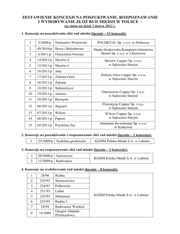 ZESTAWIENIE KONCESJI NA POSZUKIWANIE, ROZPOZNAWANIE I WYDOBYWANIE ZŁÓś RUD MIEDZI W POLSCE wg stanu na dzień 1 marca 2012 r. 1. Koncesje na poszukiwanie złóŜ rud miedzi (łącznie – 15 koncesji): 1 5/2008/p Niemstów-Wielowieś 2 48/2010/p Iłowa i Bolesławiec 3 6/2011/p 4 14/2011/p Mozów-2 5 15/2011/p Mozów-1 6 16/2011/p Jany 7 17/2011/p Zielona Góra 8 58/2011/p Zatonie 9 18/2011/p Sulmierzyce 10 19/2011/p Janowo 11 20/2011/p Borzęcin 12 66/2011/p Stęszew 13 67/2011/p Wilcze 14 68/2011/p Paproć 15 65/2011/p Peryklina śar Osiecznica-Nowiny POLMETAL Sp. z o.o. w Dobieszu Śląsko Krakowska Kompania Górnictwa Metali Sp. z o.o. w Libertowie Mozów Copper Sp. z o.o. w Sękocinie Starym Zielona Góra Copper Sp. z o.o. w Sękocinie Starym Ostrzeszów Copper Sp. z o.o. w Sękocinie Starym Florentyna Copper Sp. z o.o. w Sękocinie Starym Wilcze Copper Sp. z o.o. w Sękocinie Starym Amarante Investments Sp. z o.o. w Krakowie 2. Koncesje na poszukiwanie i rozpoznawanie złóŜ rud miedzi (łącznie – 1 koncesja): 1 23/2009/p Synklina grodziecka KGHM Polska Miedź S.A. w Lubinie 3. Koncesje na rozpoznawanie złóŜ rud miedzi (łącznie – 2 koncesje): 1 20/2008/p Gaworzyce 2 13/2009/p Radwanice KGHM Polska Miedź S.A. w Lubinie 4. Koncesje na wydobywanie rud miedzi (łącznie – 8 koncesji): 1 24/96 Rudna 2 235/93 Sieroszowice 3 234/93 Polkowice 4 231/93 Lubin 5 232/93 Małomice 6 233/93 Rudna I 7 10/95 8 16/2004 Radwanice Wschód Głogów GłębokiPrzemysłowy KGHM Polska Miedź S.A. w Lubinie *** ZESTAWIENIE KONCESJI NA POSZUKIWANIE, ROZPOZNAWANIE I WYDOBYWANIE ZŁÓś RUD CYNKU I OŁOWIU W POLSCE wg stanu na dzień 1 marca 2011 r. 1. Koncesje na poszukiwanie i rozpoznawanie złóŜ rud cynku i ołowiu (łącznie – 3 koncesje): 1 26/2010/p 2 34/2010/p 3 1/2012/p Zawiercie I, Zawiercie II, RodakiRokitno Szlacheckie Zawiercie I, Marciszów Rathdowney Polska Sp. z o.o. w Krakowie Laski Zakłady Górniczo-Hutnicze "Bolesław" S.A. w Bukownie 2. Koncesje na wydobywanie rud cynku i ołowiu (łącznie – 3 koncesje): 1 8/2003 Olkusz-część złoŜa 2 172/93 Pomorzany 3 1/2009 Klucze I Zakłady Górniczo-Hutnicze "Bolesław" S.A. w Bukownie *** ZESTAWIENIE KONCESJI NA POSZUKIWANIE, ROZPOZNAWANIE I WYDOBYWANIE ZŁÓś KRUSZYWA NATURALNEGO W POLSCE wg stanu na dzień 1 marca 2011 r. 1. Koncesje na wydobywanie kruszywa naturalnego (łącznie – 2 koncesje): 1 2 6/92 Ławica SłupskaBałtyk Południowy Przedsiębiorstwo Robót Czerpalnych i Podwodnych Sp. z o.o. w Gdańsku 3/2006 Południowa Ławica Środkowa-Bałtyk Południowy BALTEX - InŜynieria i Górnictwo Morskie Sp. z o.o. w Gdyni *** ZESTAWIENIE KONCESJI NA POSZUKIWANIE, ROZPOZNAWANIE I WYDOBYWANIE ZŁÓś RUD POLIMETALICZNYCH W POLSCE wg stanu na dzień 1 marca 2011 r. 1. Koncesje na poszukiwanie złóŜ rud polimetalicznych (łącznie – 1 koncesja): 1 43/2011/p Leśna – Gryfów Śląski European Resources Polska Sp. z o.o. w Wołowie 2. Koncesje na poszukiwanie i rozpoznawanie złóŜ rud polimetalicznych (łącznie – 2 koncesje): 1 5/2006/p Myszków-śarki 2 29/2007/p Radzimowice Śląsko Krakowska Kompania Górnictwa Metali Sp. z o.o. w Libertowie "GEPCO Geologia i Ochrona Środowiska” Sp. z o.o. w Warszawie *** ZESTAWIENIE KONCESJI NA POSZUKIWANIE, ROZPOZNAWANIE I WYDOBYWANIE ZŁÓś TYTANU W POLSCE na dzień 1 marca 2011 r. 1. Koncesje na poszukiwanie i rozpoznawanie złóŜ tytanu (łącznie – 1 koncesja): 1 42/2011/p Dolnośląskie Surowce Skalne S.A. w Warszawie Piława Dolna i Piława Górna 2. Koncesje na wydobywanie tytanu (łącznie – 0 koncesji): *** ZESTAWIENIE KONCESJI NA POSZUKIWANIE, ROZPOZNAWANIE I WYDOBYWANIE ZŁÓś SOLI KAMIENNEJ W POLSCE wg stanu na dzień 1 marca 2011 r. 1. Koncesje na rozpoznawanie złóŜ soli kamiennej (łącznie – 4 koncesje): 1 68/98/p Kazimierzów KGHM Polska Miedź S.A. w Lubinie 2 3/2006/p Mogilno I 3 21/2007/p SW część złoŜa Góra Inowrocławskie Kopalnie Soli "Solino" S.A. w Inowrocławiu 4 54/2009/p Goleniów PGNiG S.A. w Warszawie 2. Koncesje na wydobywanie soli kamiennej (łącznie – 3 koncesje): 1 1/2003 Mogilno I 2 4/2002 Góra 3 4/2004 Kłodawa Inowrocławskie Kopalnie Soli "Solino" S.A. w Inowrocławiu Kopalnia Soli „Kłodawa” S.A. w Kłodawie *** ZESTAWIENIE KONCESJI NA POSZUKIWANIE, ROZPOZNAWANIE I WYDOBYWANIE ZŁÓś GIPSU W POLSCE wg stanu na dzień 1 marca 2011 r. 1. Koncesje na poszukiwanie złóŜ gipsu (łącznie – 0 koncesji): 2. Koncesje na wydobywanie gipsu (łącznie – 2 koncesje): 1 36/96 Borków-Chwałowice 2 9/93 Leszcze Saint-Gobain Construction Products Polska Sp. z o.o. w Gliwicach Kopalnia Gipsu "Leszcze" S.A. w Leszczach *** ZESTAWIENIE KONCESJI NA POSZUKIWANIE, ROZPOZNAWANIE I WYDOBYWANIE ZŁÓś GIPSU I ANHYDRYTU W POLSCE wg stanu na dzień 1 marca 2011 r. 1. Koncesje na wydobywanie gipsu i anhydrytu (łącznie – 3 koncesje): 1 8/98 2 1/2002 3 6/2003 Lubichów Nowy Ląd-Pole Radłówka Nowy Ląd Kopalnia Gipsu i Anhydrytu "Nowy Ląd" Sp. z o.o. w Niwnicach *** ZESTAWIENIE KONCESJI NA POSZUKIWANIE, ROZPOZNAWANIE I WYDOBYWANIE ZŁÓś RUD NIKLU W POLSCE wg stanu na dzień 1 marca 2011 r. 1. Koncesje na poszukiwanie złóŜ rud niklu (łącznie – 0 koncesji): 2. Koncesje na rozpoznawanie złóŜ rud niklu (łącznie – 1 koncesja): 1 2/2006/p Szklary I KGHM Polska Miedź S.A. w Lubinie 3. Koncesje na poszukiwanie i rozpoznawanie złóŜ rud niklu (łącznie – 1 koncesja): 1 8/2007/p "GEPCO Geologia i Ochrona Środowiska” Sp. z o.o. w Warszawie rejon Szklar *** ZESTAWIENIE KONCESJI NA POSZUKIWANIE, ROZPOZNAWANIE I WYDOBYWANIE ZŁÓś SIARKI RODZIMEJ W POLSCE wg stanu na dzień 1 marca 2011 r. 1. Koncesje na wydobywanie siarki rodzimej (łącznie – 2 koncesje): 1 101/94 Osiek 2 16/94 Jeziórko-GrębówWydrza Kopalnie i Zakłady Chemiczne Siarki "Siarkopol" S.A. w Grzybowie Kopalnie i Zakłady Przetwórcze Siarki "Siarkopol" w likwidacji w Tarnobrzegu