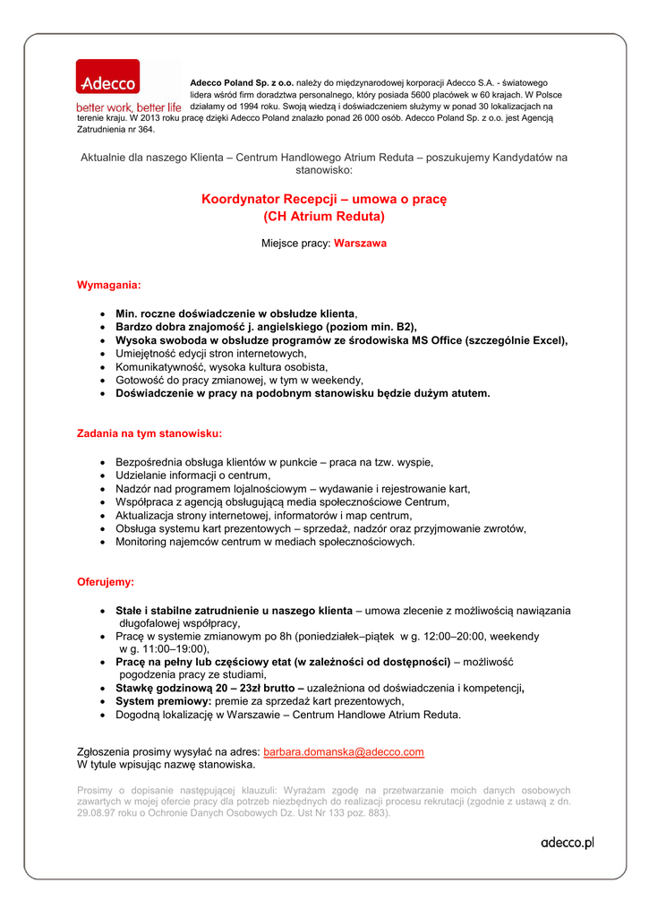 Adecco Poland Sp. z o.o. należy do międzynarodowej korporacji Adecco S.A. - światowego lidera wśród firm doradztwa personalnego, który posiada 5600 placówek w 60 krajach. W Polsce działamy od 1994 roku. Swoją wiedzą i doświadczeniem służymy w ponad 30 lokalizacjach na terenie kraju. W 2013 roku pracę dzięki Adecco Poland znalazło ponad 26 000 osób. Adecco Poland Sp. z o.o. jest Agencją Zatrudnienia nr 364. Aktualnie dla naszego Klienta – Centrum Handlowego Atrium Reduta – poszukujemy Kandydatów na stanowisko: Koordynator Recepcji – umowa o pracę (CH Atrium Reduta) Miejsce pracy: Warszawa Wymagania: Min. roczne doświadczenie w obsłudze klienta, Bardzo dobra znajomość j. angielskiego (poziom min. B2), Wysoka swoboda w obsłudze programów ze środowiska MS Office (szczególnie Excel), Umiejętność edycji stron internetowych, Komunikatywność, wysoka kultura osobista, Gotowość do pracy zmianowej, w tym w weekendy, Doświadczenie w pracy na podobnym stanowisku będzie dużym atutem. Zadania na tym stanowisku: Bezpośrednia obsługa klientów w punkcie – praca na tzw. wyspie, Udzielanie informacji o centrum, Nadzór nad programem lojalnościowym – wydawanie i rejestrowanie kart, Współpraca z agencją obsługującą media społecznościowe Centrum, Aktualizacja strony internetowej, informatorów i map centrum, Obsługa systemu kart prezentowych – sprzedaż, nadzór oraz przyjmowanie zwrotów, Monitoring najemców centrum w mediach społecznościowych. Oferujemy: Stałe i stabilne zatrudnienie u naszego klienta – umowa zlecenie z możliwością nawiązania długofalowej współpracy, Pracę w systemie zmianowym po 8h (poniedziałek–piątek w g. 12:00–20:00, weekendy w g. 11:00–19:00), Pracę na pełny lub częściowy etat (w zależności od dostępności) – możliwość pogodzenia pracy ze studiami, Stawkę godzinową 20 – 23zł brutto – uzależniona od doświadczenia i kompetencji, System premiowy: premie za sprzedaż kart prezentowych, Dogodną lokalizację w Warszawie – Centrum Handlowe Atrium Reduta. Zgłoszenia prosimy wysyłać na adres: [email protected] W tytule wpisując nazwę stanowiska. Prosimy o dopisanie następującej klauzuli: Wyrażam zgodę na przetwarzanie moich danych osobowych zawartych w mojej ofercie pracy dla potrzeb niezbędnych do realizacji procesu rekrutacji (zgodnie z ustawą z dn. 29.08.97 roku o Ochronie Danych Osobowych Dz. Ust Nr 133 poz. 883).