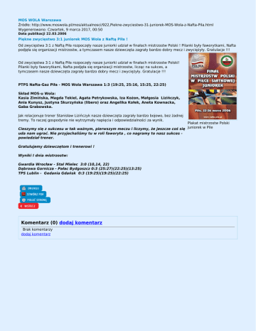 MOS WOLA Warszawa Źródło: http://www.moswola.pl/mos/aktualnosci/922,Piekne-zwyciestwo-31-juniorek-MOS-Wola-z-Nafta-Pila.html Wygenerowano: Czwartek, 9 marca 2017, 00:50 Data publikacji 22.03.2006 Piękne zwycięstwo 3:1 juniorek MOS Wola z Naftą Piła ! Od zwycięstwa 3:1 z Naftą Piła rozpoczęły nasze juniorki udział w finałach mistrzostw Polski ! Pilanki były faworytkami, Nafta podjęła się organizacji mistrzostw, a tymczasem nasze dziewczęta zagrały bardzo dobry mecz i zwyciężyły. Gratulacje !!! Od zwycięstwa 3:1 z Naftą Piła rozpoczęły nasze juniorki udział w finałach mistrzostw Polski! Pilanki były faworytkami, Nafta podjęła się organizacji mistrzostw, licząc na sukces, a tymczasem nasze dziewczęta zagrały bardzo dobry mecz i zwyciężyły. Gratulacje !!! PTPS Nafta-Gaz Piła - MOS Wola Warszawa 1:3 (19:25, 25:16, 15:25, 22:25) Skład MOS-u Wola: Kasia Zimińska, Magda Tekiel, Agata Petrykowska, Iza Kożon, Małgosia Lizińczyk, Ania Kunysz, Justyna Skurzyńska (libero) oraz Angelika Kołek, Aneta Kownacka, Gaba Grabowska. Jak relacjonuje trener Stanisław Lizińczyk nasze dziewczęta zagrały bardzo bojowo, bez żadnej tremy. To raczej gospodynie nie wytrzymały napięcia i odpowiedzialności za wynik. Plakat mistrzostw Polski Cieszymy się z sukcesu w tak ważnym, pierwszym meczu i liczymy, że jeszcze coś się juniorek w Pile uda nam ugrać. Nie przyjechaliśmy tu w roli faworyta , co nagramy to nasz sukces powiedział trener. Gratulujemy dziewczętom i trenerowi ! Wyniki I dnia mistrzostw: Gwardia Wrocław - Stal Mielec 3:0 (10,14, 22) Dąbrowa Gornicza - Pałac Bydgoszcz 0:3 (25:27)(22:25)(13:25) TPS Lublin - Gedania Gdańsk 0:3 (19:25)(19:25)(22:25) Komentarz (0) dodaj komentarz Brak komentarzy dodaj komentarz