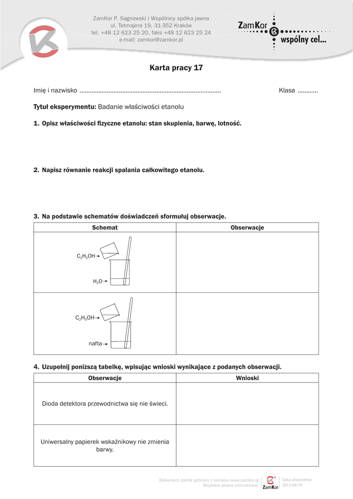 ZamKor P. Sagnowski i Wspólnicy spó³ka jawna ul. Tetmajera 19, 31-352 Kraków tel. +48 12 623 25 20, faks +48 12 623 25 24 e-mail: [email protected] wspólny cel... Karta pracy 17 Imię i nazwisko ................................................................................... Klasa ............ Tytuł eksperymentu: Badanie właściwości etanolu 1. Opisz właściwości fizyczne etanolu: stan skupienia, barwę, lotność. 2. Napisz równanie reakcji spalania całkowitego etanolu. 3. Na podstawie schematów doświadczeń sformułuj obserwacje. Schemat Obserwacje C2H5OH H2O C2H5OH nafta 4. Uzupełnij poniższą tabelkę, wpisując wnioski wynikające z podanych obserwacji. Obserwacje Wnioski Dioda detektora przewodnictwa się nie świeci. Uniwersalny papierek wskaźnikowy nie zmienia barwy. Dokument zosta³ pobrany z serwisu www.zamkor.pl Wszelkie prawa zastrze¿one. Data utworzenia: 2013-04-19 ZamKor P. Sagnowski i Wspólnicy spó³ka jawna ul. Tetmajera 19, 31-352 Kraków tel. +48 12 623 25 20, faks +48 12 623 25 24 e-mail: [email protected] wspólny cel... 5. Oceń poprawność poniższych zdań opisujących właściwości fizyczne i chemiczne etanolu. W pustą kolumnę wpisz literę P, jeżeli zdanie jest prawdziwe, lub literę F, jeżeli jest ono fałszywe. P/F A. Etanol jest bezbarwną cieczą o charakterystycznym zapachu. B. Etanol bardzo dobrze rozpuszcza się w wodzie oraz w nafcie. C. Etanol jest cieczą o dużej lotności, dlatego należy przechowywać go w zamkniętych naczyniach. D. Uniwersalny papierek wskaźnikowy w roztworze etanolu barwi się na kolor czerwony. E. Wodny roztwór etanolu przewodzi prąd elektryczny, co oznacza, że nie ulega procesowi dysocjacji elektrolitycznej. F. Etanol jest substancją łatwopalną. G. Kontrakcja to zjawisko, które występuje podczas mieszania się wody z etanolem. 6. Po dodaniu etanolu do probówki zawierającej białko jaja kurzego powstał biały, kłaczkowaty osad. Opisana przemiana jest zjawiskiem fizycznym czy reakcją chemiczną? Wybierz odpowiedź i jej uzasadnienie, zaznaczając właściwe pola. Jest to zjawisko fizyczne, A I białko ulega ścięciu i zmieniają się jego właściwości. II nie powstają nowe substancje, a jedynie zmienia się stan skupienia białka. ponieważ B Jest to reakcja chemiczna, 7. Jakie stężenie procentowe ma roztwór otrzymany po rozpuszczeniu 0,2 g jodu w 20 cm3 etanolu? Gęstość etanolu jest równa 0,79 g/cm3. Obliczenia: Odpowiedź: Dokument zosta³ pobrany z serwisu www.zamkor.pl Wszelkie prawa zastrze¿one. Data utworzenia: 2013-04-19