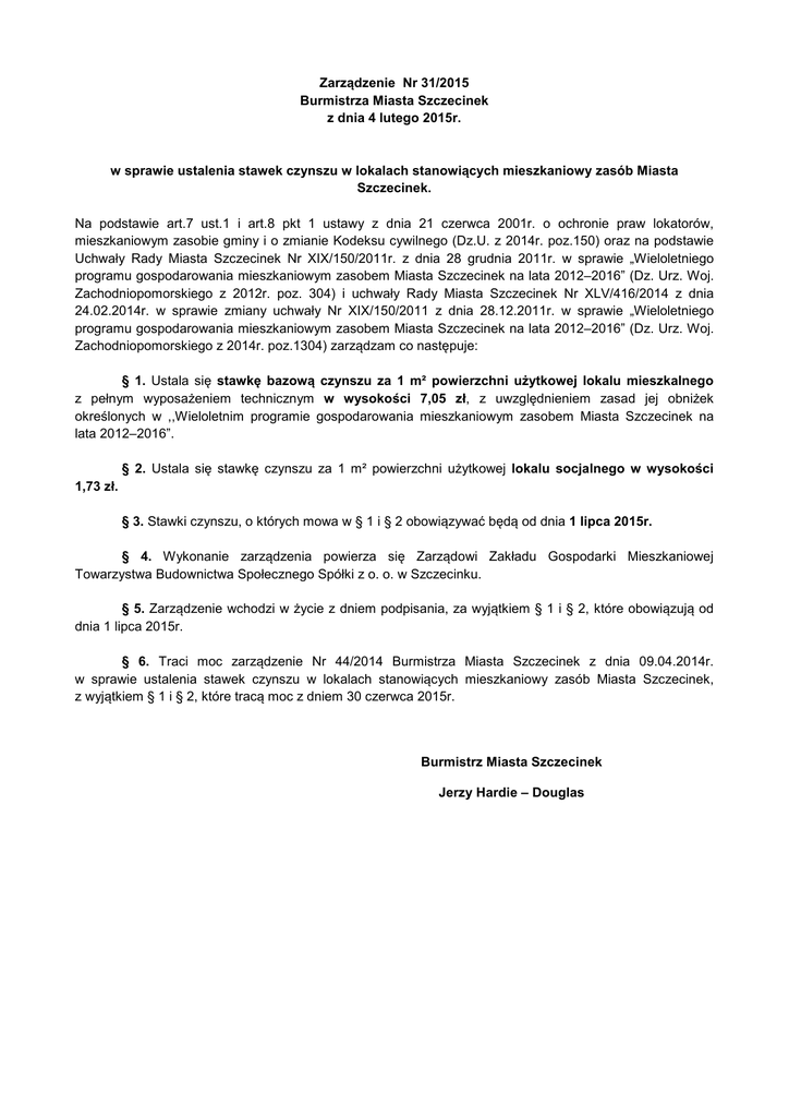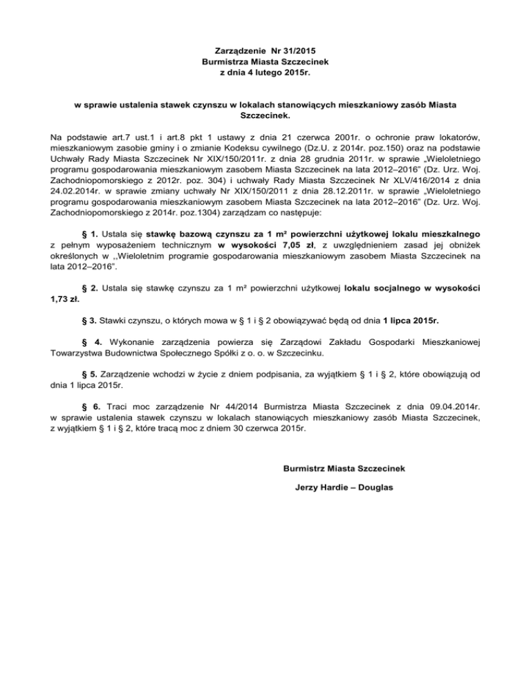 Zarządzenie Nr 31/2015 Burmistrza Miasta Szczecinek z dnia 4 lutego 2015r. w sprawie ustalenia stawek czynszu w lokalach stanowiących mieszkaniowy zasób Miasta Szczecinek. Na podstawie art.7 ust.1 i art.8 pkt 1 ustawy z dnia 21 czerwca 2001r. o ochronie praw lokatorów, mieszkaniowym zasobie gminy i o zmianie Kodeksu cywilnego (Dz.U. z 2014r. poz.150) oraz na podstawie Uchwały Rady Miasta Szczecinek Nr XIX/150/2011r. z dnia 28 grudnia 2011r. w sprawie „Wieloletniego programu gospodarowania mieszkaniowym zasobem Miasta Szczecinek na lata 2012–2016” (Dz. Urz. Woj. Zachodniopomorskiego z 2012r. poz. 304) i uchwały Rady Miasta Szczecinek Nr XLV/416/2014 z dnia 24.02.2014r. w sprawie zmiany uchwały Nr XIX/150/2011 z dnia 28.12.2011r. w sprawie „Wieloletniego programu gospodarowania mieszkaniowym zasobem Miasta Szczecinek na lata 2012–2016” (Dz. Urz. Woj. Zachodniopomorskiego z 2014r. poz.1304) zarządzam co następuje: § 1. Ustala się stawkę bazową czynszu za 1 m² powierzchni użytkowej lokalu mieszkalnego z pełnym wyposażeniem technicznym w wysokości 7,05 zł, z uwzględnieniem zasad jej obniżek określonych w ,,Wieloletnim programie gospodarowania mieszkaniowym zasobem Miasta Szczecinek na lata 2012–2016”. § 2. Ustala się stawkę czynszu za 1 m² powierzchni użytkowej lokalu socjalnego w wysokości 1,73 zł. § 3. Stawki czynszu, o których mowa w § 1 i § 2 obowiązywać będą od dnia 1 lipca 2015r. § 4. Wykonanie zarządzenia powierza się Zarządowi Zakładu Gospodarki Mieszkaniowej Towarzystwa Budownictwa Społecznego Spółki z o. o. w Szczecinku. § 5. Zarządzenie wchodzi w życie z dniem podpisania, za wyjątkiem § 1 i § 2, które obowiązują od dnia 1 lipca 2015r. § 6. Traci moc zarządzenie Nr 44/2014 Burmistrza Miasta Szczecinek z dnia 09.04.2014r. w sprawie ustalenia stawek czynszu w lokalach stanowiących mieszkaniowy zasób Miasta Szczecinek, z wyjątkiem § 1 i § 2, które tracą moc z dniem 30 czerwca 2015r. Burmistrz Miasta Szczecinek Jerzy Hardie – Douglas