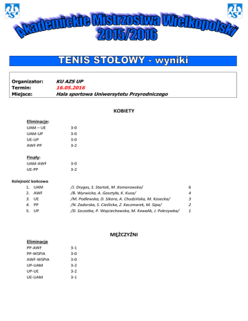 Organizator: Termin: Miejsce: KU AZS UP 16.05.2016 Hala sportowa Uniwersytetu Przyrodniczego KOBIETY Eliminacje: UAM – UE UAM-UP UE-UP AWF-PP 3-0 3-0 3-0 3-2 Finały: UAM-AWF UE-PP Kolejność koocowa 1. UAM 2. AWF 3. UE 4. PP 5. UP 3-0 3-2 /J. Drygas, S. Startek, M .Komorowska/ /B. Wyrwicka, A. Gosztyła, K. Kusa/ /M. Podlewska, D. Sikora, A. Chudzińska, M. Kosecka/ /N. Zadorska, S. Cieślicka, Z. Kaczmarek, M. Sipa/ /D. Szczotka, P. Wojciechowska, M. Kowalik, J. Pokrzywka/ MĘŻCZYŹNI Eliminacje PP-AWF PP-WSPiA AWF-WSPiA UP-UAM UP-UE UE-UAM 3-1 3-0 3-0 3-2 3-2 3-1 6 4 3 2 1 Finały PP-UP AWF-UE UAM-WSPiA Kolejność koocowa 1. PP 2. UP 3. AWF 4. UE 5. UAM 6. WSPiA 3-2 3-1 3-0 /M. Krawczyk, M. Chudy, M. Nowak, D. Troszczyński/ /A. Spychała, P. Kazimirski, H. Nowak, D. Komorowski, A. Ratajczak/ /J. Cembrowicz, K. Rosiński, D. Krzyśka, Sz. Galas/ /P. Sawicki, A. Jachimowicz, D. Wiankowski/ /T. Gush, K. Flieger, G. Waloszczyk/ /K. Hejne, P. Batura, M.Teszner/ Klasyfikacja Generalna po 3 rzutach kobiet: 1. 2. 3. 5. 6. Uniwersytet im. Adama Mickiewicza Akademia Wychowania Fizycznego Politechnika Poznaoska Uniwersytet Ekonomiczny Uniwersytet Przyrodniczy Wyższa Szkoła Pedagogiki i Administracji Wyższa Szkoła Edukacji i Terapii 20 15 11 11 6 2 2 Klasyfikacja Generalna po 3 rzutach mężczyzn: 1. 2. 3. 5. 6. Politechnika Poznaoska Uniwersytet Przyrodniczy Akademia Wychowania Fizycznego Uniwersytet im. Adama Mickiewicza Uniwersytet Ekonomiczny Wyższa Szkoła Pedagogiki i Administracji 19 13 12 12 7 3 7 5 4 3 2 1