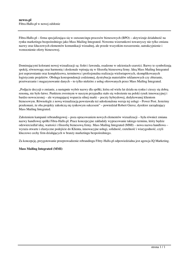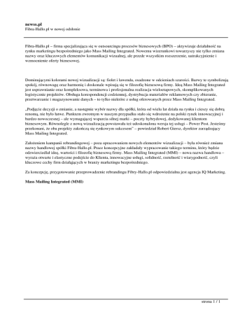 newss.pl Fibra-Hallo.pl w nowej odsłonie Fibra-Hallo.pl – firma specjalizująca się w outsourcingu procesów biznesowych (BPO) – aktywizuje działalność na rynku marketingu bezpośredniego jako Mass Mailing Integrated. Nowemu wizerunkowi towarzyszy nie tylko zmiana nazwy oraz kluczowych elementów komunikacji wizualnej, ale przede wszystkim rozszerzenie, uatrakcyjnienie i wzmocnienie oferty biznesowej. Dominującymi kolorami nowej wizualizacji są: fiolet i lawenda, osadzone w odcieniach szarości. Barwy te symbolizują spokój, równowagę oraz harmonię i doskonale wpisują się w filozofię biznesową firmy. Ideą Mass Mailing Integrated jest usprawnianie oraz kompleksowa, terminowa i profesjonalna realizacja wieloetapowych, skomplikowanych logistycznie projektów. Obsługa korespondencji codziennej, dystrybucja materiałów reklamowych czy zbieranie, przetwarzanie i magazynowanie danych – to tylko niektóre z usług oferowanych przez Mass Mailing Integrated. „Podjęcie decyzji o zmianie, a następnie wybór nazwy dla spółki, która od wielu lat działa na rynku i cieszy się dobrą renomą, nie było łatwe. Punktem zwrotnym w naszym przypadku stało się wdrożenie na polski rynek innowacyjnej i bardzo nowoczesnej – ale wymagającej wsparcia silnej marki – poczty hybrydowej, dedykowanej klientom biznesowym. Równolegle z nową wizualizacją powstawała też udoskonalona wersja tej usługi – Power Post. Jesteśmy przekonani, że oba projekty zakończą się rynkowym sukcesem” – powiedział Robert Giersz, dyrektor zarządzający Mass Mailing Integrated. Założeniem kampanii rebrandingowej – poza opracowaniem nowych elementów wizualizacji – była również zmiana nazwy handlowej spółki Fibra-Hallo.pl. Prace koncepcyjne zakładały wypracowanie takiego terminu, który będzie odzwierciedlał ideę, wartości i filozofię biznesową firmy. Mass Mailing Integrated (MMI) – nowa nazwa handlowa – wyraża otwarte i elastyczne podejście do Klienta, innowacyjne usługi, solidność, rzetelność i wiarygodność, czyli kluczowe cechy firm działąjących w branży marketingu bezpośredniego. Za koncepcję, przygotowanie przeprowadzenie rebrandingu Fibry-Hallo.pl odpowiedzialna jest agencja IQ Marketing. Mass Mailing Integrated (MMI) strona 1 / 1