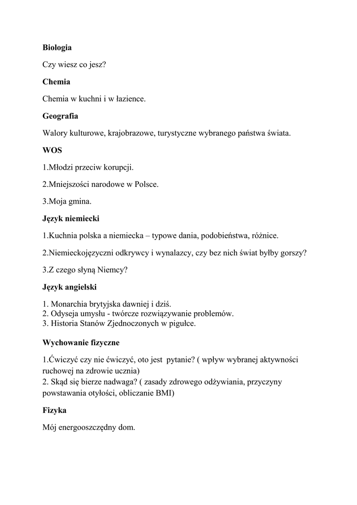Biologia Czy wiesz co jesz? Chemia Chemia w kuchni i w łazience. Geografia Walory kulturowe, krajobrazowe, turystyczne wybranego państwa świata. WOS 1.Młodzi przeciw korupcji. 2.Mniejszości narodowe w Polsce. 3.Moja gmina. Język niemiecki 1.Kuchnia polska a niemiecka – typowe dania, podobieństwa, różnice. 2.Niemieckojęzyczni odkrywcy i wynalazcy, czy bez nich świat byłby gorszy? 3.Z czego słyną Niemcy? Język angielski 1. Monarchia brytyjska dawniej i dziś. 2. Odyseja umysłu - twórcze rozwiązywanie problemów. 3. Historia Stanów Zjednoczonych w pigułce. Wychowanie fizyczne 1.Ćwiczyć czy nie ćwiczyć, oto jest pytanie? ( wpływ wybranej aktywności ruchowej na zdrowie ucznia) 2. Skąd się bierze nadwaga? ( zasady zdrowego odżywiania, przyczyny powstawania otyłości, obliczanie BMI) Fizyka Mój energooszczędny dom. Język polski Włącz się – Młodzi i media. Religia 1.Spacer po Jerozolimie- miejscu kultu i pielgrzymek. 2. Sanktuaria Maryjne Śląska. Zajęcia techniczne 1. Jak udzielić I pomocy w nagłych wypadkach? 2. Ścieżki rowerowe jako sposób na poznanie najbliższej okolicy – prezentacje multimedialne uwzględniające trasy, ciekawe miejsca oraz przepisy dotyczące rowerzystów. 3. Kto ma pierwszeństwo - wykonanie gry planszowej uwzględniającej znaki i sygnały drogowe. Historia 1.Obraz rodziny na przestrzeni wieków. 2.Historia przez pryzmat życia jednostek - kobiety sukcesu – królowa Bona, Maria Skłodowska – Curie... 3.Jak ubierali się nasi przodkowie ? Przeszłość i teraźniejszość. 4.Menu mieszkańca dawnej Europy. Jak się odżywiano w dawnych wiekach?
