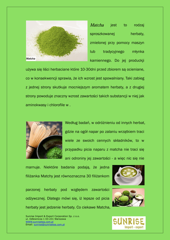 Matcha jest to sproszkowanej rodzaj herbaty, zmielonej przy pomocy maszyn lub Matcha tradycyjnego młynka kamiennego. Do jej produckji używa się liści herbaciane które 10-30dni przed zbiorem są ocieniane, co w konsekwencji sprawia, że ich wzrost jest spowalniany. Taki zabieg z jednej strony skutkuje mocniejszym aromatem herbaty, a z drugiej strony powoduje znaczny wzrost zawartości takich substancji w niej jak aminokwasy i chlorofile w . Według badań, w odróżnieniu od innych herbat, gdzie na ogół napar po zalaniu wrzątkiem traci wiele ze swoich cennych składników, to w przypadku picia naparu z matcha nie traci się ani odroniny jej zawartości - a więc nic się nie marnuje. Niektóre badania podają, że jedna filiżanka Matchy jest równoznaczna 30 filiżankom parzonej herbaty pod względem zawartości odżywcznej. Dlatego mówi się, iż lepsze od picia herbaty jest jedzenie herbaty. Co ciekawe Matcha, Sunrise Import & Export Corporation Sp. z o.o. ul. Odlewnicza 1 03-231 Warszawa WWW.sunrisetea.com.pl Email: [email protected] oprócz tego, że można z niej zrobić napar, posiada jeszcze wiele innych zastosowań, jak na przykład używana jest jako składnik do ciast, lodów, napojów, suplementów diety, kosmetyków, itd. Matcha nie zawiera konserwatów ani sztucznych barwników, przez co idealnie nadaje się jako dodatek do potraw, zdrowych produktów czy żywności ekologicznej. Sunrise Import & Export Corporation Sp. z o.o. ul. Odlewnicza 1 03-231 Warszawa WWW.sunrisetea.com.pl Email: [email protected]