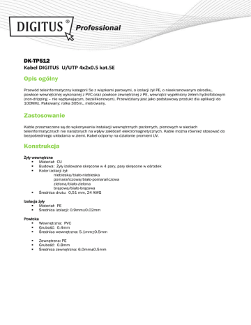 DK-TP512 Kabel DIGITUS U/UTP 4x2x0.5 kat.5E Opis ogólny Przewód teleinformatyczny kategorii 5e z wiązkami parowymi, o izolacji żył PE, o nieekranowanym ośrodku, powłoce wewnętrznej wykonanej z PVC oraz powłoce zewnętrznej z PE, wewnątrz wypełniony żelem hydrofobowym (non-dripping – nie wypływającym, bezsilikonowym). Przewidziany jest jako podstawowy produkt dla aplikacji do 100MHz. Pakowany: rolka 305m., metrowany. Zastosowanie Kable przeznaczone są do wykonywania instalacji wewnętrznych poziomych, pionowych w sieciach teleinformatycznych nie narażonych na wpływ zakłóceń elektromagnetycznych. Kable można również stosować do bezpośredniego układania w ziemi. Kabel odporny na działanie promieni UV. Konstrukcja Żyły wewnętrzne Materiał: CU Budowa: Żyły izolowane skręcone w 4 pary, pary skręcone w ośrodek Kolor izolacji żył: niebieska/biało-niebieska pomarańczowa/biało-pomarańczowa zielona/biało-zielona brązowa/biało-brązowa Średnica drutu: 0,51 mm, 24 AWG Izolacja żyły Materiał: PE Średnica izolacji: 0.9mm±0.02mm Powłoka Wewnętrzna: PVC Grubość: 0.4mm Średnica wewnętrzna: 5.1mm±0.5mm Zewnętrzna: PE Grubość: 0.8mm Średnica zewnętrzna: 6.0mm±0.5mm Dane techniczne Impedancja falowa ( Ω ): 100±15 Ohm @ 1-250 MHz Asymetria pojemności względem ziemi (max): 1600 pF/km Szybkość propagacji (f>1MHz): 66 % Max. napięcie pracy: 300 V (RMS) Zakres temperatur st. C Podczas pracy : -20 ÷ +70 Podczas układania: 0 ÷ +50 Przystosowanie do standardu: EIA/TIA5668B Certyfikat ROHS Częstotliwość (MHz) 1 4 10 16 20 25 31,25 62,5 100 POZOSTAŁE PARAMETRY TRANSMISYJNE Współczynnik Tłumienność NEXT PSNEXT tłumienia (dB) (dB/100m) (dB) (dB) 20,0 23,0 25,0 25,0 25,0 24,3 23,6 21,5 20,1 2,04 4,10 6,50 8,20 9,30 10,40 11,70 17,00 22,00 65,3 56,3 50,3 47,2 45,8 44,3 42,9 38,4 35,3 62,3 53,3 47,3 44,2 42,0 41,3 39,9 35,4 32,3 ELFEXT (dB) PSELFEXT (dB) 63,8 51,8 43,8 39,7 37,8 35,8 33,9 27,9 23,8 60,8 48,8 40,8 36,7 34,8 32,8 30,9 24,9 20,8